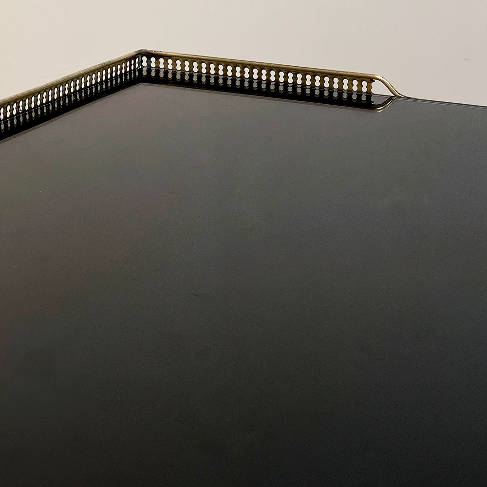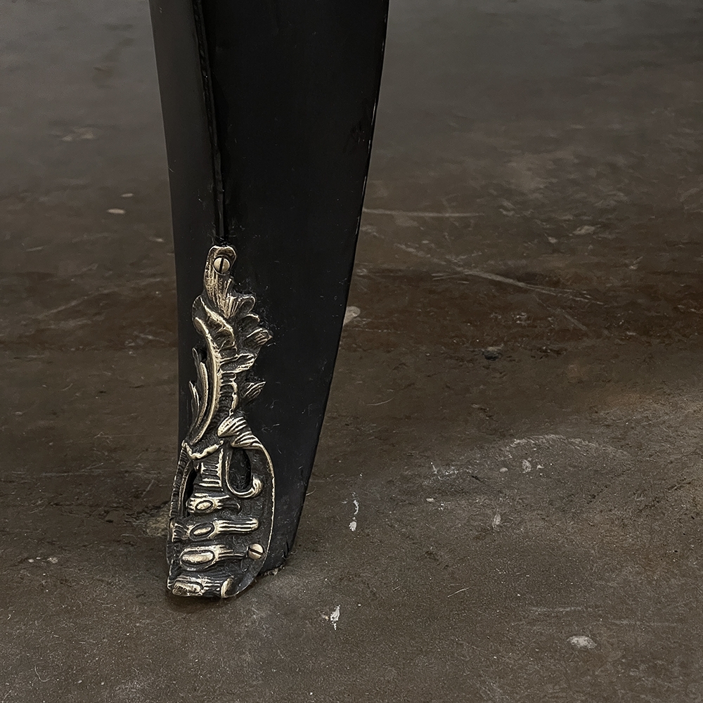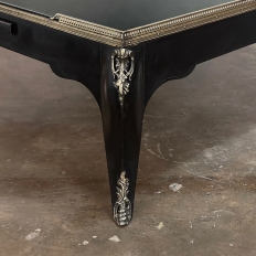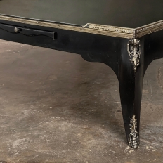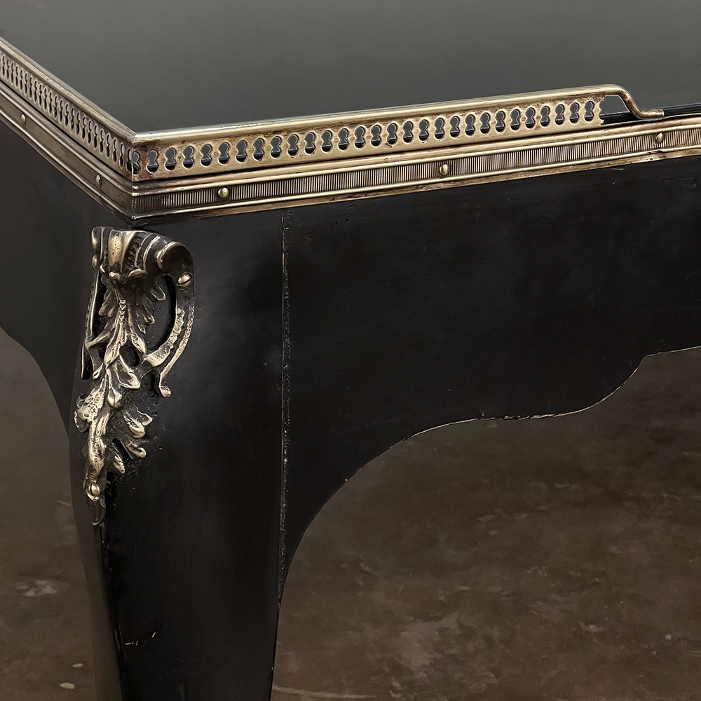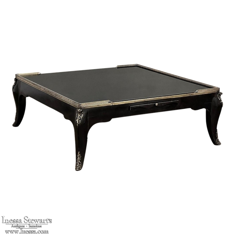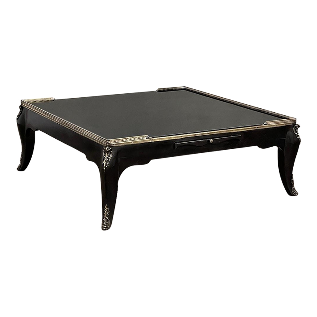 SaleGrand Mid-Century French Black Enamel Coffee Table with Glass Top is perfect for a large family room! Square in shape, it features a 2400 square inch glass top surface for carefree entertaining and daily use. The glass is held in place by a solid brass gallery rail all around the perimeter. The brass is accompanied by brass decorative mounts on the elegantly scrolled legs at each corner which depict stylized shell and foliate designs. Two convenient pull-out surfaces fitted with brass knobs add even more surface area for big families or large parties. Finished all around, it has been coated in black enamel for a timeless look.