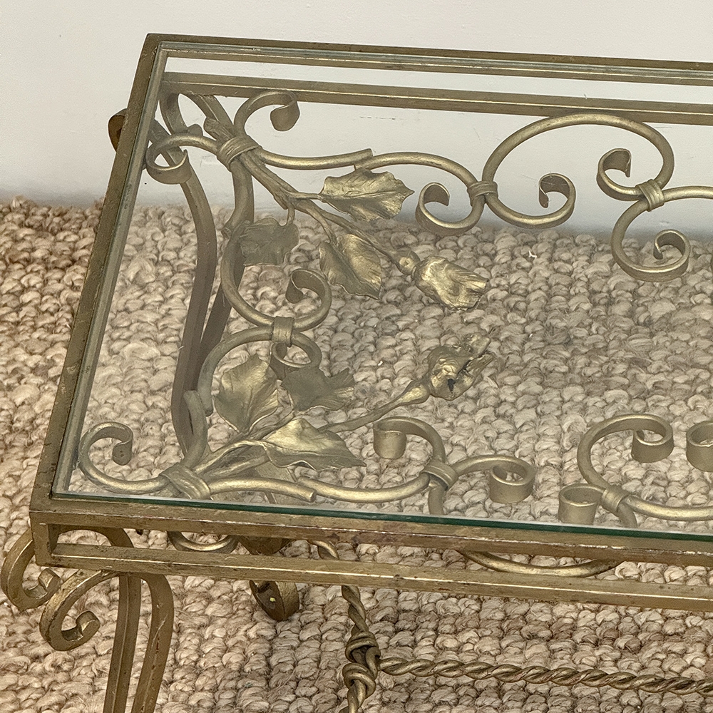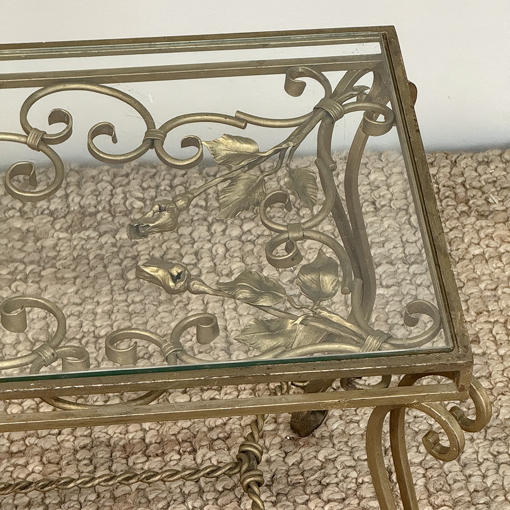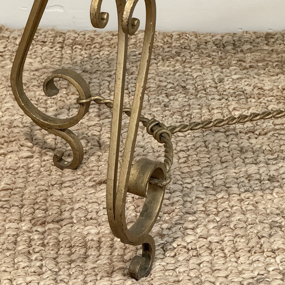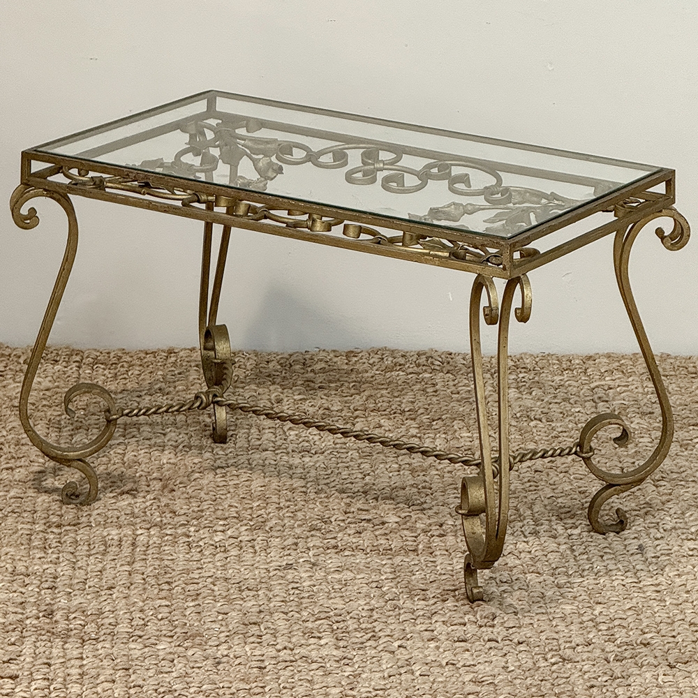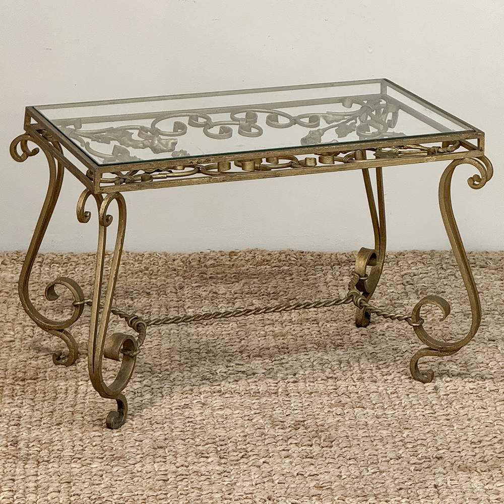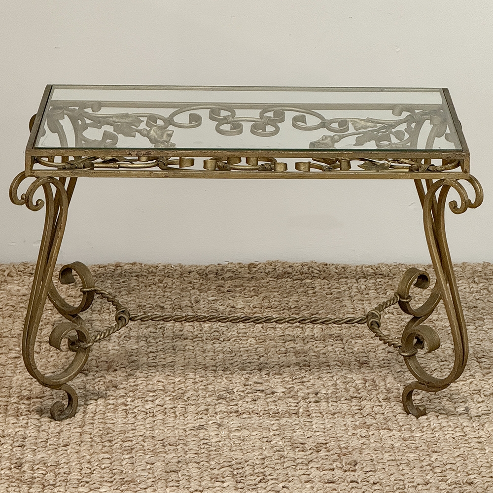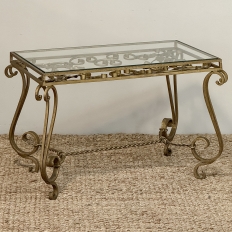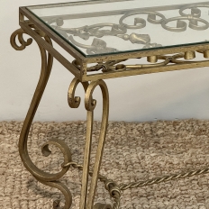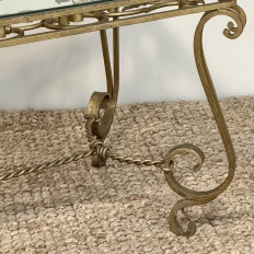 Mid-Century Wrought Iron & Glass Coffee Table combines visual charm with excellent functionality to create the perfect table for your family or entertaining room. The glass top is ideal for all beverages, and is set on top in a kind of shadow box effect with the framework underneath elaborately scrolled for visual appeal. Four double-scrolled legs connected with a stretcher below provide support, with all the iron painted a patinaed gold color for a little subdued bling.