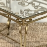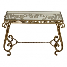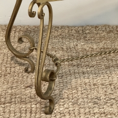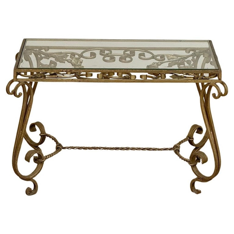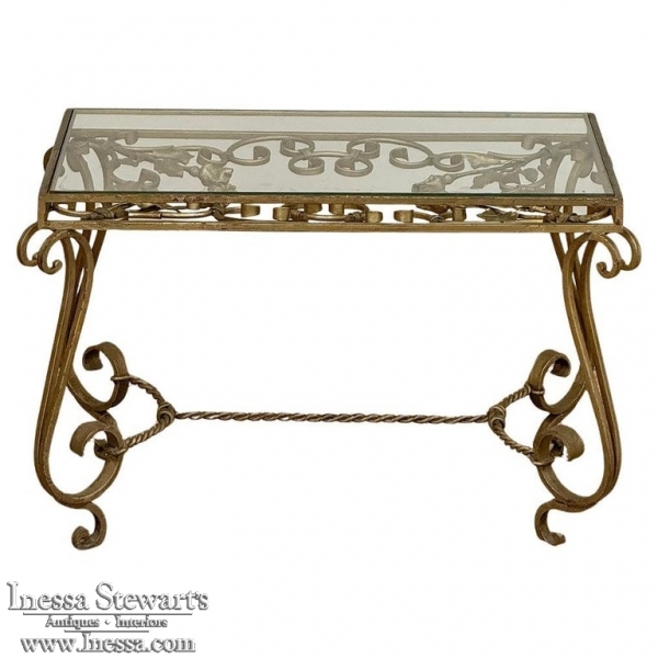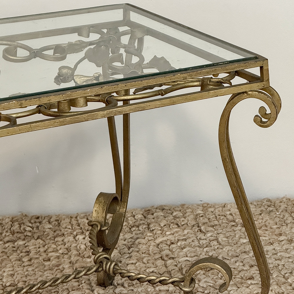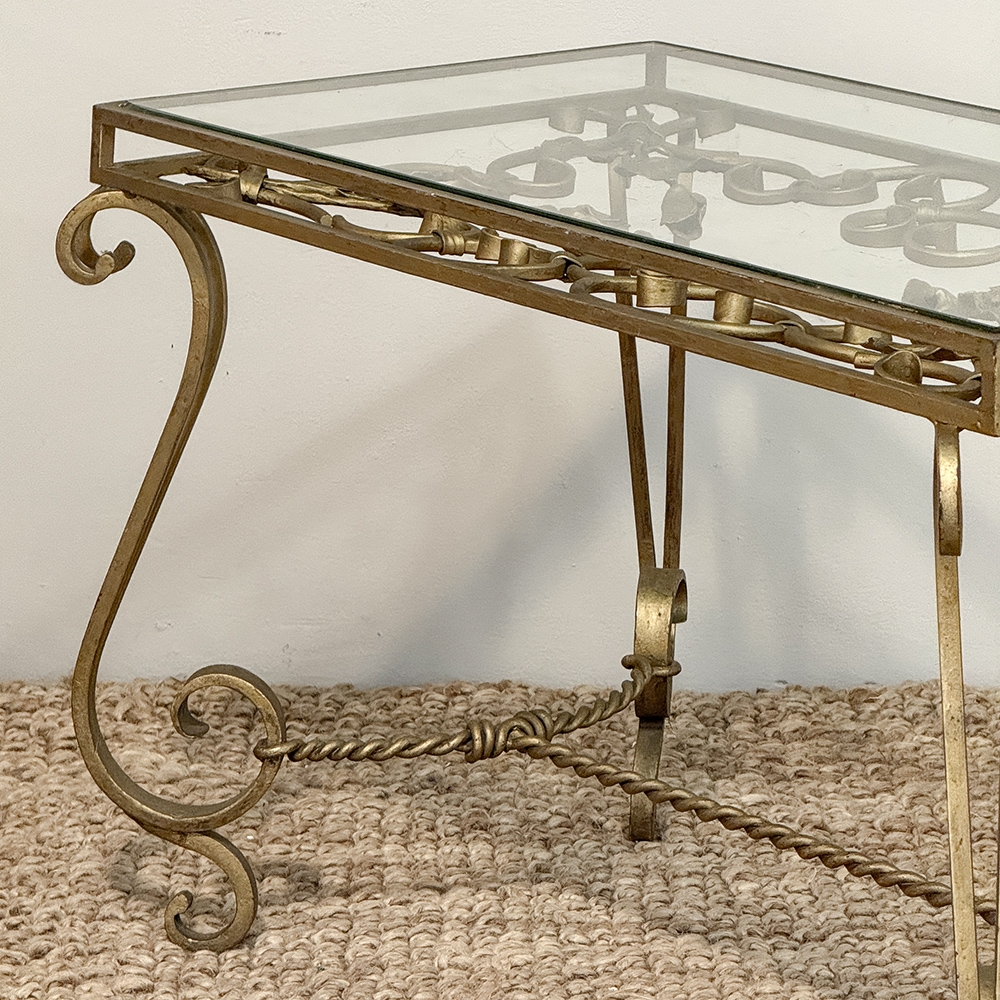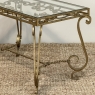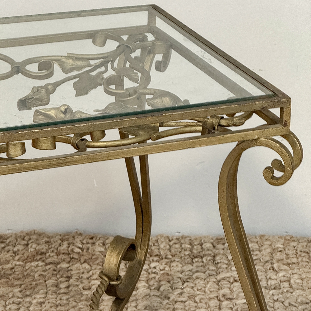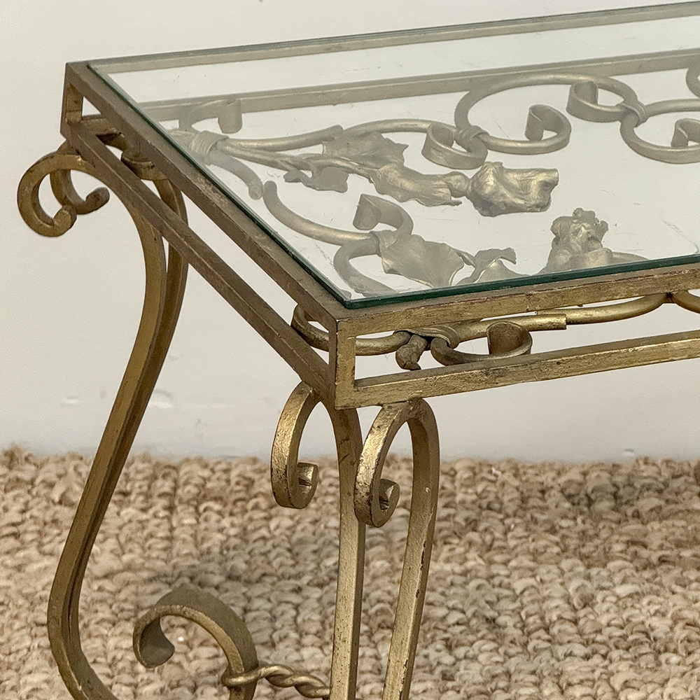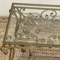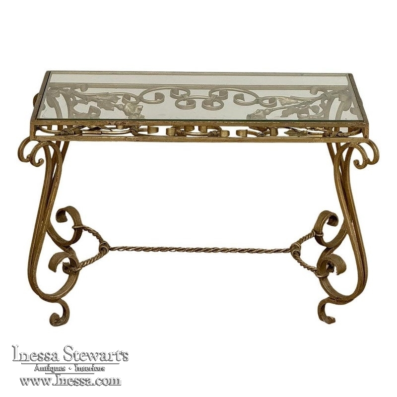 Mid-Century Wrought Iron & Glass Coffee Table combines visual charm with excellent functionality to create the perfect table for your family or entertaining room. The glass top is ideal for all beverages, and is set on top in a kind of shadow box effect with the framework underneath elaborately scrolled for visual appeal. Four double-scrolled legs connected with a stretcher below provide support, with all the iron painted a patinaed gold color for a little subdued bling.