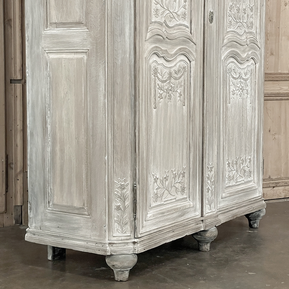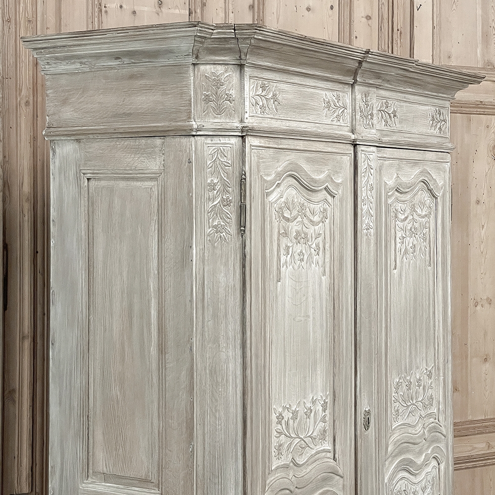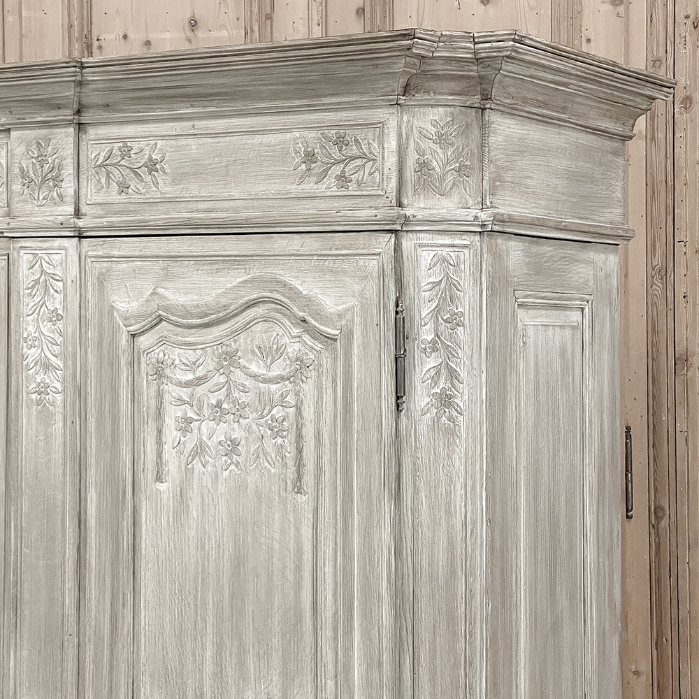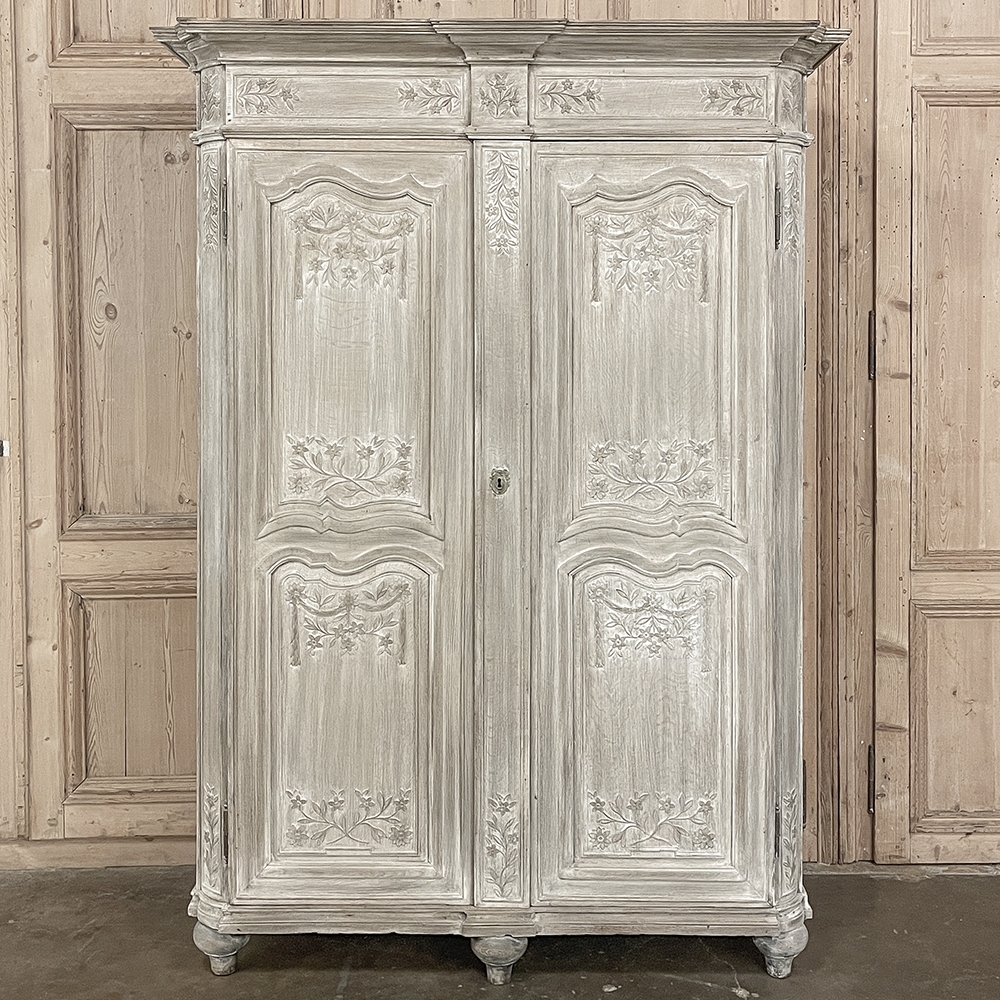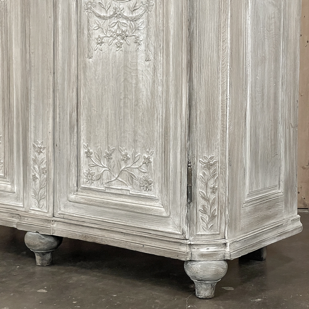 18th Century Country French Louis XVI Period Whitewashed Armoire will instantly become the focal point of any room! Arresting visual presence begins with the impressive multi-tiered crown molding that follows the contours of the casework below including rounded, mitered corner posts and a step-front center stile. The bonnet also follows that contour, and is adorned with wildflower carvings in bas relief. That overriding theme also appears at the top and bottom of the rounded cornerposts and center stile, as well as the top and bottom of each of four door panels, all hand-carved in bas relief for a subtle artistic effect. The center stile is also attached to the right door, so when the doors are open, it creates an unfettered opening making this ideal for anything, including housing a flat panel TV. The two sturdy adjustable shelves within combine with the tongue-and-groove base to create three surfaces total, with options galore as to configuration. It's even an excellent candidate as an entertainment center! A cast brass key guard and brass hinges add a nice touch, while the restrained base molding and turned urn-shaped feet complete the look. The natural tones of the old-growth wood are faintly apparent through the professional whitewashed finish, executed by our expert in-house staff!