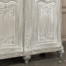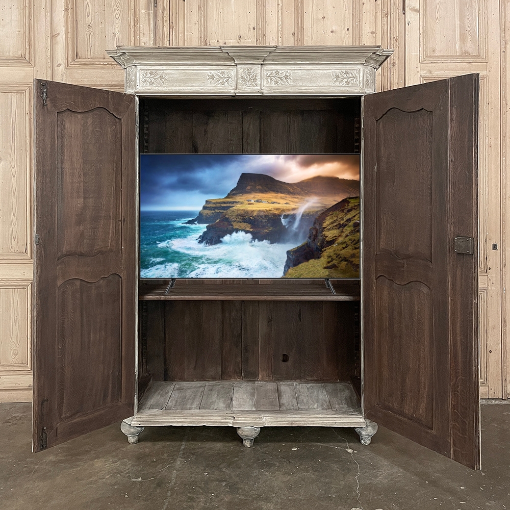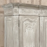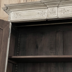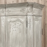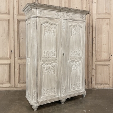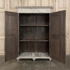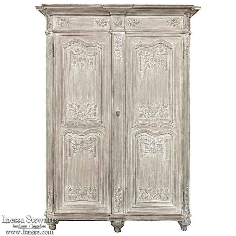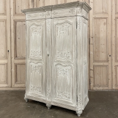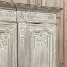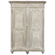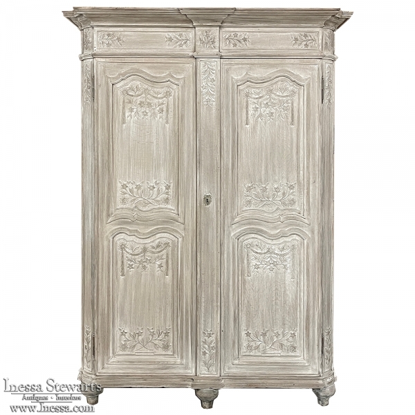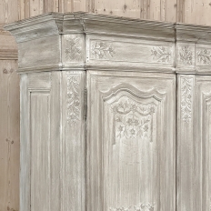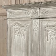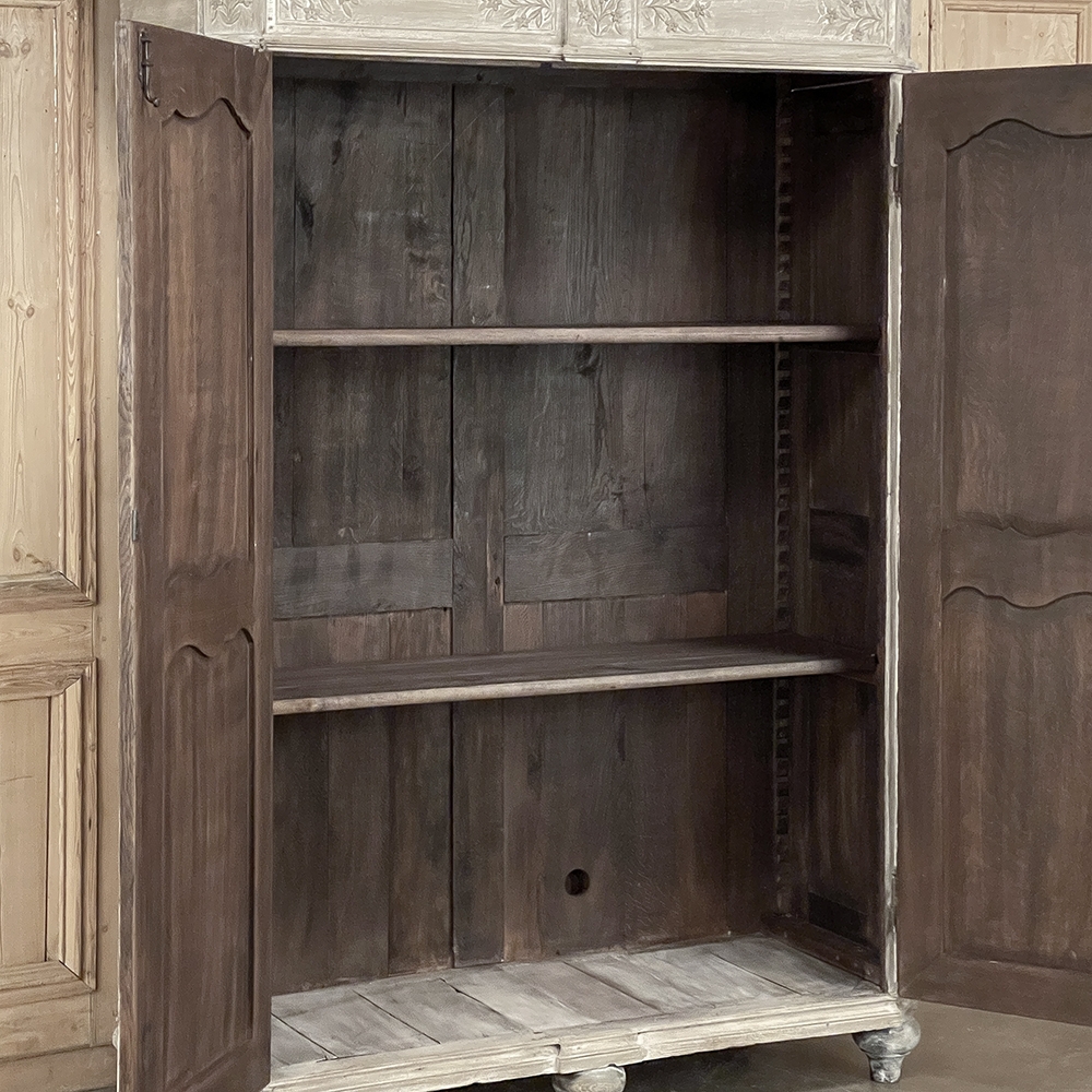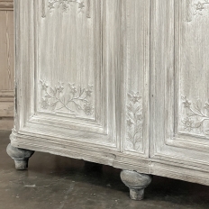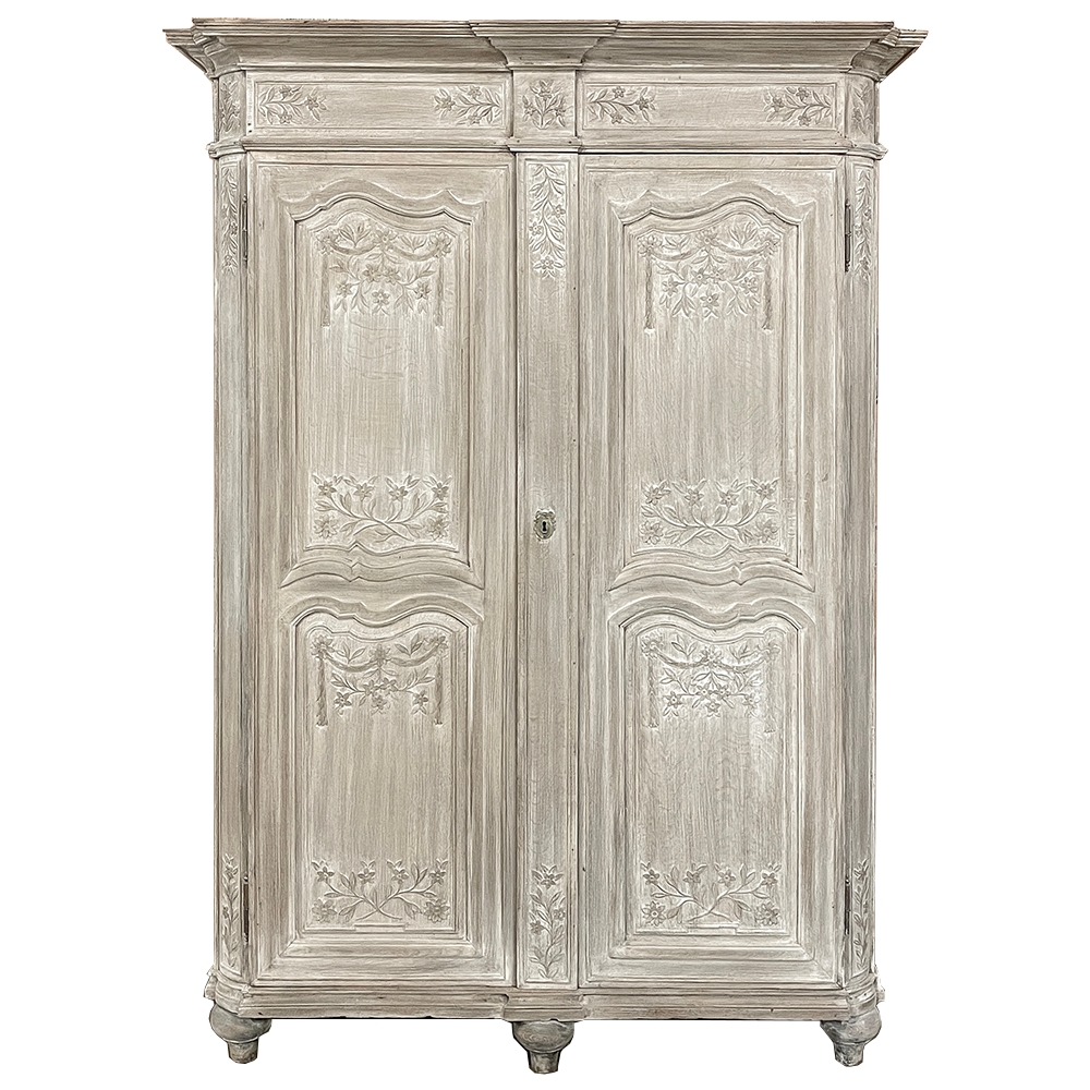 18th Century Country French Louis XVI Period Whitewashed Armoire will instantly become the focal point of any room! Arresting visual presence begins with the impressive multi-tiered crown molding that follows the contours of the casework below including rounded, mitered corner posts and a step-front center stile. The bonnet also follows that contour, and is adorned with wildflower carvings in bas relief. That overriding theme also appears at the top and bottom of the rounded cornerposts and center stile, as well as the top and bottom of each of four door panels, all hand-carved in bas relief for a subtle artistic effect. The center stile is also attached to the right door, so when the doors are open, it creates an unfettered opening making this ideal for anything, including housing a flat panel TV. The two sturdy adjustable shelves within combine with the tongue-and-groove base to create three surfaces total, with options galore as to configuration. It's even an excellent candidate as an entertainment center! A cast brass key guard and brass hinges add a nice touch, while the restrained base molding and turned urn-shaped feet complete the look. The natural tones of the old-growth wood are faintly apparent through the professional whitewashed finish, executed by our expert in-house staff!