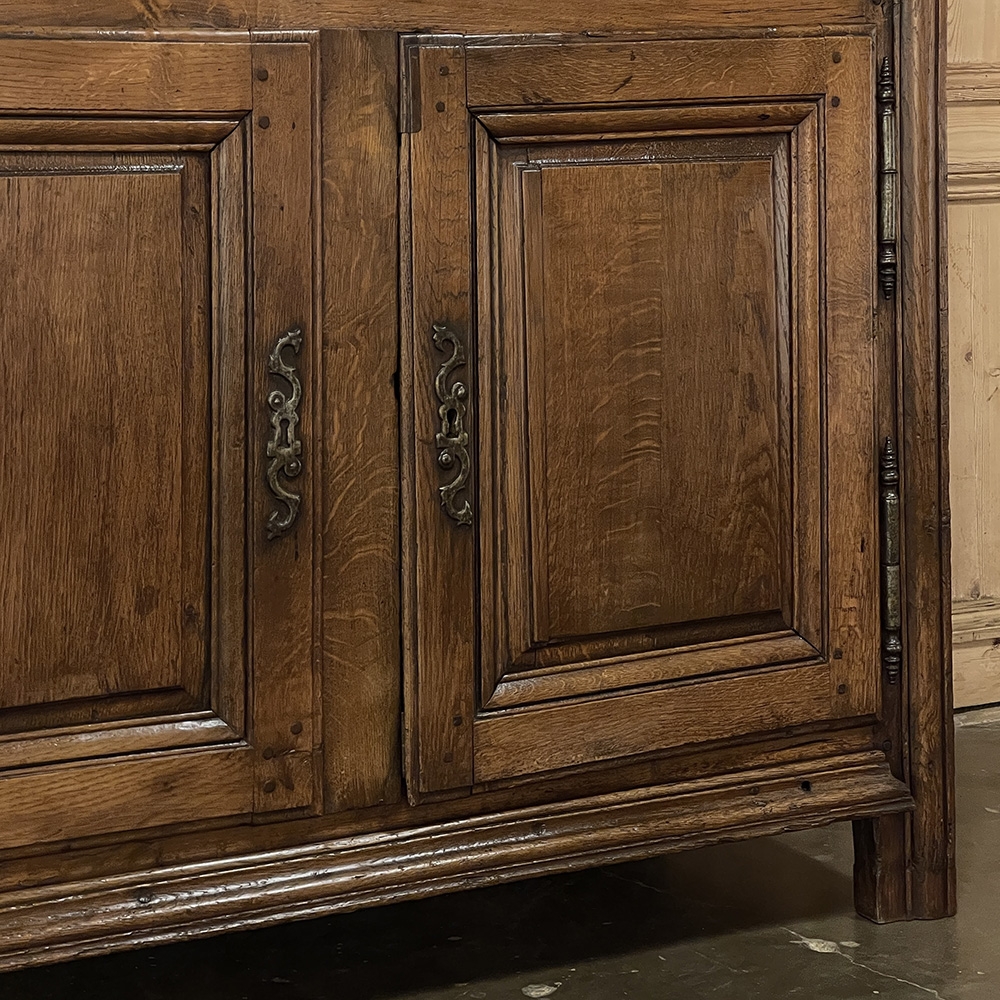 All hardware is original and entirely hand-forged, including substantial barrel hinges, sculpted key guards, and classic ring pulls. The ironwork provides texture and authenticity against the aged oak, reinforcing the integrity collectors value in fine French antique furniture.