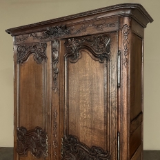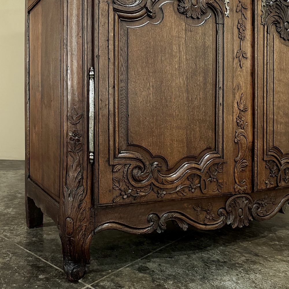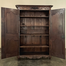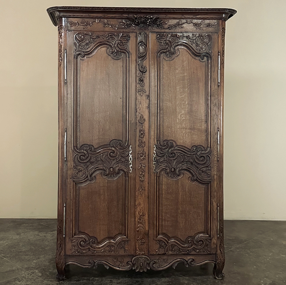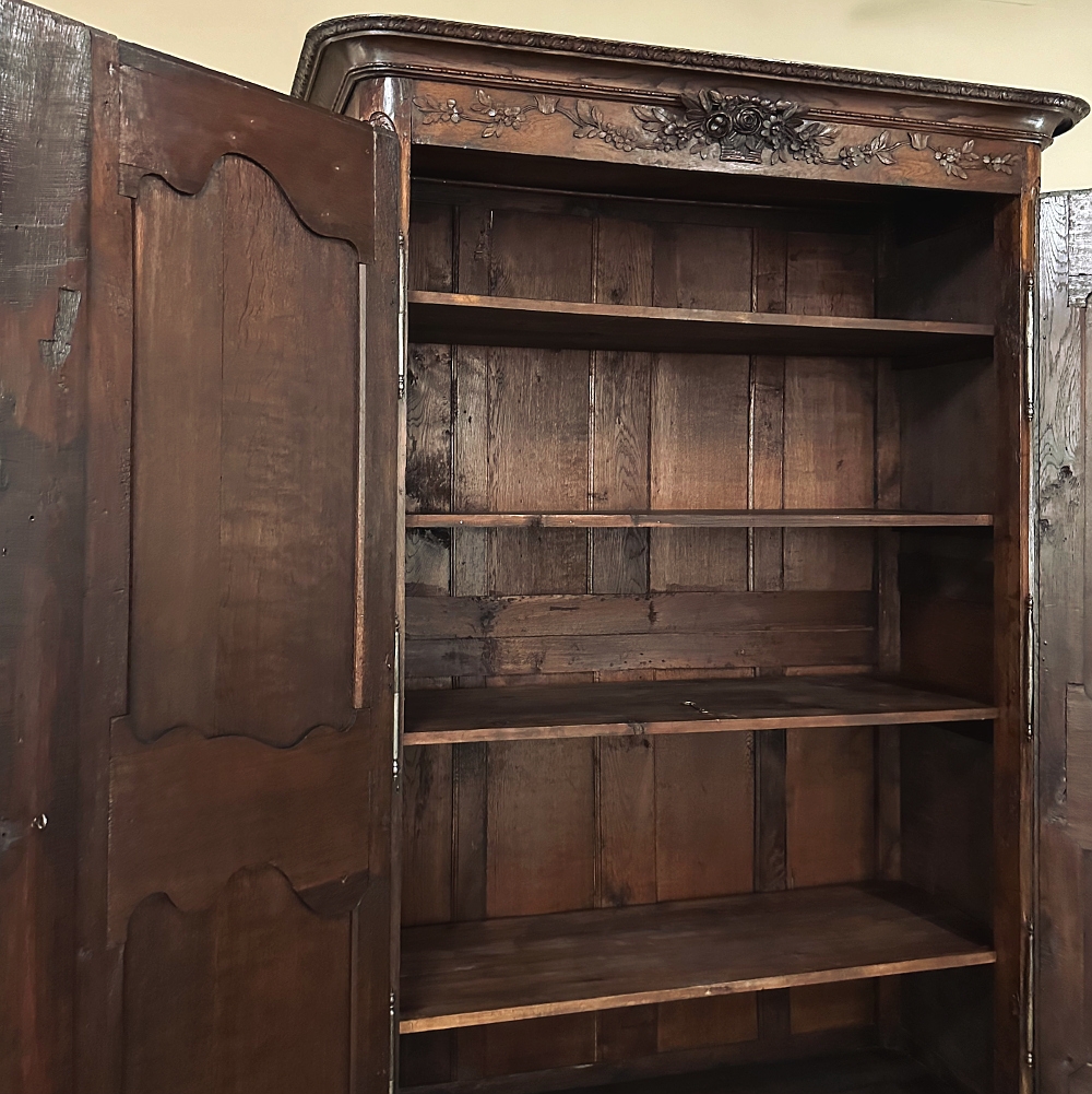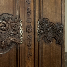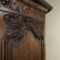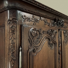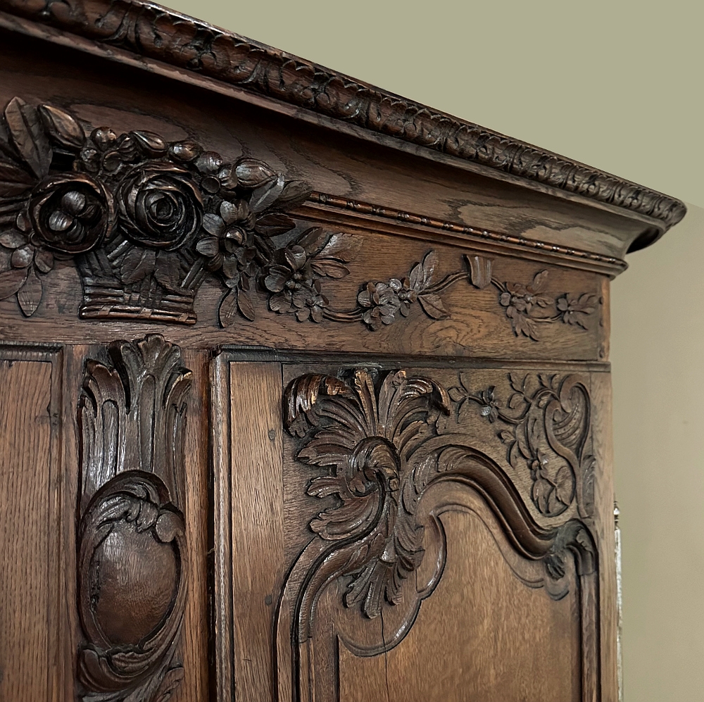 19th Century Country French Armoire from Normandie is a sterling example of the master craftsmanship from the provinces of France, where talented artisans utilized time-honored techniques and skills handed down through the generations to produce works of the cabinetmaker's art with what are considered relatively primitive tools by today's standards. This example features a bold hand-carved crown molding presiding over the capacious casework below, fitted with four shelves for five surfaces within, but easily converted for TV or hanging clothes. The center stile is also attached to the left door so when both are opened it presents an unobstructed view of the interior. Each door is also hung on three barrel hinges mounted outboard so the doors swing wide and out of the way should one want a TV inside. What's most amazing though is the artistic sculpture that adorns the entire facade. One immediately notices the basket of flowers in bold full relief centered on the bonnet, flanked with sprays of wildflowers extending all the way to the rounded cornerposts, also carved with vertical sprays of flowers both above and below. The undulating apron with bold French scrollwork features stylized shell, foliate and floral carvings. The doors, however, are the pieces de resistance! Rendered in glorious relief, the frameworks around the sculpted panels depict stylized shell, floral and foliates in a wondrous display of artistry at the top, middle and bottom, separated only visually by the aforementioned stile which features its own special treatment of the same genre, interpreted on a beautifully rendered vertical basis. A pair of steel key guards rounds out the entire facade. Note the hand-hewn plank and frame backing with pegged mortise and tenon joinery, all signs of superior craftsmanship.