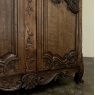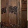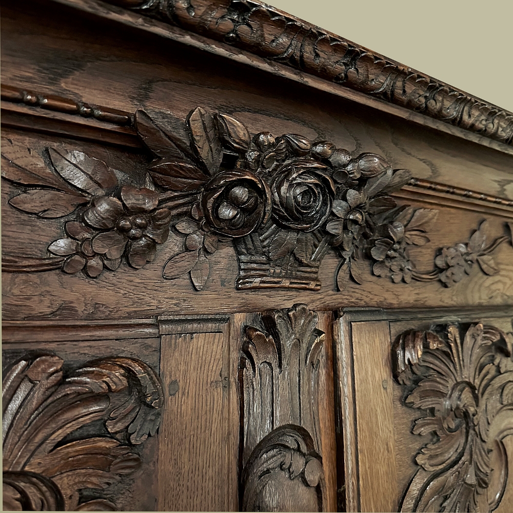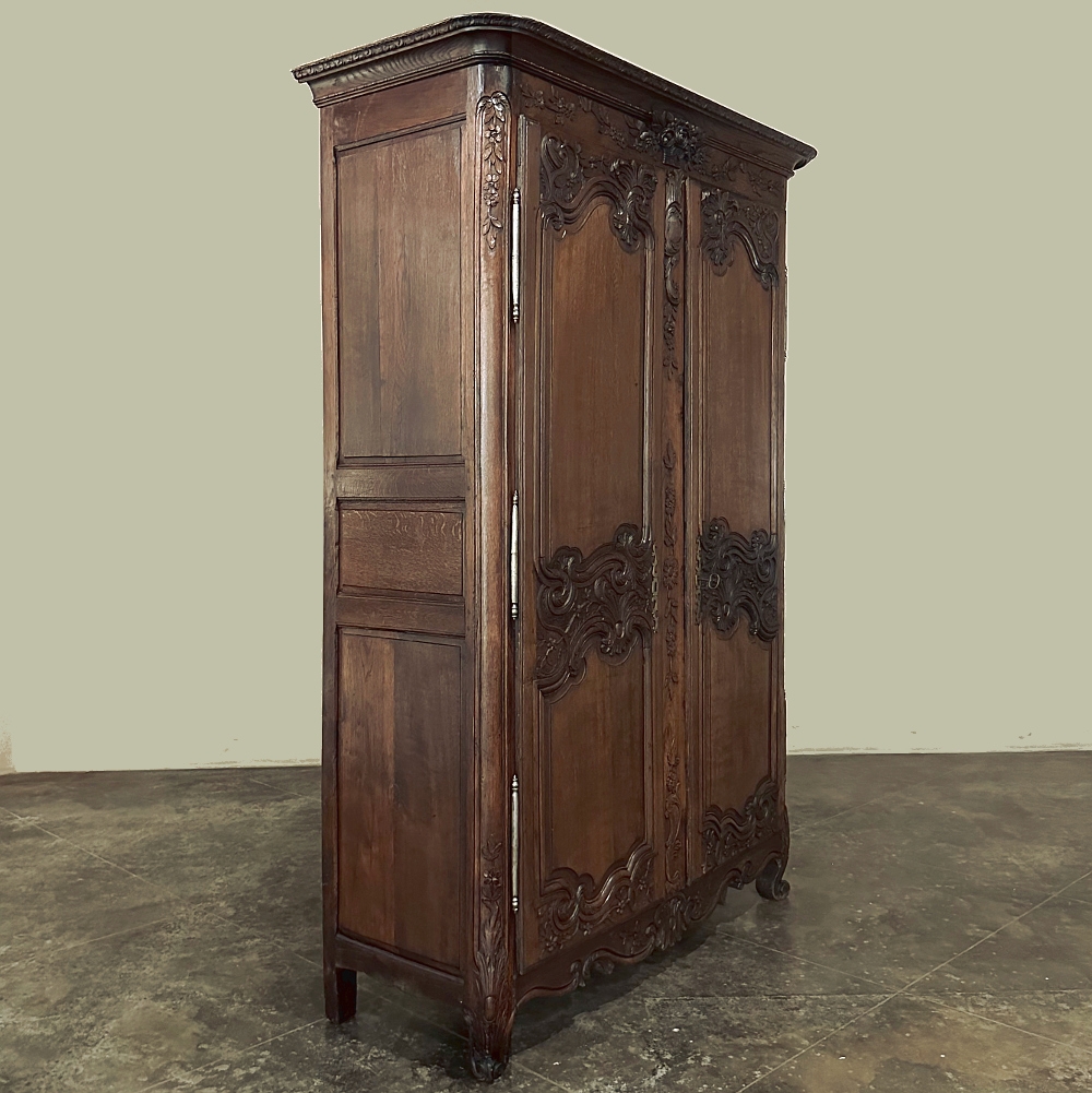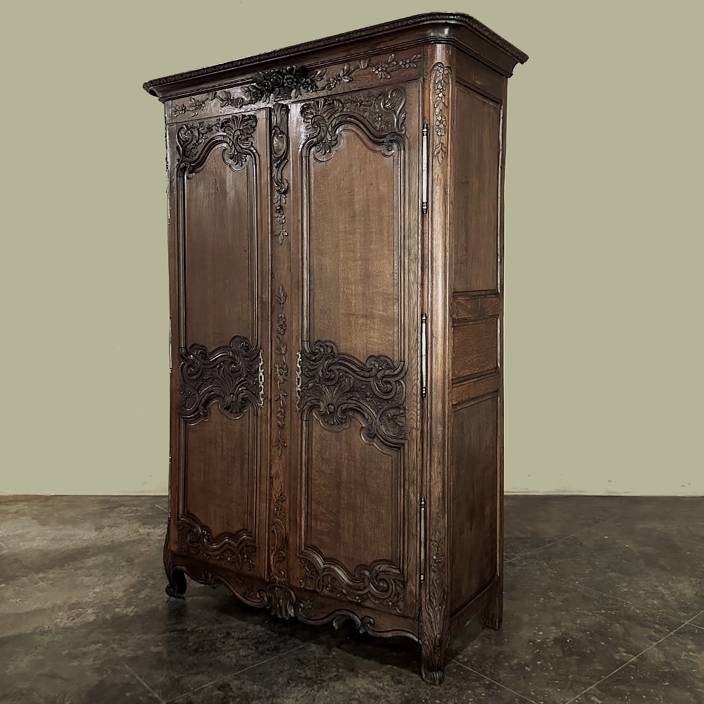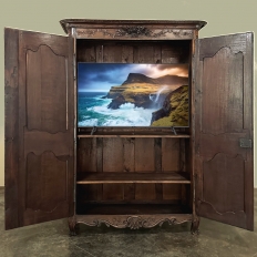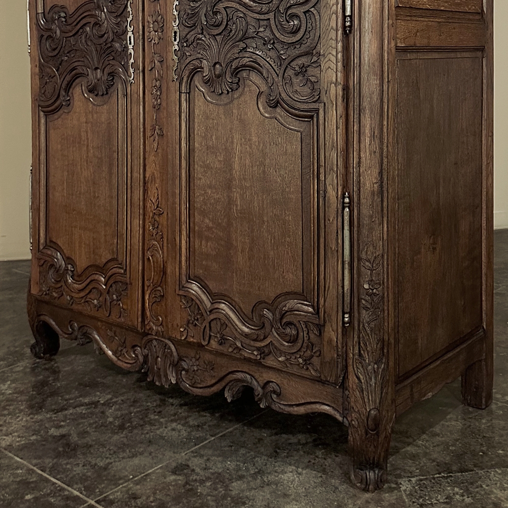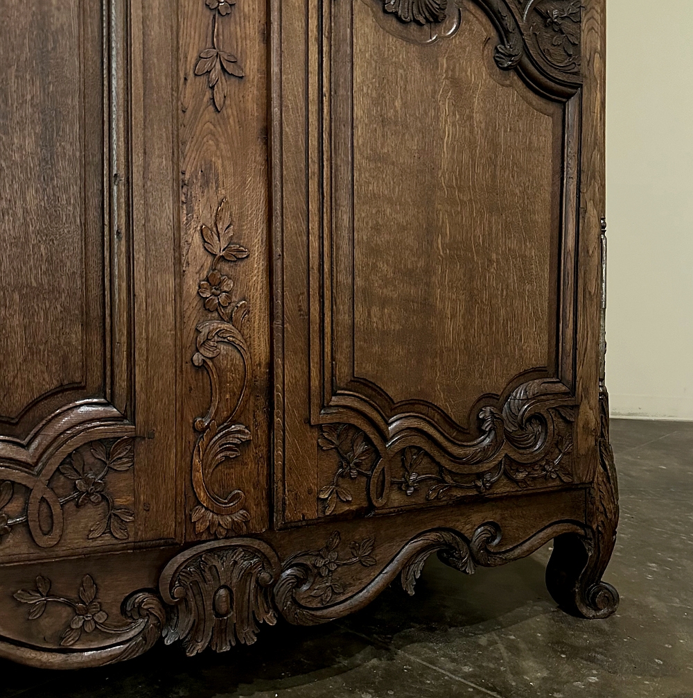 19th Century Country French Armoire from Normandie is a sterling example of the master craftsmanship from the provinces of France, where talented artisans utilized time-honored techniques and skills handed down through the generations to produce works of the cabinetmaker's art with what are considered relatively primitive tools by today's standards. This example features a bold hand-carved crown molding presiding over the capacious casework below, fitted with four shelves for five surfaces within, but easily converted for TV or hanging clothes. The center stile is also attached to the left door so when both are opened it presents an unobstructed view of the interior. Each door is also hung on three barrel hinges mounted outboard so the doors swing wide and out of the way should one want a TV inside. What's most amazing though is the artistic sculpture that adorns the entire facade. One immediately notices the basket of flowers in bold full relief centered on the bonnet, flanked with sprays of wildflowers extending all the way to the rounded cornerposts, also carved with vertical sprays of flowers both above and below. The undulating apron with bold French scrollwork features stylized shell, foliate and floral carvings. The doors, however, are the pieces de resistance! Rendered in glorious relief, the frameworks around the sculpted panels depict stylized shell, floral and foliates in a wondrous display of artistry at the top, middle and bottom, separated only visually by the aforementioned stile which features its own special treatment of the same genre, interpreted on a beautifully rendered vertical basis. A pair of steel key guards rounds out the entire facade. Note the hand-hewn plank and frame backing with pegged mortise and tenon joinery, all signs of superior craftsmanship.