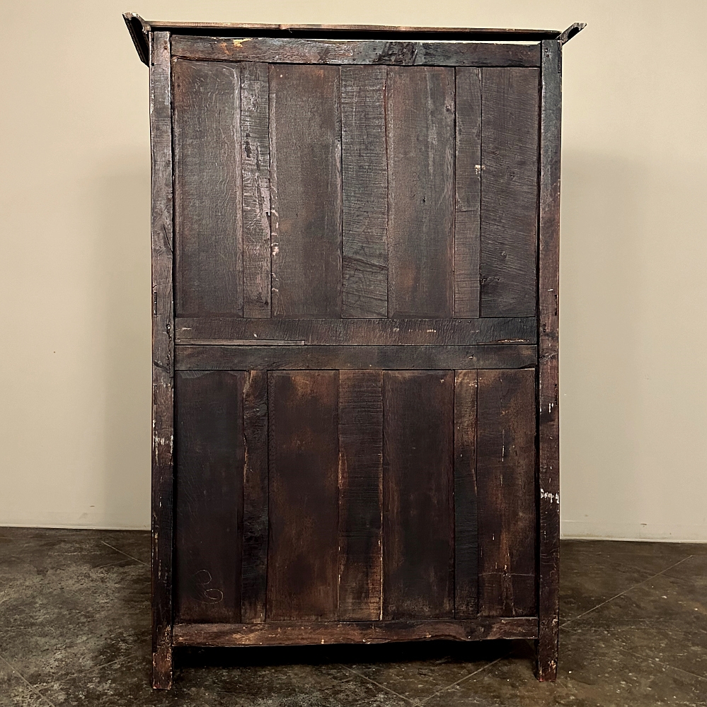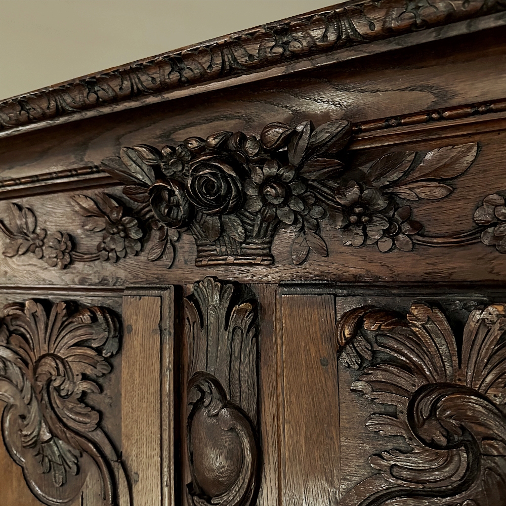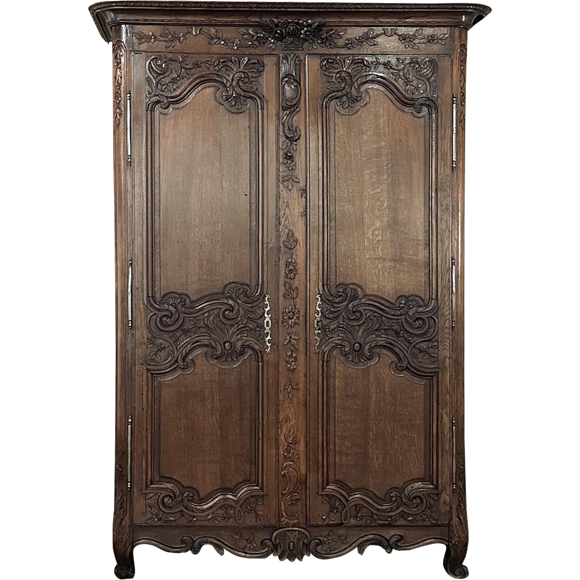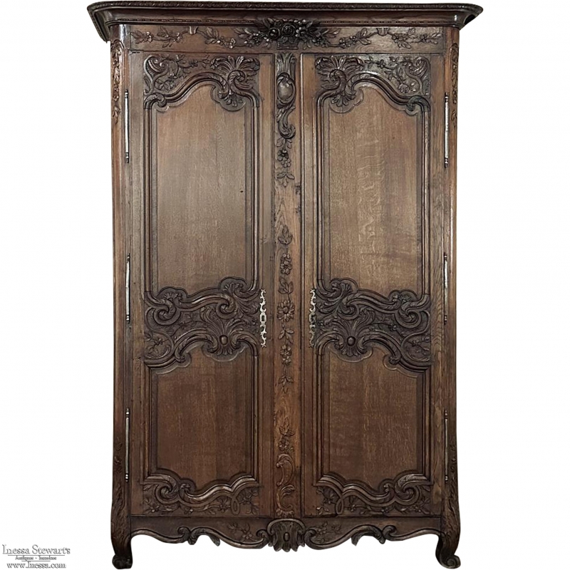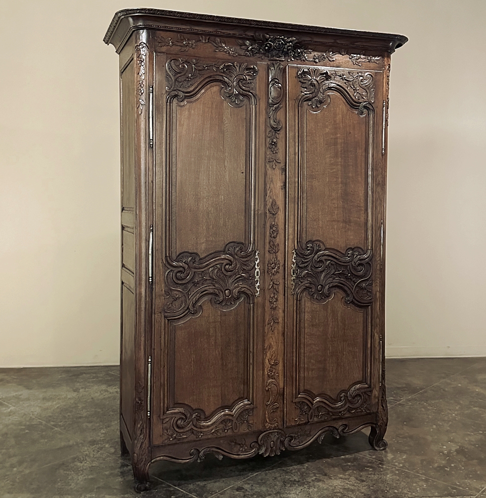 19th Century Country French Armoire from Normandie is a sterling example of the master craftsmanship from the provinces of France, where talented artisans utilized time-honored techniques and skills handed down through the generations to produce works of the cabinetmaker's art with what are considered relatively primitive tools by today's standards. This example features a bold hand-carved crown molding presiding over the capacious casework below, fitted with four shelves for five surfaces within, but easily converted for TV or hanging clothes. The center stile is also attached to the left door so when both are opened it presents an unobstructed view of the interior. Each door is also hung on three barrel hinges mounted outboard so the doors swing wide and out of the way should one want a TV inside. What's most amazing though is the artistic sculpture that adorns the entire facade. One immediately notices the basket of flowers in bold full relief centered on the bonnet, flanked with sprays of wildflowers extending all the way to the rounded cornerposts, also carved with vertical sprays of flowers both above and below. The undulating apron with bold French scrollwork features stylized shell, foliate and floral carvings. The doors, however, are the pieces de resistance! Rendered in glorious relief, the frameworks around the sculpted panels depict stylized shell, floral and foliates in a wondrous display of artistry at the top, middle and bottom, separated only visually by the aforementioned stile which features its own special treatment of the same genre, interpreted on a beautifully rendered vertical basis. A pair of steel key guards rounds out the entire facade. Note the hand-hewn plank and frame backing with pegged mortise and tenon joinery, all signs of superior craftsmanship.