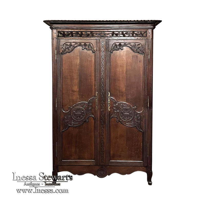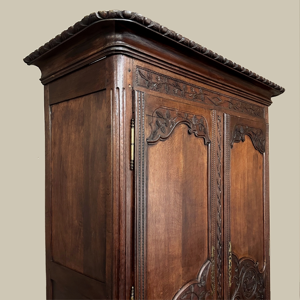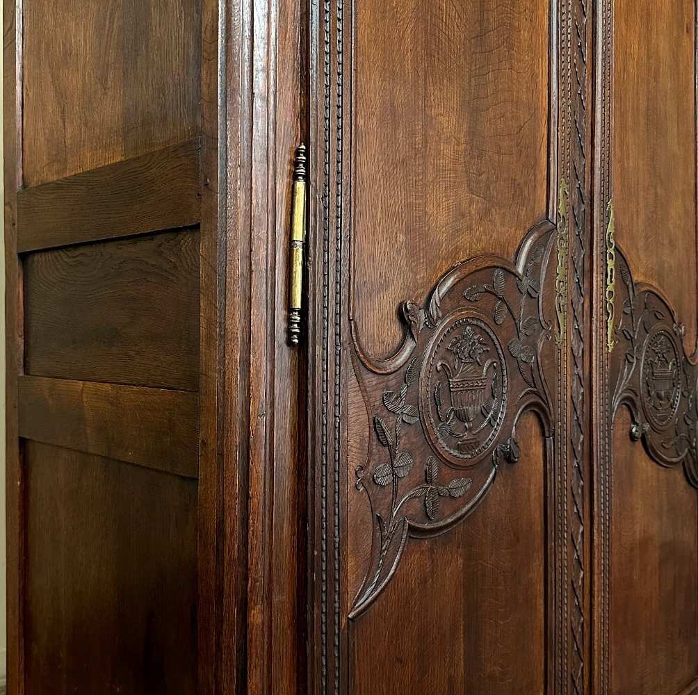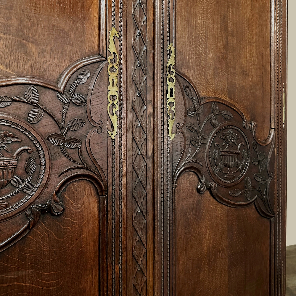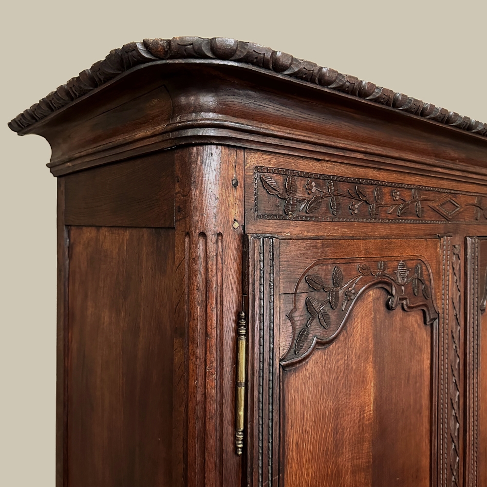 19th Century Country French Armoire ~ Wardrobe is a magnificent expression of provincial artistry and craftsmanship! There was no lack of cabinetmaking talent in the outlying regions around the central furniture making hubs of Paris, Lyon and Bordeaux, as evidenced by this effort executed by artisans from Normandie out of the densely grained, old-growth indigenous oak that was the preferred medium of the region. A tailored architecture is enhanced with exquisite hand-carved detail reflecting classical themes of grapevines, foliate, laurels, Greek urns and even a sunflower on the scrolled apron. Wheat bordering defines the doors, which also feature amazingly complex French scrolls surrounding the intricate sculpted adornment. Brass barrel hinges mounted outboard allow the doors to swing wide for easy access, and complementary brass key guards add additional visual appeal. Note the pegged mortise & tenon joinery used throughout, even on the hand-chamfered plank and frame panels of the back side!