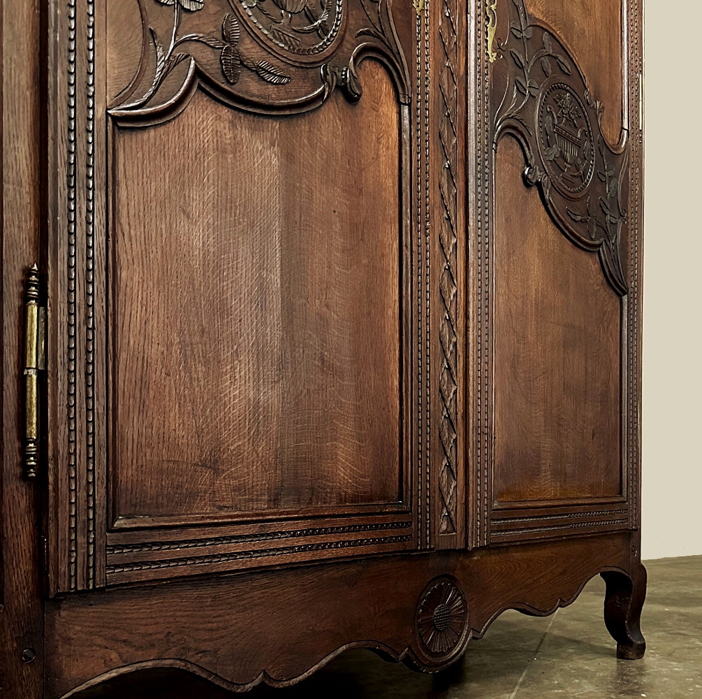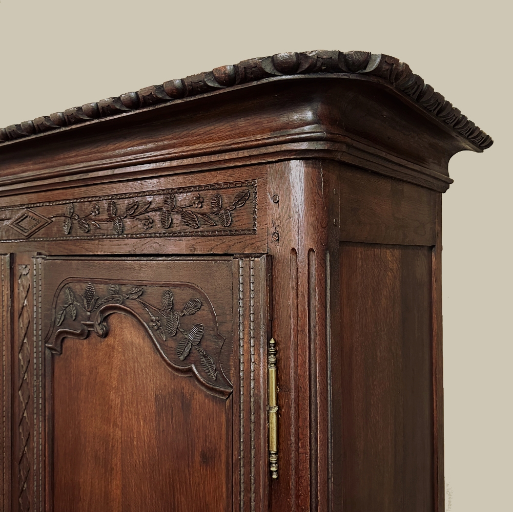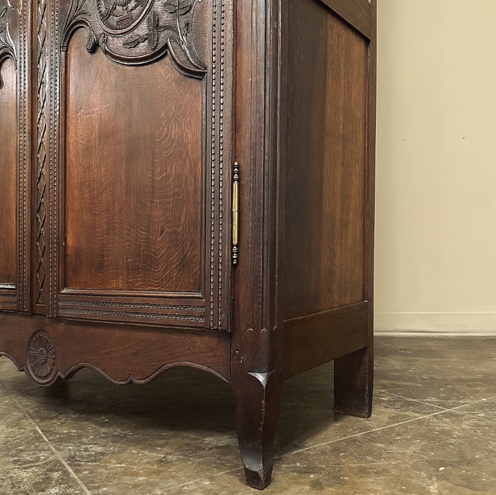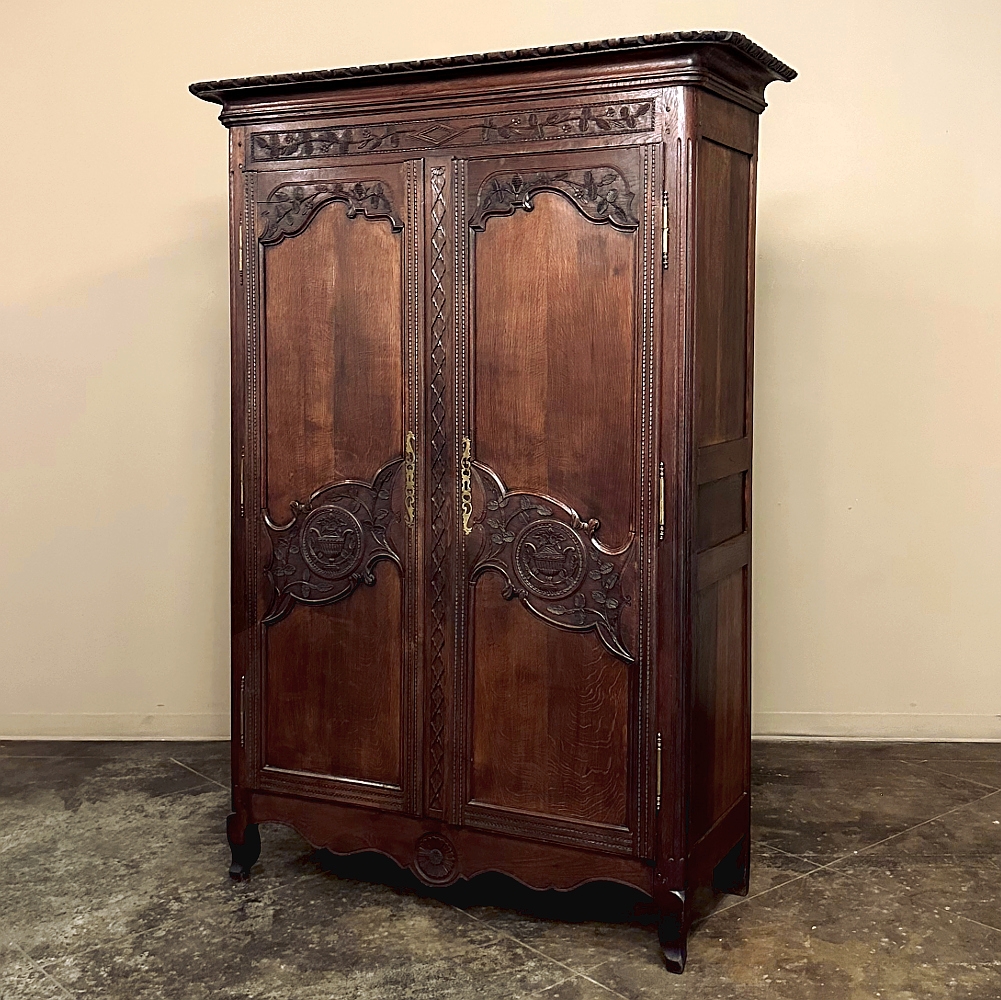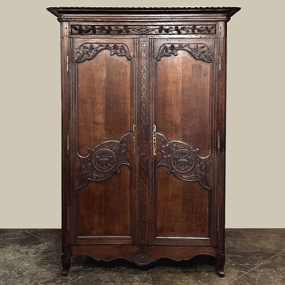 19th Century Country French Armoire ~ Wardrobe is a magnificent expression of provincial artistry and craftsmanship! There was no lack of cabinetmaking talent in the outlying regions around the central furniture making hubs of Paris, Lyon and Bordeaux, as evidenced by this effort executed by artisans from Normandie out of the densely grained, old-growth indigenous oak that was the preferred medium of the region. A tailored architecture is enhanced with exquisite hand-carved detail reflecting classical themes of grapevines, foliate, laurels, Greek urns and even a sunflower on the scrolled apron. Wheat bordering defines the doors, which also feature amazingly complex French scrolls surrounding the intricate sculpted adornment. Brass barrel hinges mounted outboard allow the doors to swing wide for easy access, and complementary brass key guards add additional visual appeal. Note the pegged mortise & tenon joinery used throughout, even on the hand-chamfered plank and frame panels of the back side!
