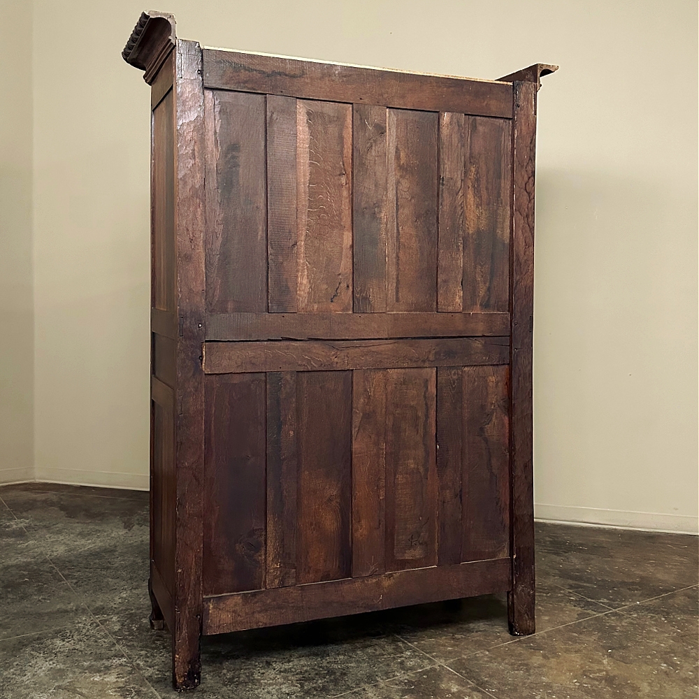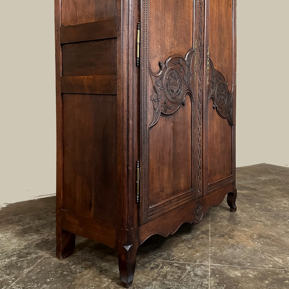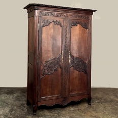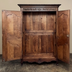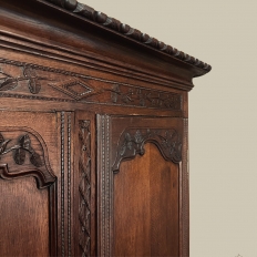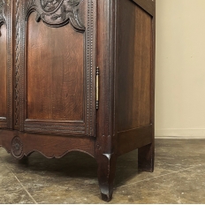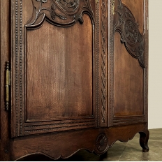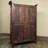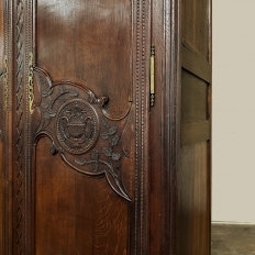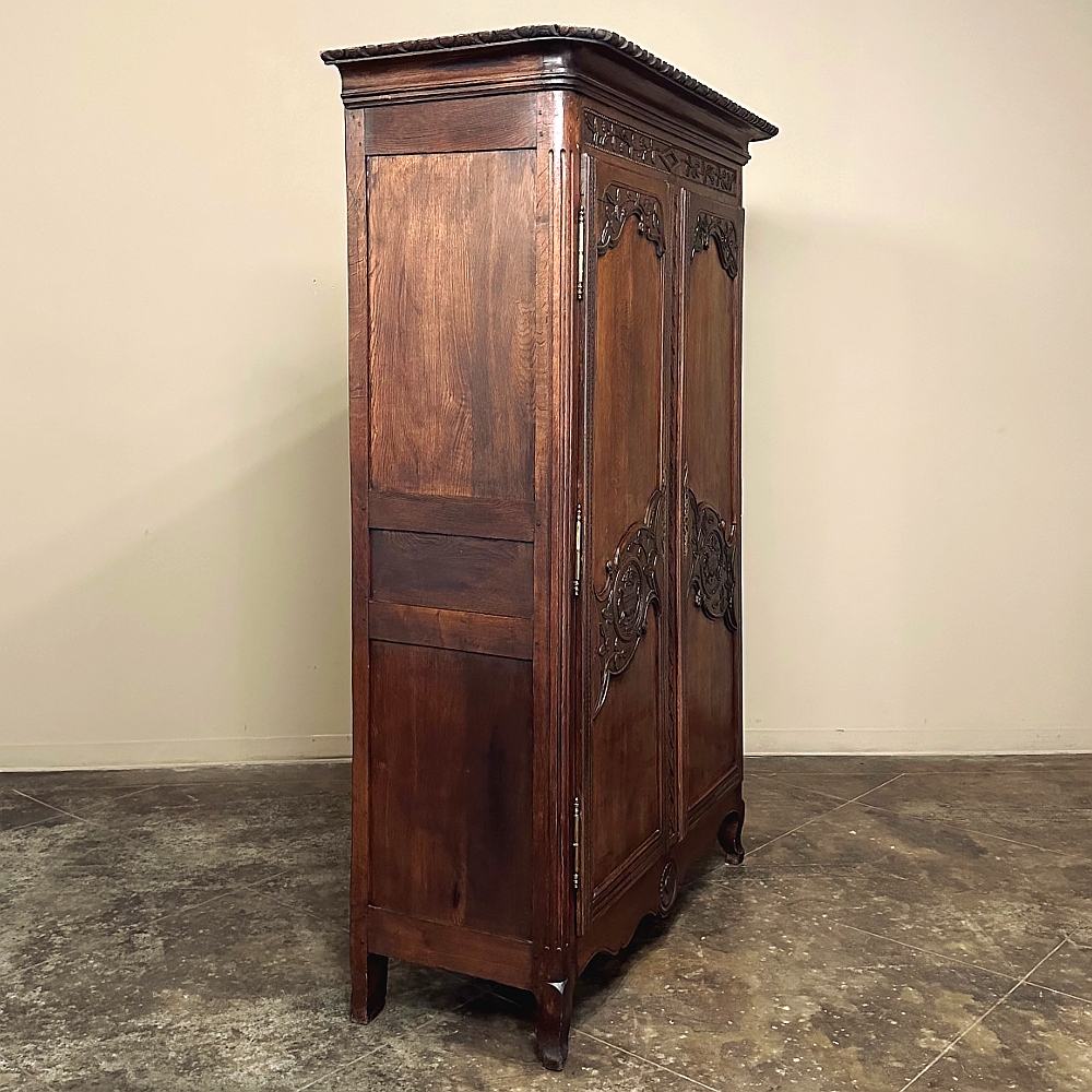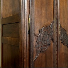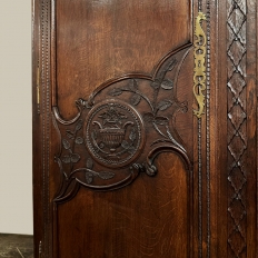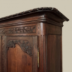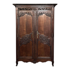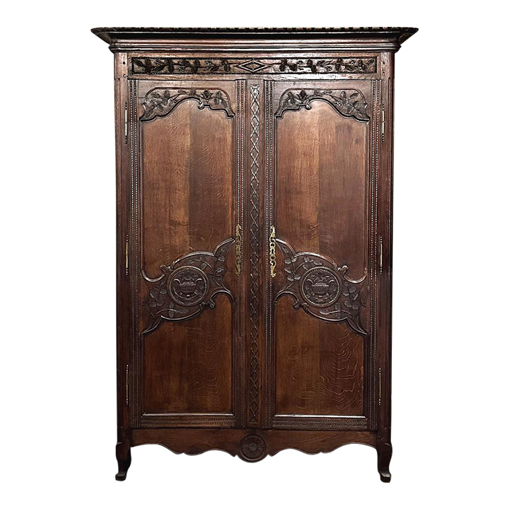 19th Century Country French Armoire ~ Wardrobe is a magnificent expression of provincial artistry and craftsmanship! There was no lack of cabinetmaking talent in the outlying regions around the central furniture making hubs of Paris, Lyon and Bordeaux, as evidenced by this effort executed by artisans from Normandie out of the densely grained, old-growth indigenous oak that was the preferred medium of the region. A tailored architecture is enhanced with exquisite hand-carved detail reflecting classical themes of grapevines, foliate, laurels, Greek urns and even a sunflower on the scrolled apron. Wheat bordering defines the doors, which also feature amazingly complex French scrolls surrounding the intricate sculpted adornment. Brass barrel hinges mounted outboard allow the doors to swing wide for easy access, and complementary brass key guards add additional visual appeal. Note the pegged mortise & tenon joinery used throughout, even on the hand-chamfered plank and frame panels of the back side!