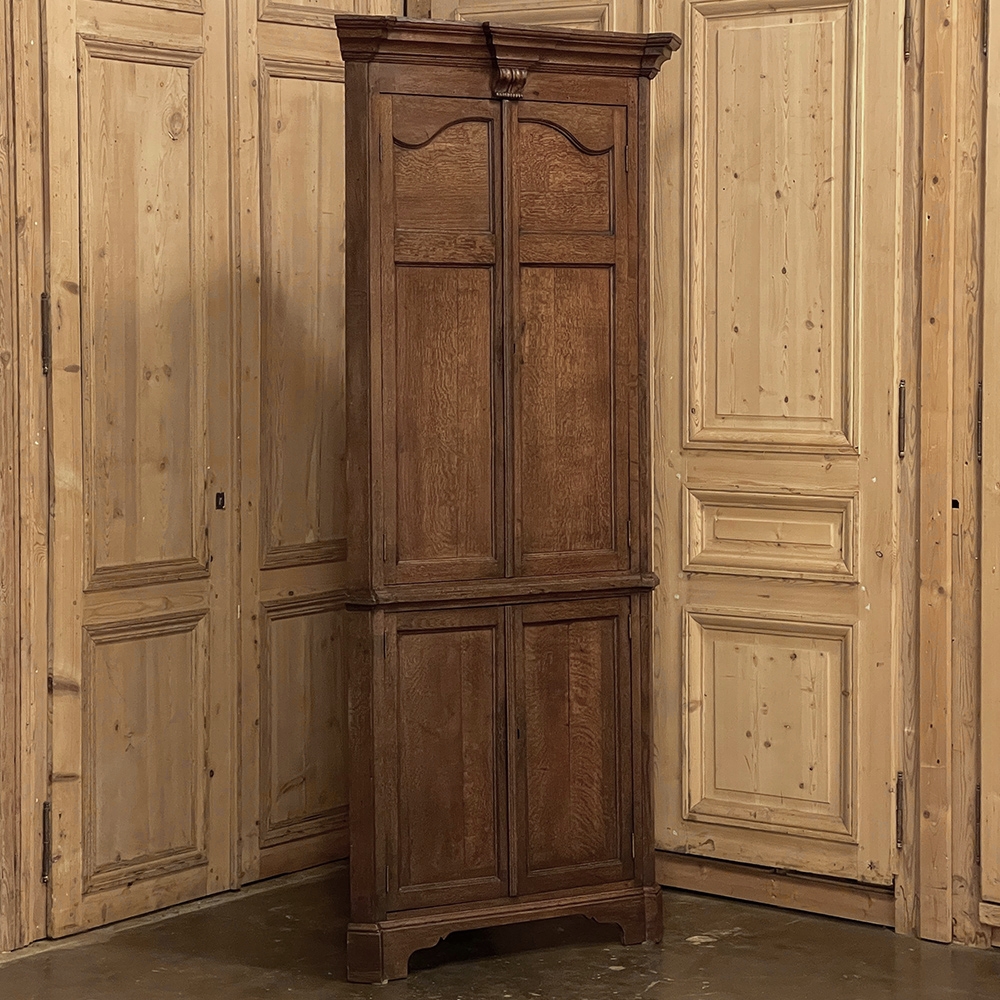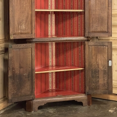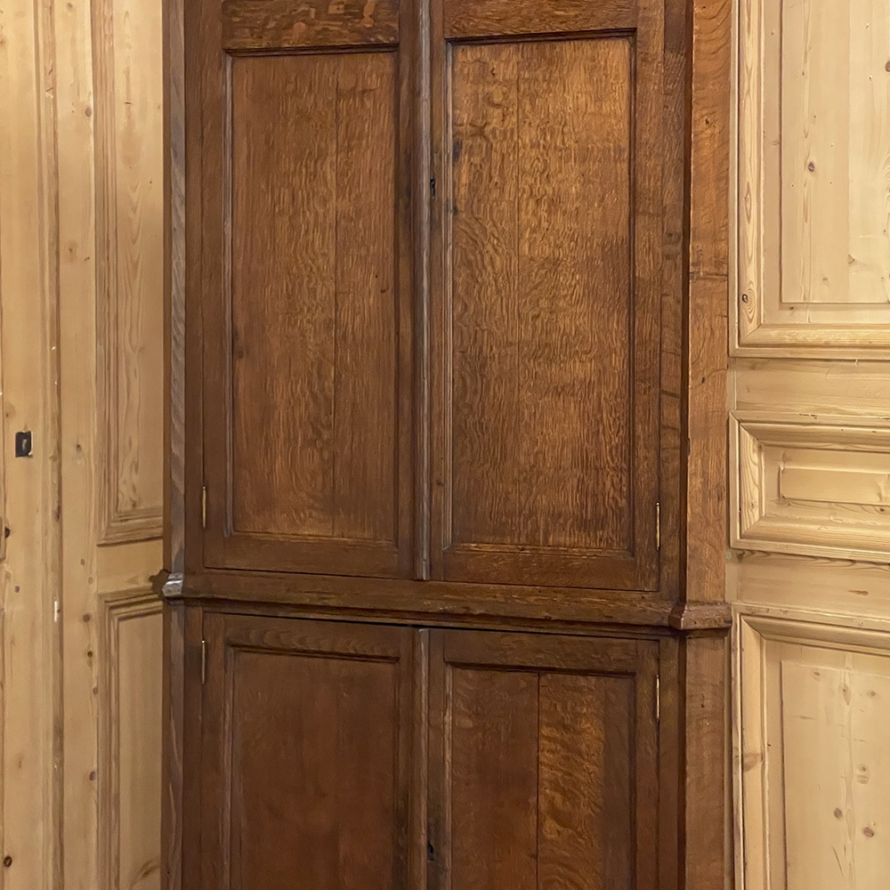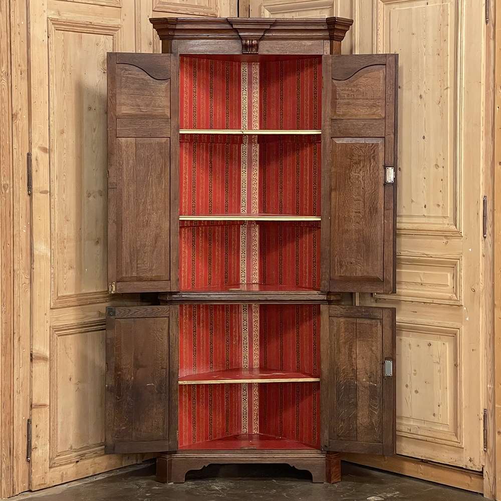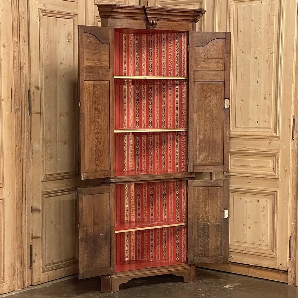 19th Century Swedish Gustavian Neoclassical Corner Cabinet is an exceptionally well-crafted piece, designed to make the maximum use of your floor plan, especially since corners are usually wasted space! Hand-crafted from dense, old-growth oak, it features a stately architecture inspired by classical Greek and Roman designs, with a bold, multi-tiered crown set with mitered corner projections and a corbel at the center. The crown overlooks the design with an upper and lower tier, consisting of doors with tailored, rectangular patterns except for the upper panels which together form a graceful arch. Mitered corners and tailored molding complete the exterior facade design. The four doors open independently to reveal a spacious interior with 3 shelves and 5 surfaces, and at some point an owner painstakingly wallpapered the inside!