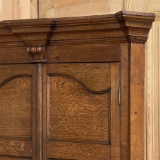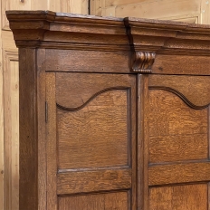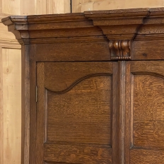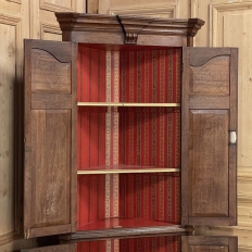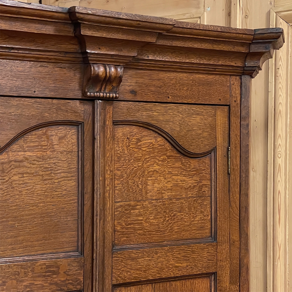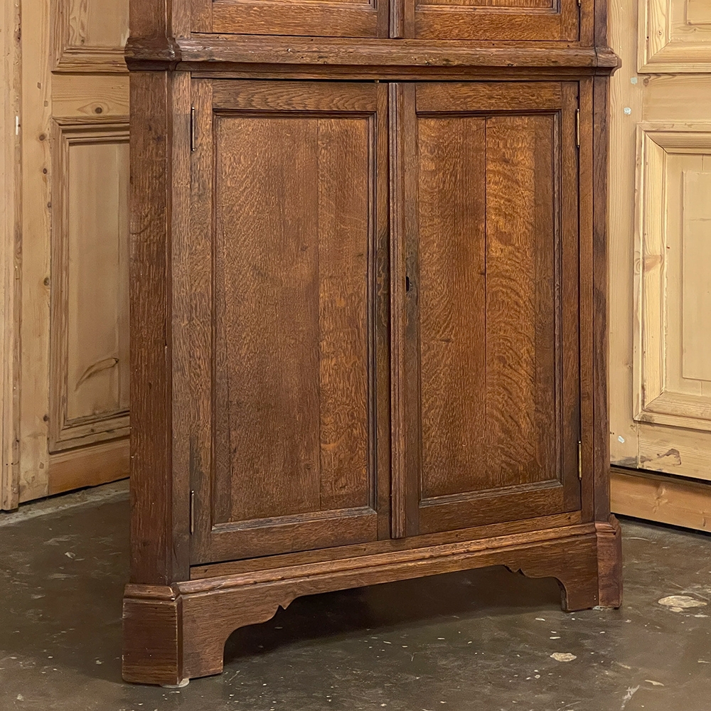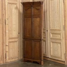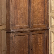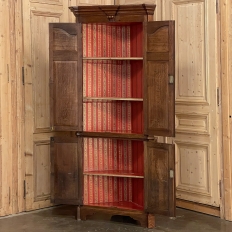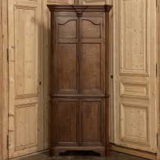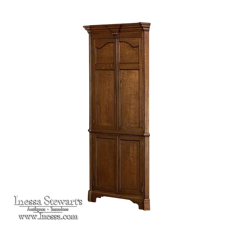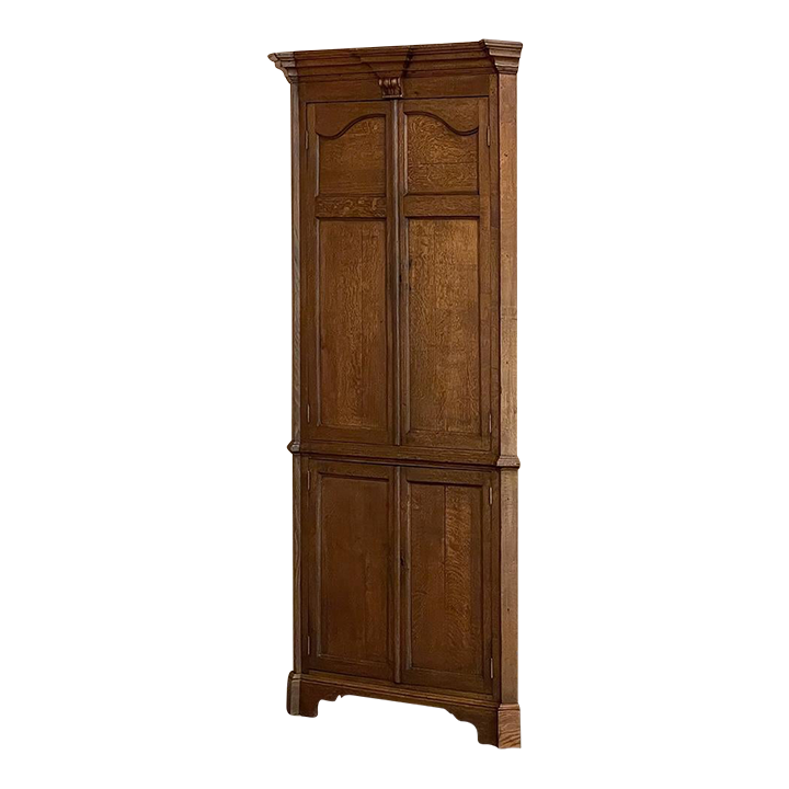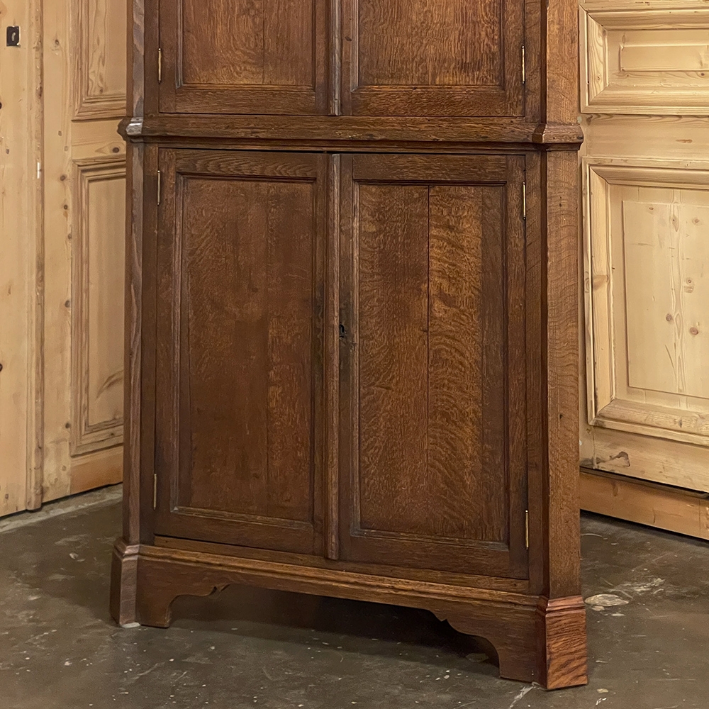 19th Century Swedish Gustavian Neoclassical Corner Cabinet is an exceptionally well-crafted piece, designed to make the maximum use of your floor plan, especially since corners are usually wasted space! Hand-crafted from dense, old-growth oak, it features a stately architecture inspired by classical Greek and Roman designs, with a bold, multi-tiered crown set with mitered corner projections and a corbel at the center. The crown overlooks the design with an upper and lower tier, consisting of doors with tailored, rectangular patterns except for the upper panels which together form a graceful arch. Mitered corners and tailored molding complete the exterior facade design. The four doors open independently to reveal a spacious interior with 3 shelves and 5 surfaces, and at some point an owner painstakingly wallpapered the inside!