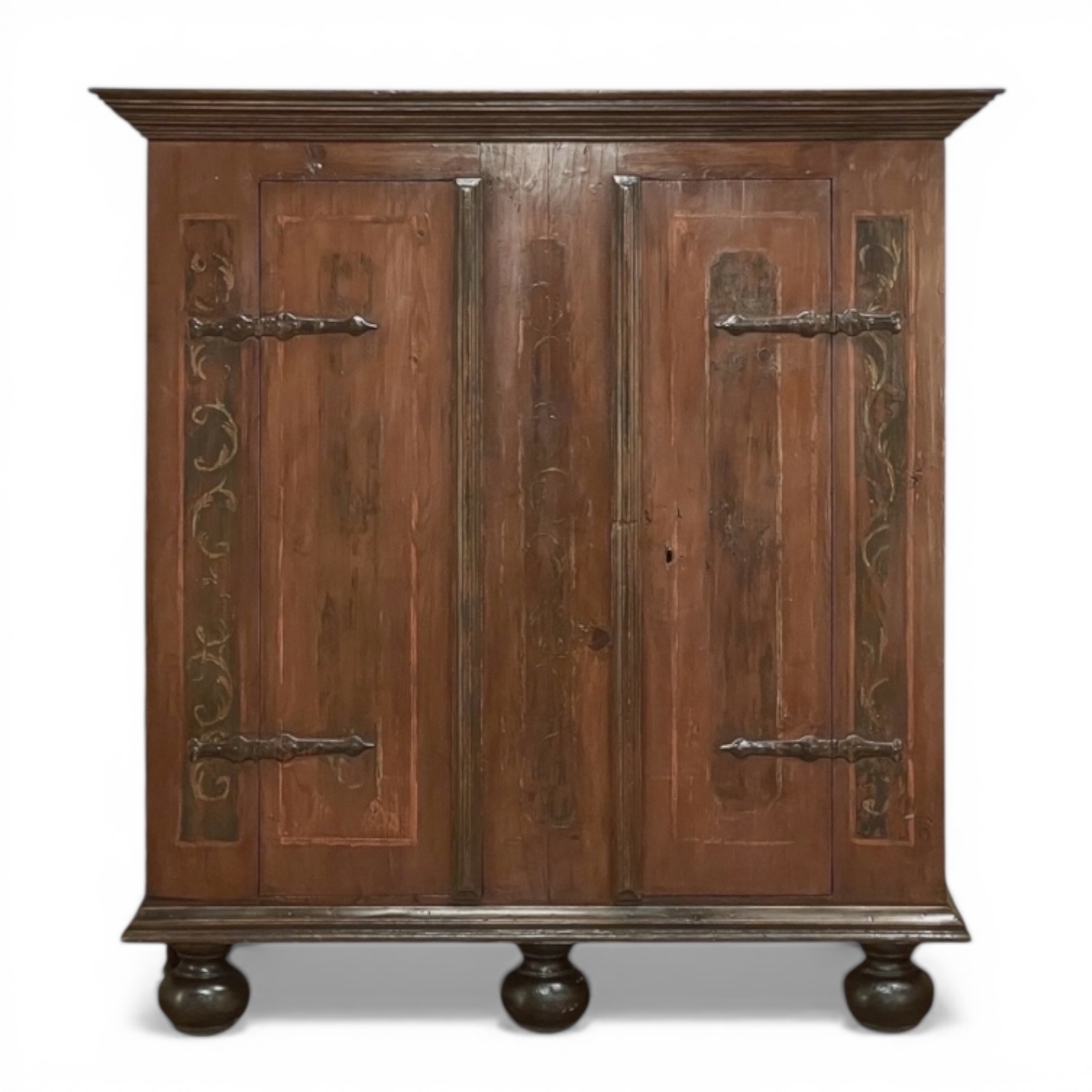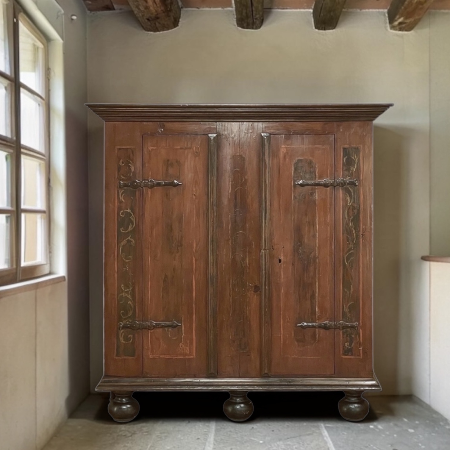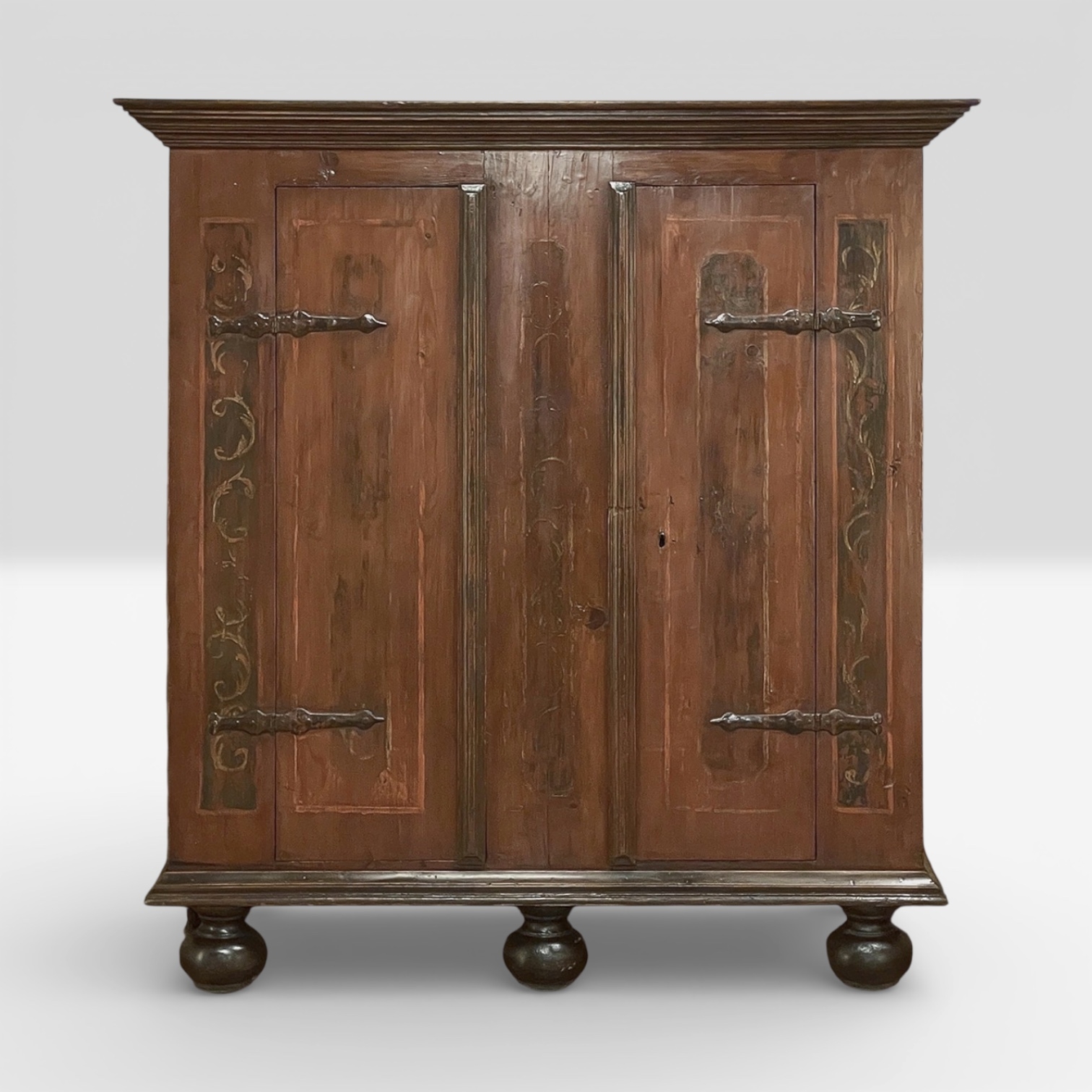 SaleAmong fine Swedish antiques, this 19th century painted pine armoire stands as a beautiful example of traditional Scandinavian antique furniture. Handcrafted of solid pine, it is finished in a warm, earthy brown with subtle tonal variations intentionally applied to create depth and visual richness. The decorative painting was skillfully executed to enhance the architectural presence of the panels, giving the façade a refined, dimensional quality that elevates this piece beyond simple rustic storage.