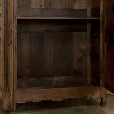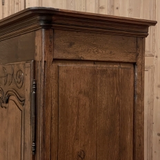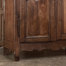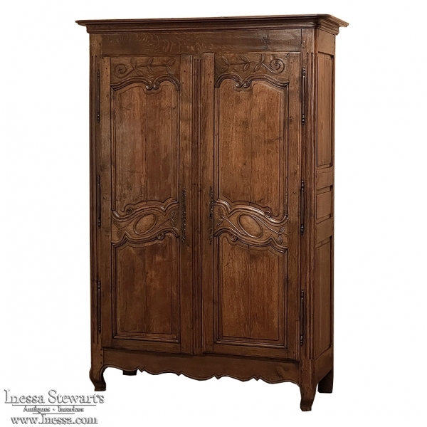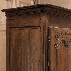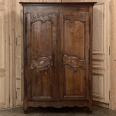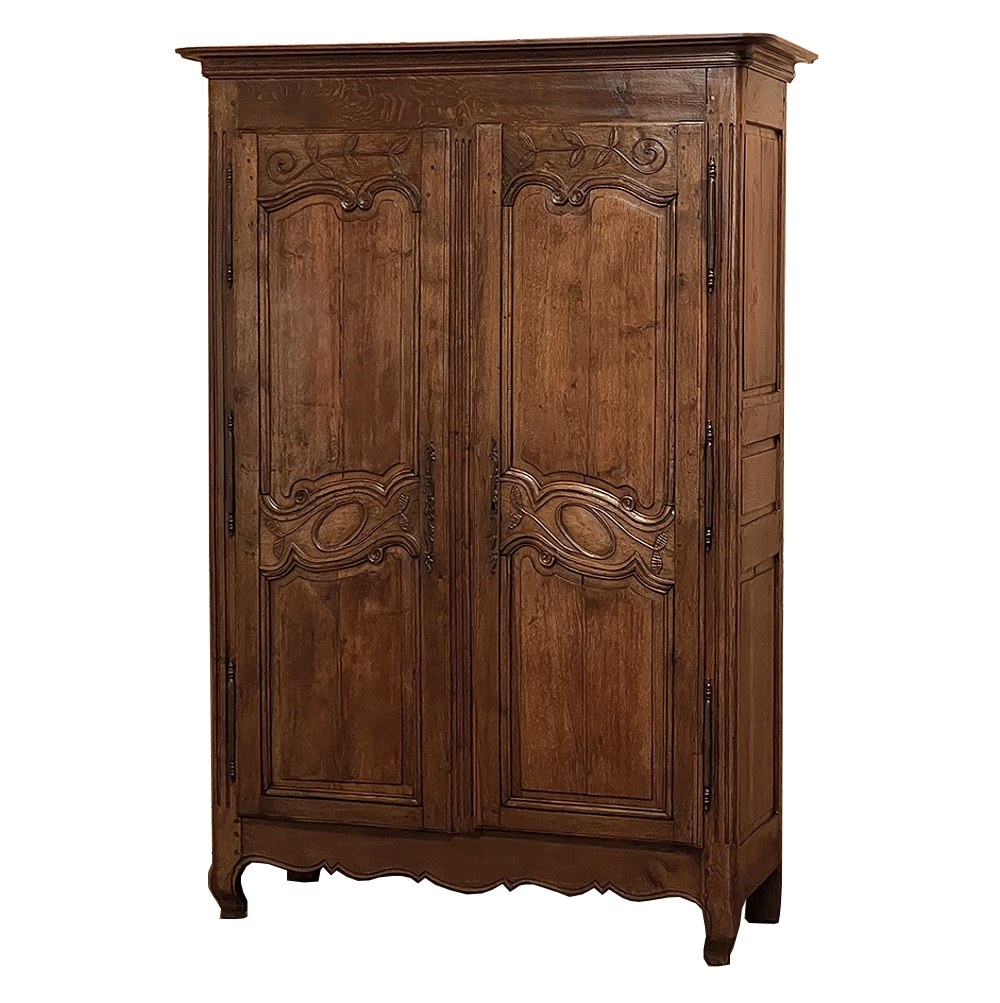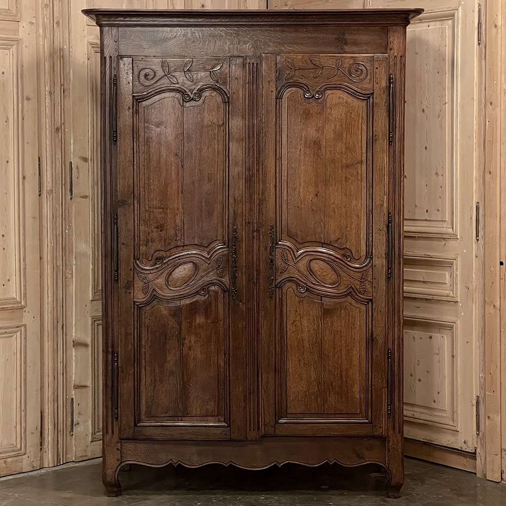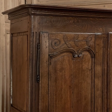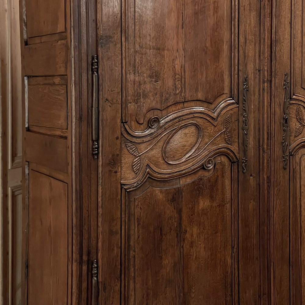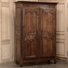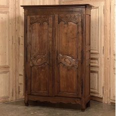 Early 19th Century Country French Armoire is a prime example of one of the most important historical developments in the world of furniture. Back before the days of closets in every room, the armoire provided needed storage, and provided it in style! This example features a stately architecture with an elegantly flared crown molding situated atop the bonnet, which was left unadorned in order to direct attention two the fine yet restrained, whimsical carvings on the doors below. Angled traverses dissect the door panels and feature fine scrollwork with foliates and angled egg forms rendered in relief. Three external barrel hinges hang each door, complemented by finely detailed key guards, with fluting appearing on the rounded cornerposts as well as the center stile. Even the sides display the talents of the cabinetmakers, with raised chamfered panels between the crosspieces. Pegged mortise & tenon joinery was used throughout the design, even on the back with its rough hand-hewn solid planks.