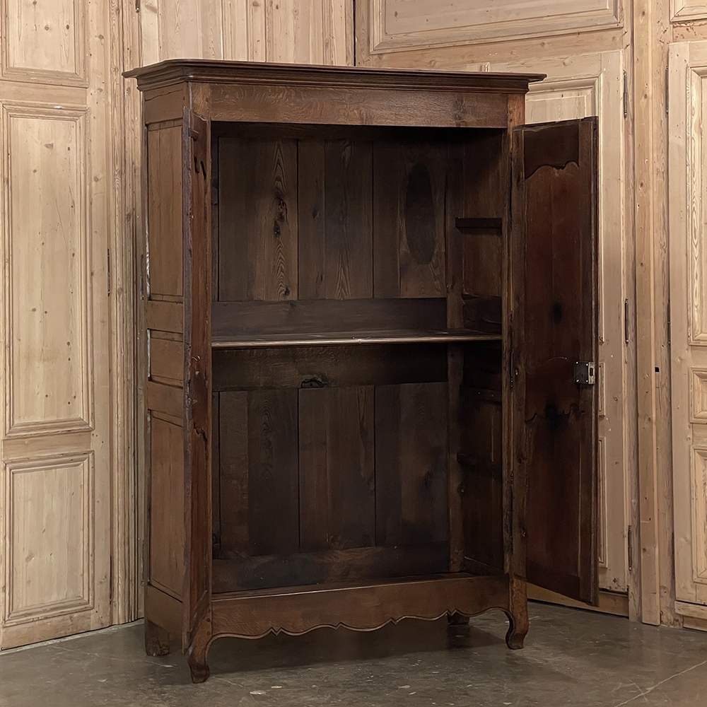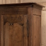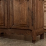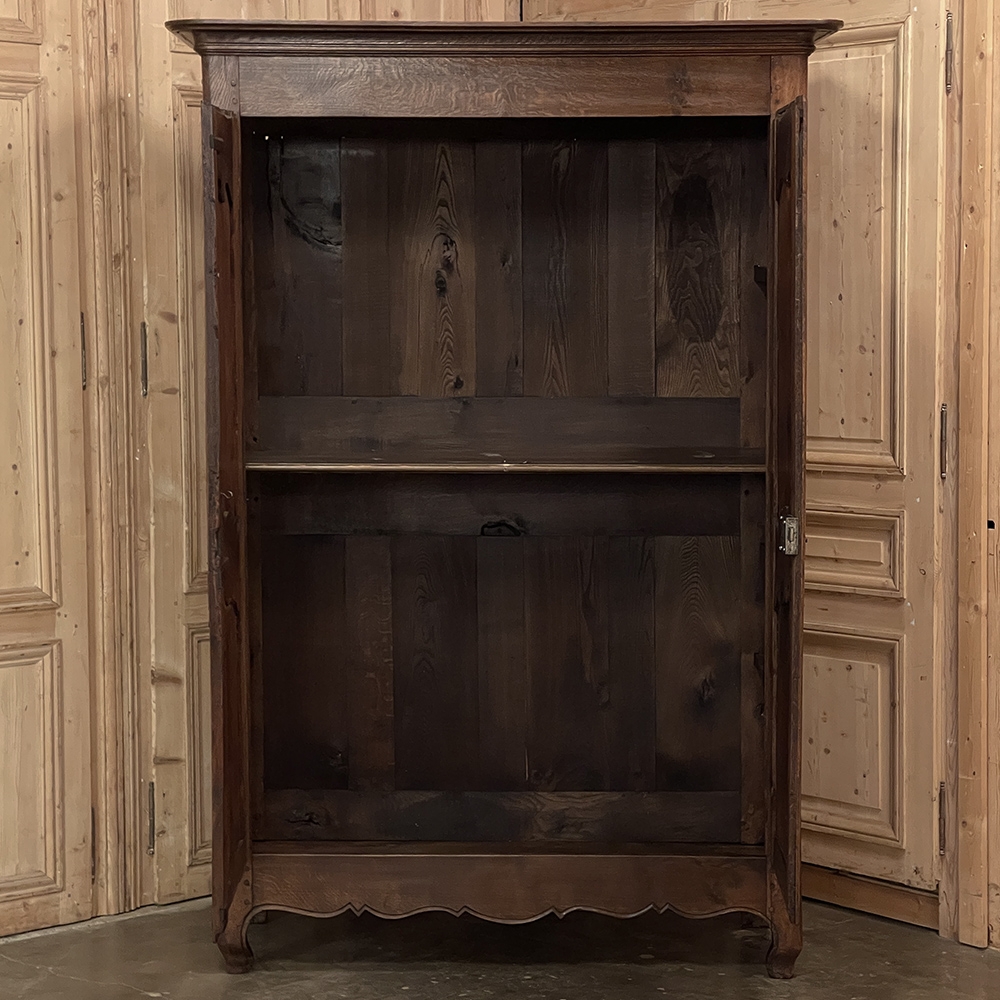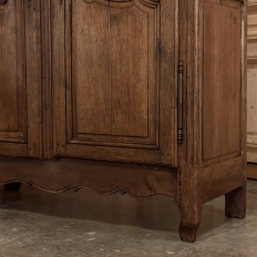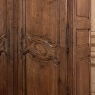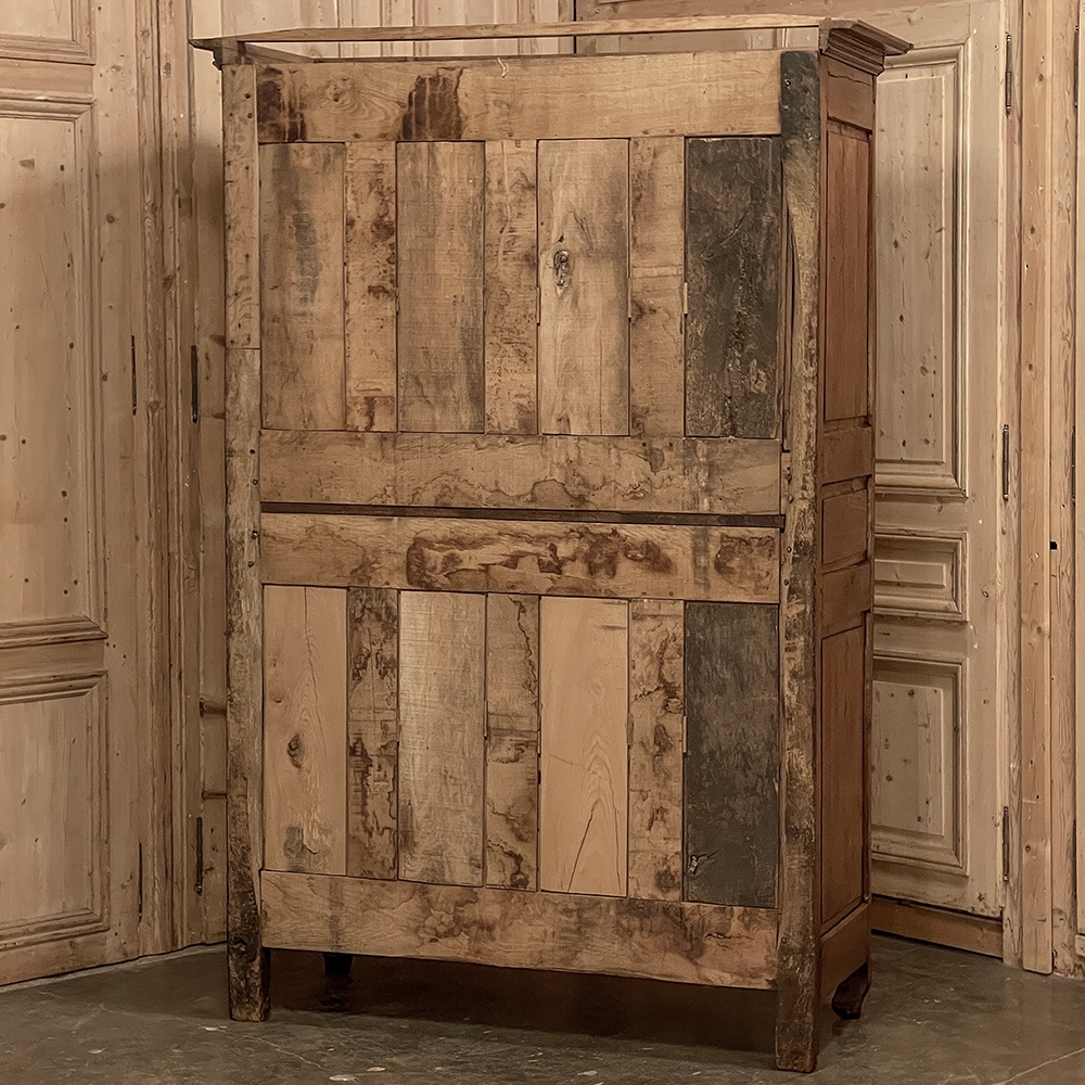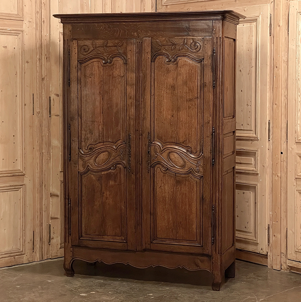 Early 19th Century Country French Armoire is a prime example of one of the most important historical developments in the world of furniture. Back before the days of closets in every room, the armoire provided needed storage, and provided it in style! This example features a stately architecture with an elegantly flared crown molding situated atop the bonnet, which was left unadorned in order to direct attention two the fine yet restrained, whimsical carvings on the doors below. Angled traverses dissect the door panels and feature fine scrollwork with foliates and angled egg forms rendered in relief. Three external barrel hinges hang each door, complemented by finely detailed key guards, with fluting appearing on the rounded cornerposts as well as the center stile. Even the sides display the talents of the cabinetmakers, with raised chamfered panels between the crosspieces. Pegged mortise & tenon joinery was used throughout the design, even on the back with its rough hand-hewn solid planks.