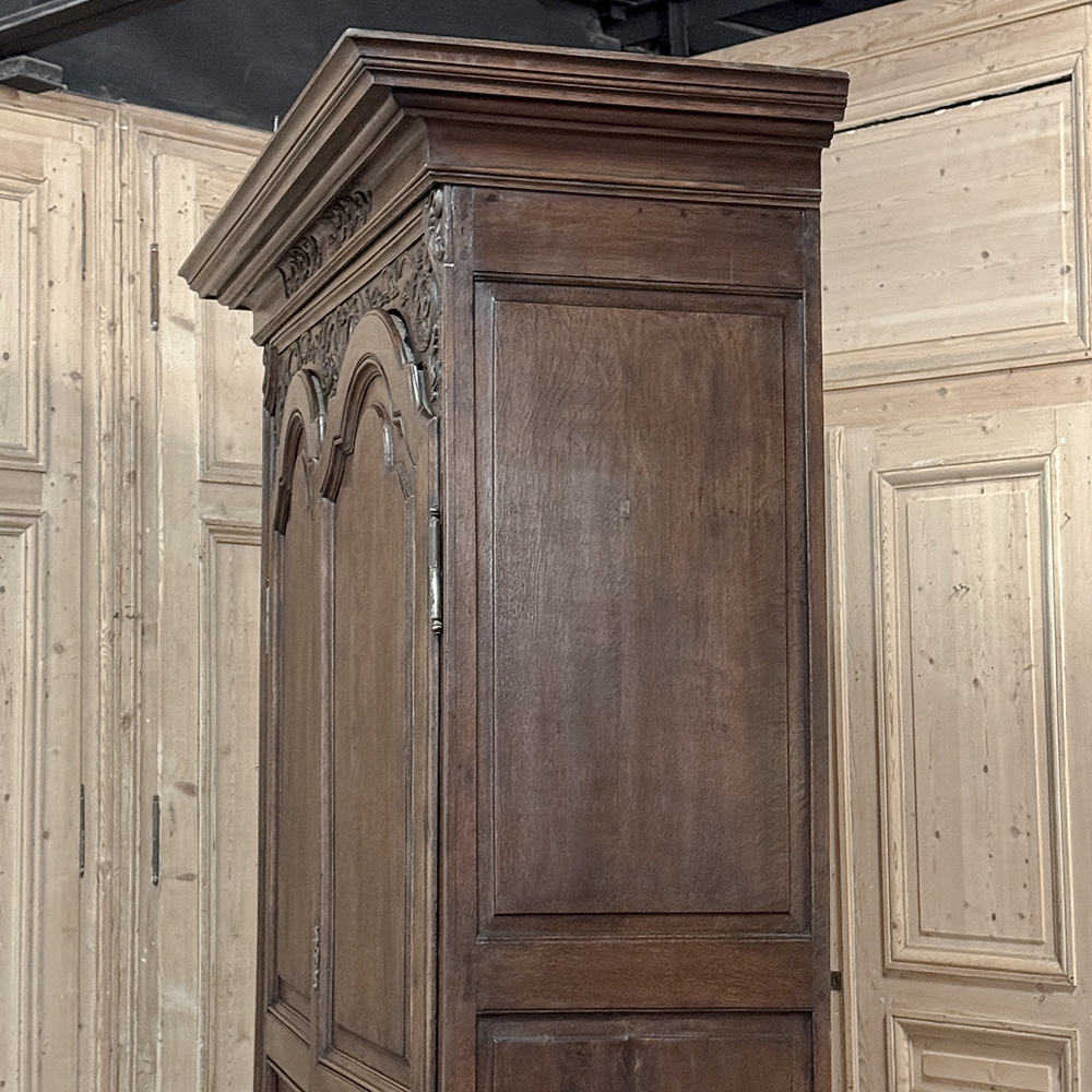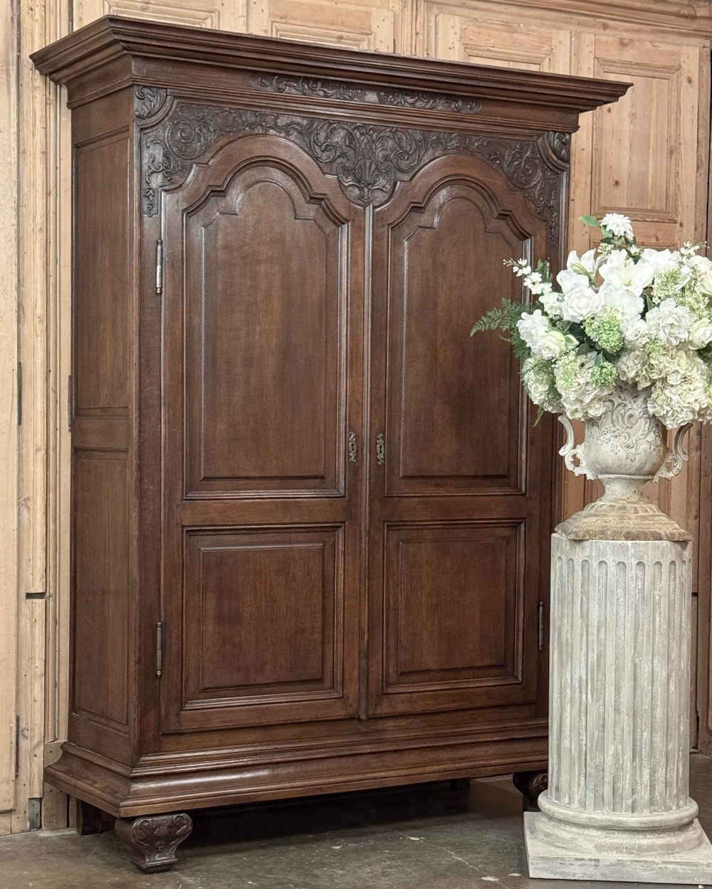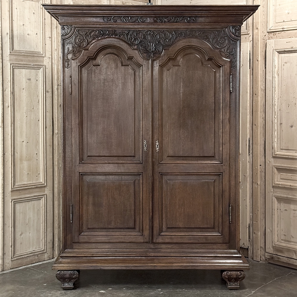 Grand 18th Century Country French Louis XIV Armoire was created for a spacious manoir, and is the perfect choice for large scale rooms and/or those who need extra storage in spades! Hand-crafted from dense, old-growth oak to last for centuries, it features a classically inspired architecture including bold molding on the crown and base, with arched doors that open wide on the steel barrel hinges for easy access. Note the intricate attention to detail in the molding on just the doors alone, with the frame closely following the contours of the raised panels set on two tiers. The most arresting feature of course is the amazing carved detail on the crown and bonnet, inspired by the Baroque movement that so captivated the Sun King. Even the urn-shaped feet below have received the attentions of the wood sculptor. Steel key guards complete the look.