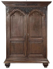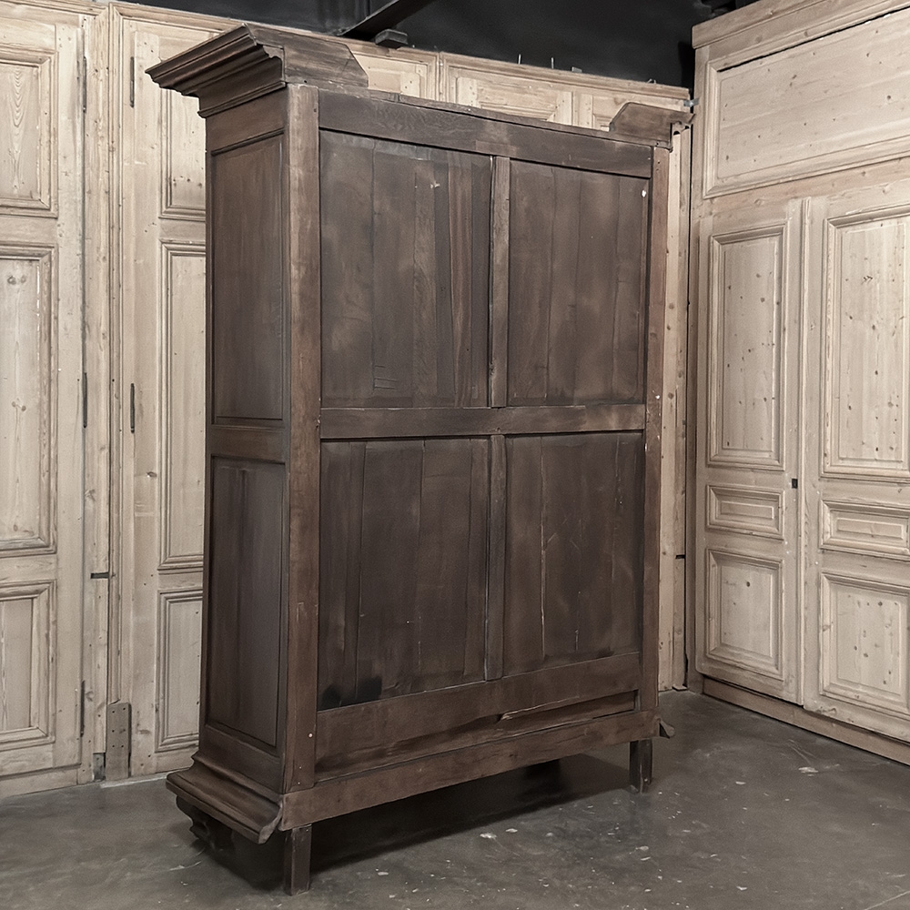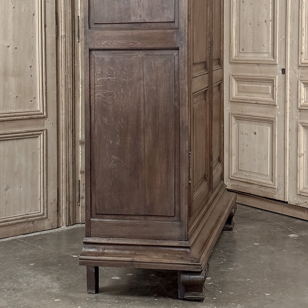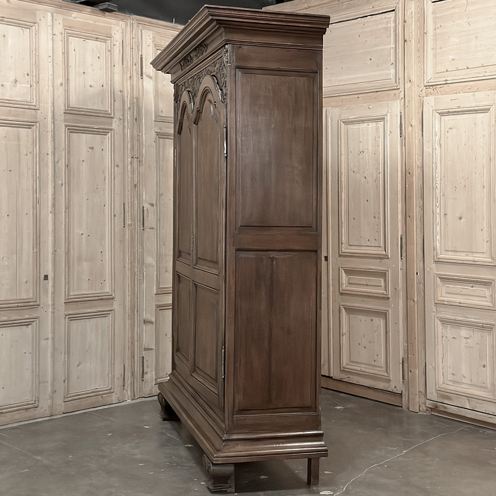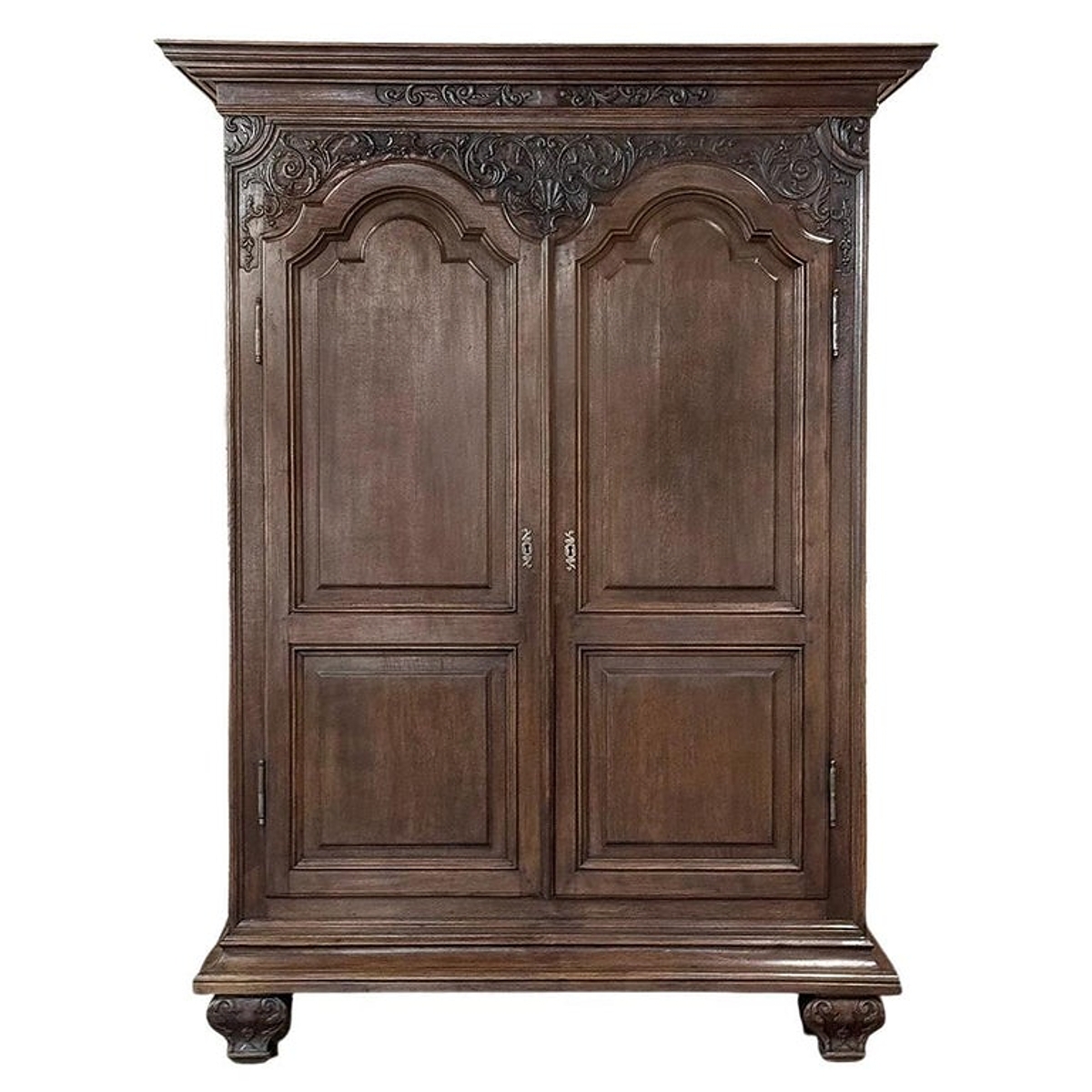 Grand 18th Century Country French Louis XIV Armoire was created for a spacious manoir, and is the perfect choice for large scale rooms and/or those who need extra storage in spades! Hand-crafted from dense, old-growth oak to last for centuries, it features a classically inspired architecture including bold molding on the crown and base, with arched doors that open wide on the steel barrel hinges for easy access. Note the intricate attention to detail in the molding on just the doors alone, with the frame closely following the contours of the raised panels set on two tiers. The most arresting feature of course is the amazing carved detail on the crown and bonnet, inspired by the Baroque movement that so captivated the Sun King. Even the urn-shaped feet below have received the attentions of the wood sculptor. Steel key guards complete the look.