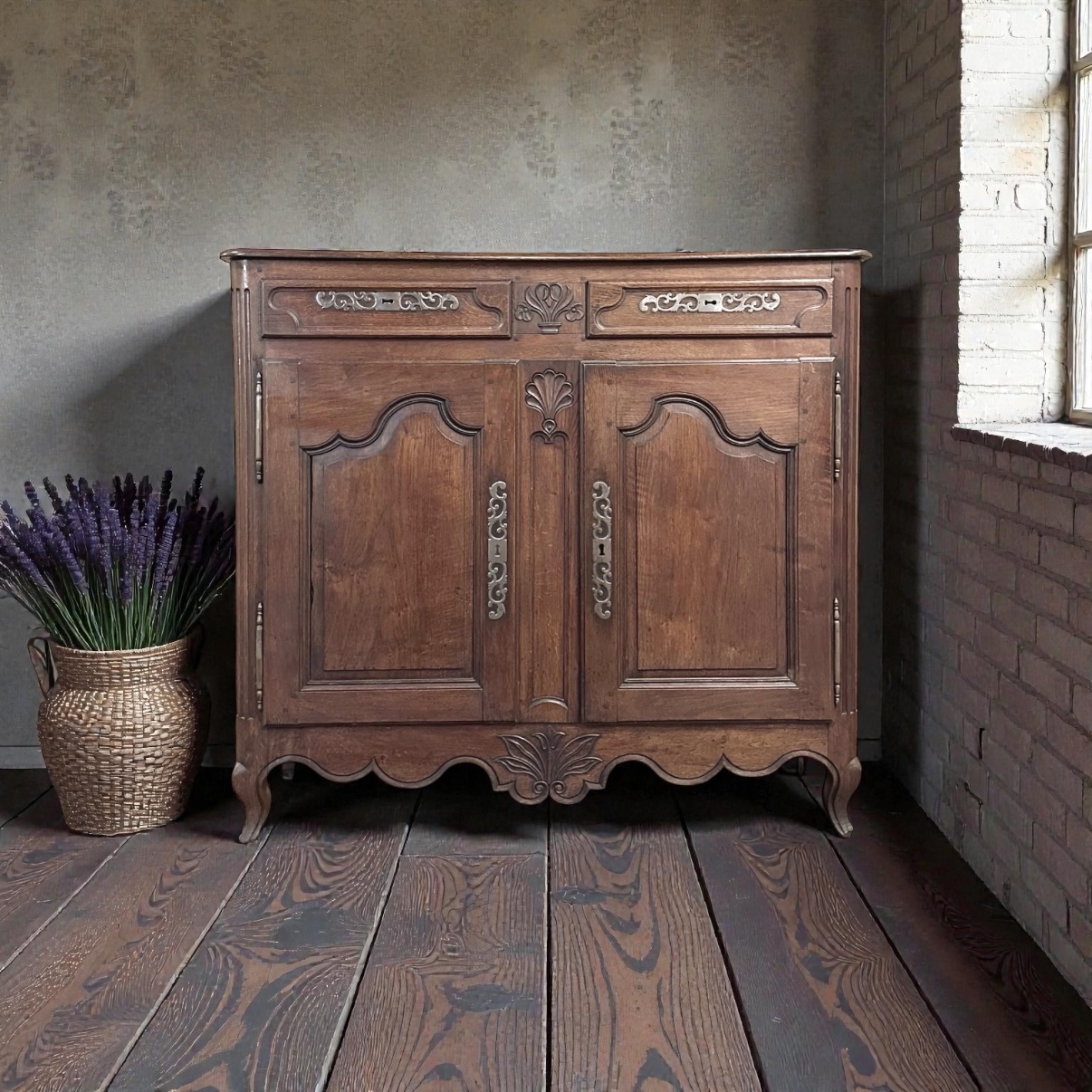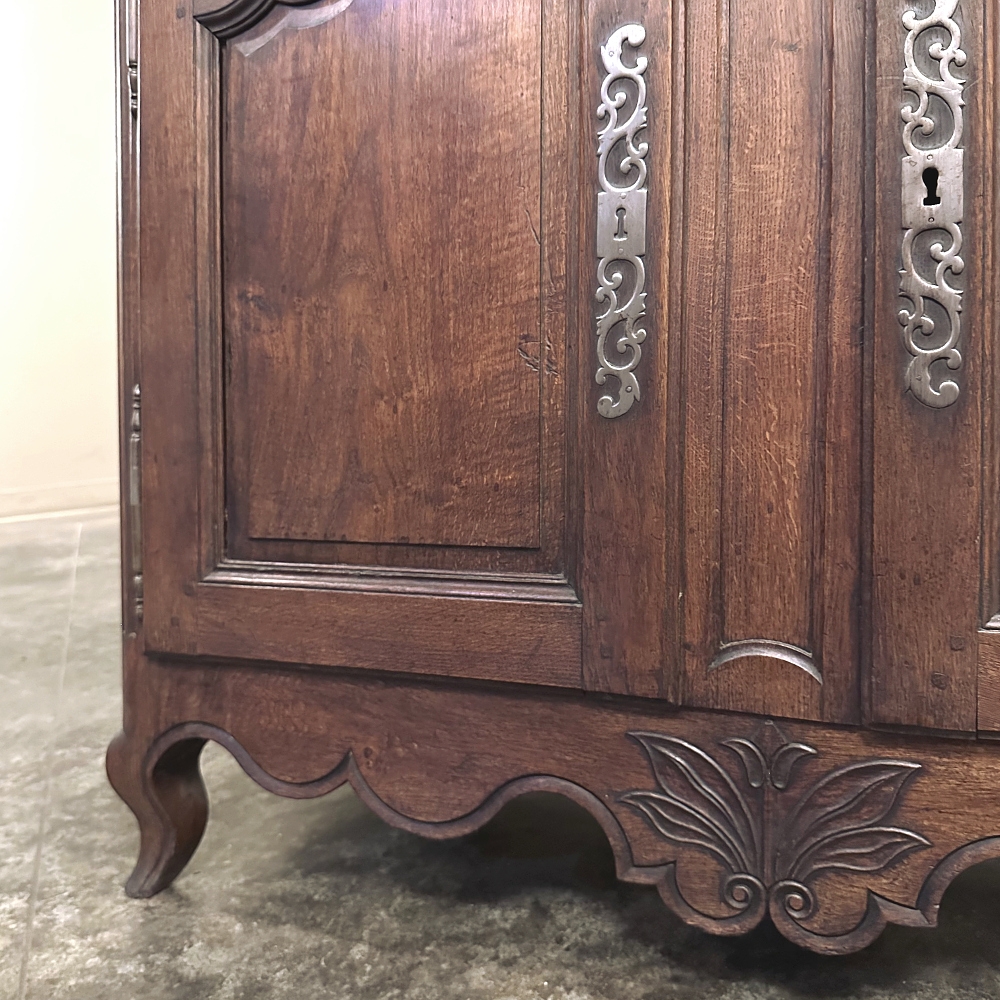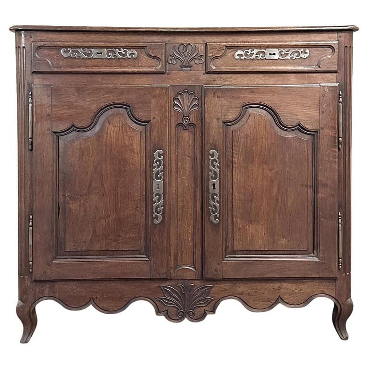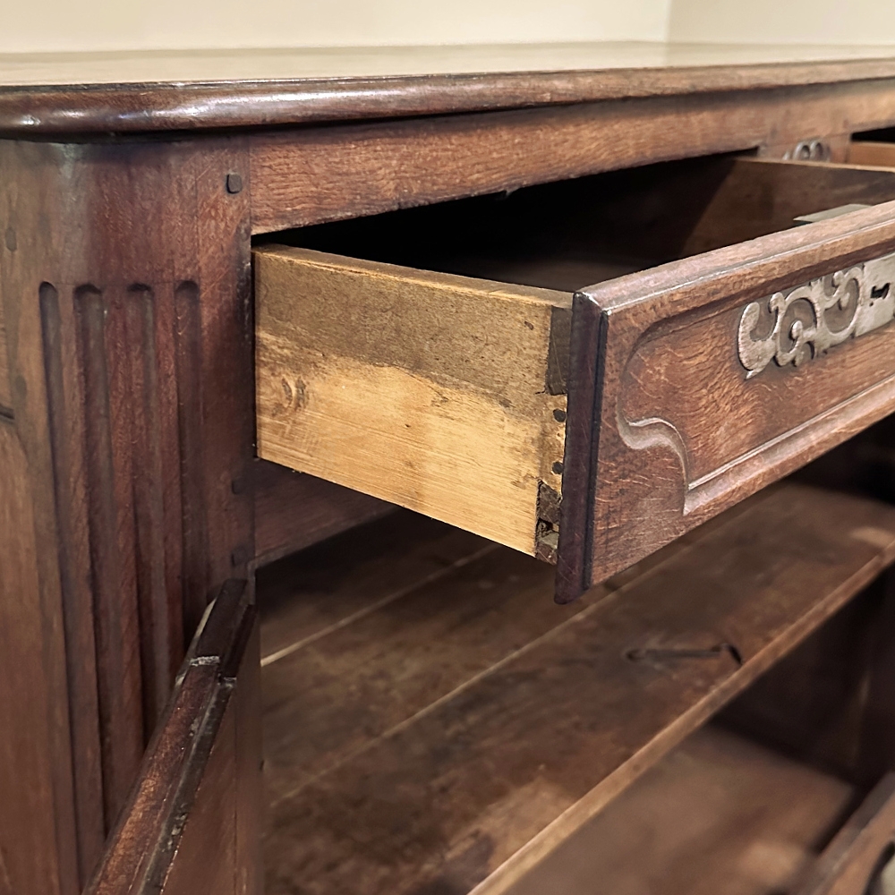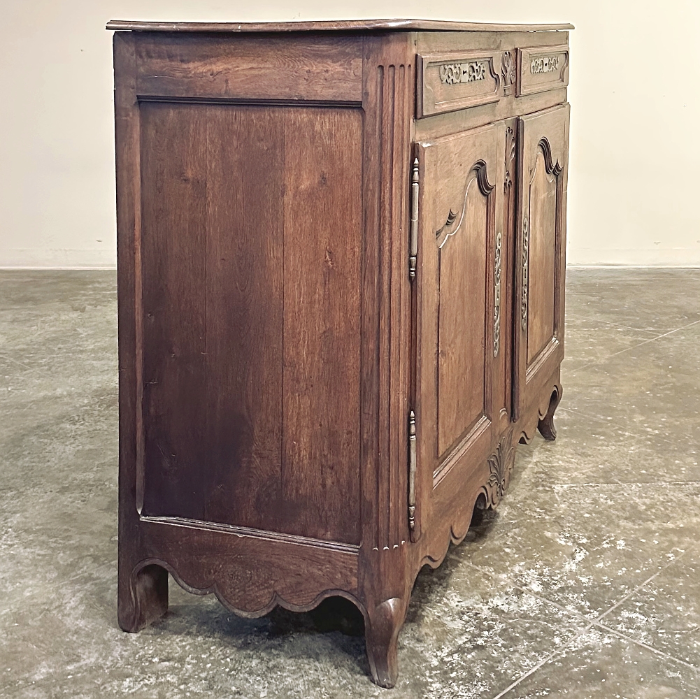 18th Century Country French Buffet is the quintessential provincial design, with the perfect combination of charm, style and functionality! Featuring construction of solid planks of old-growth indigenous oak to last for centuries (and it already has!), it features a plank top with beveled edge overlooking two spacious drawers and two cabinets that open wide with the stile attached to the left door, providing unfettered access to the capacious interior with one original shelf. Ornamentation is subtle but timeless, with French scrolled frameworks on the drawers and cabinet doors, and stylized shell and foliate motifs front and center carved right into the wood itself. Fancy steel key guards and strong barrel hinges add a nice touch, as does the undulating apron with scrolled legs. Ideal for any room and any family!