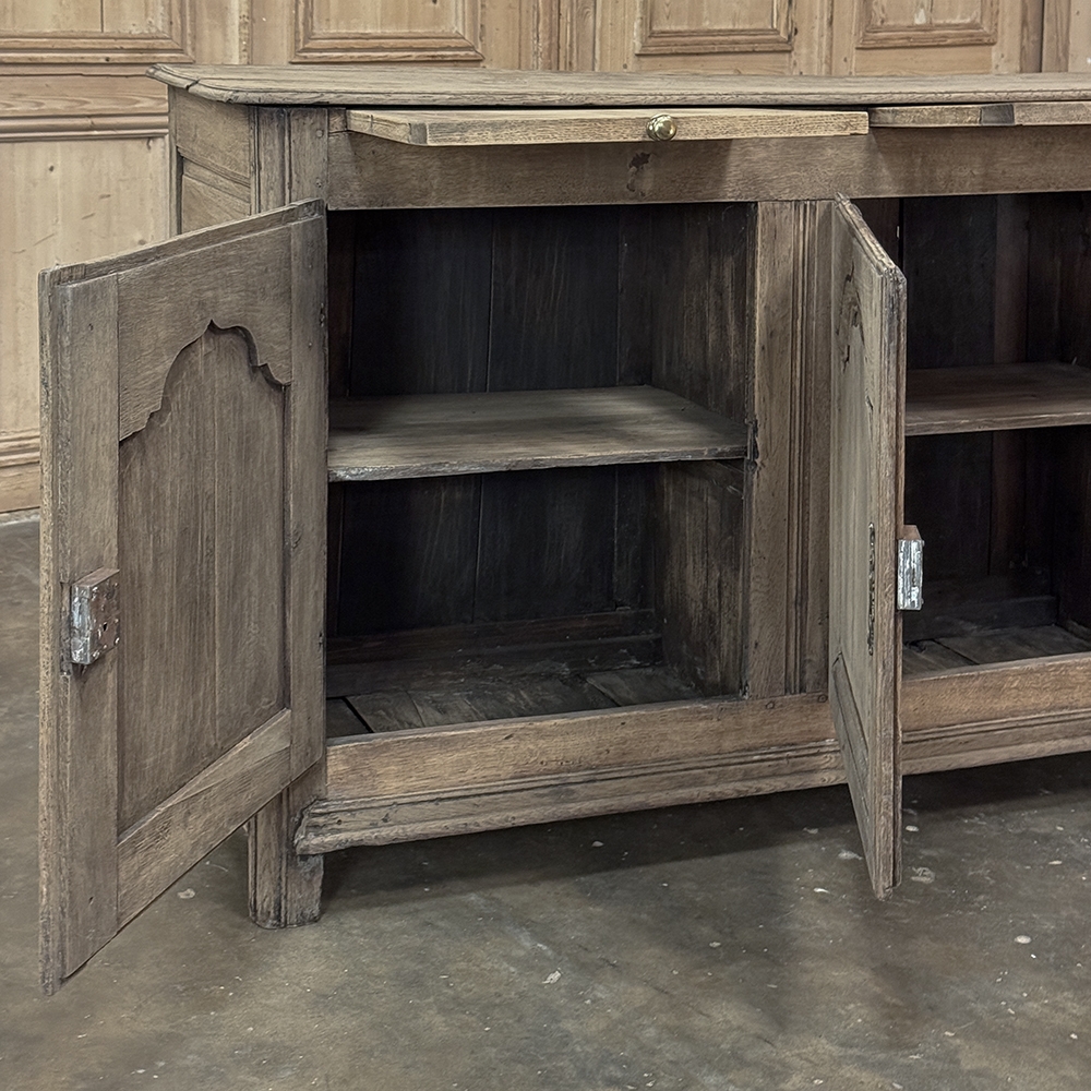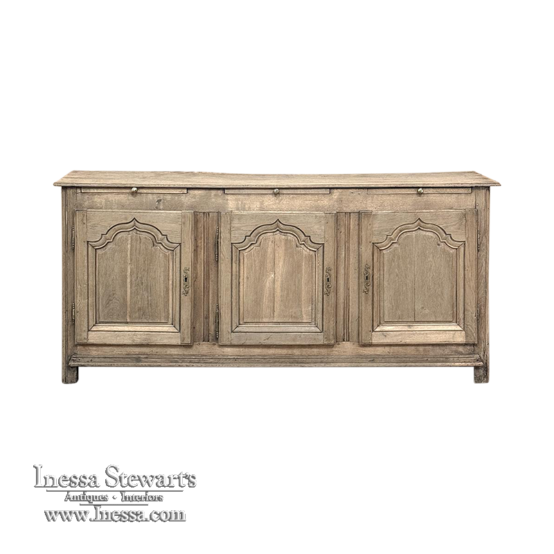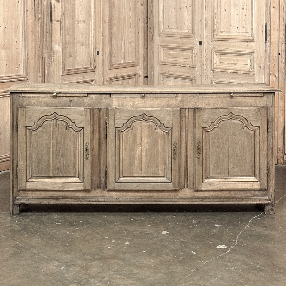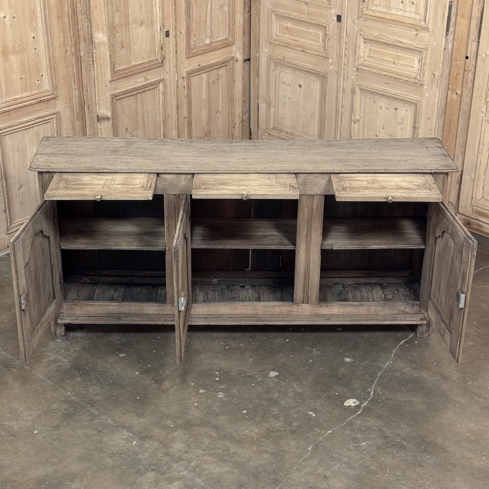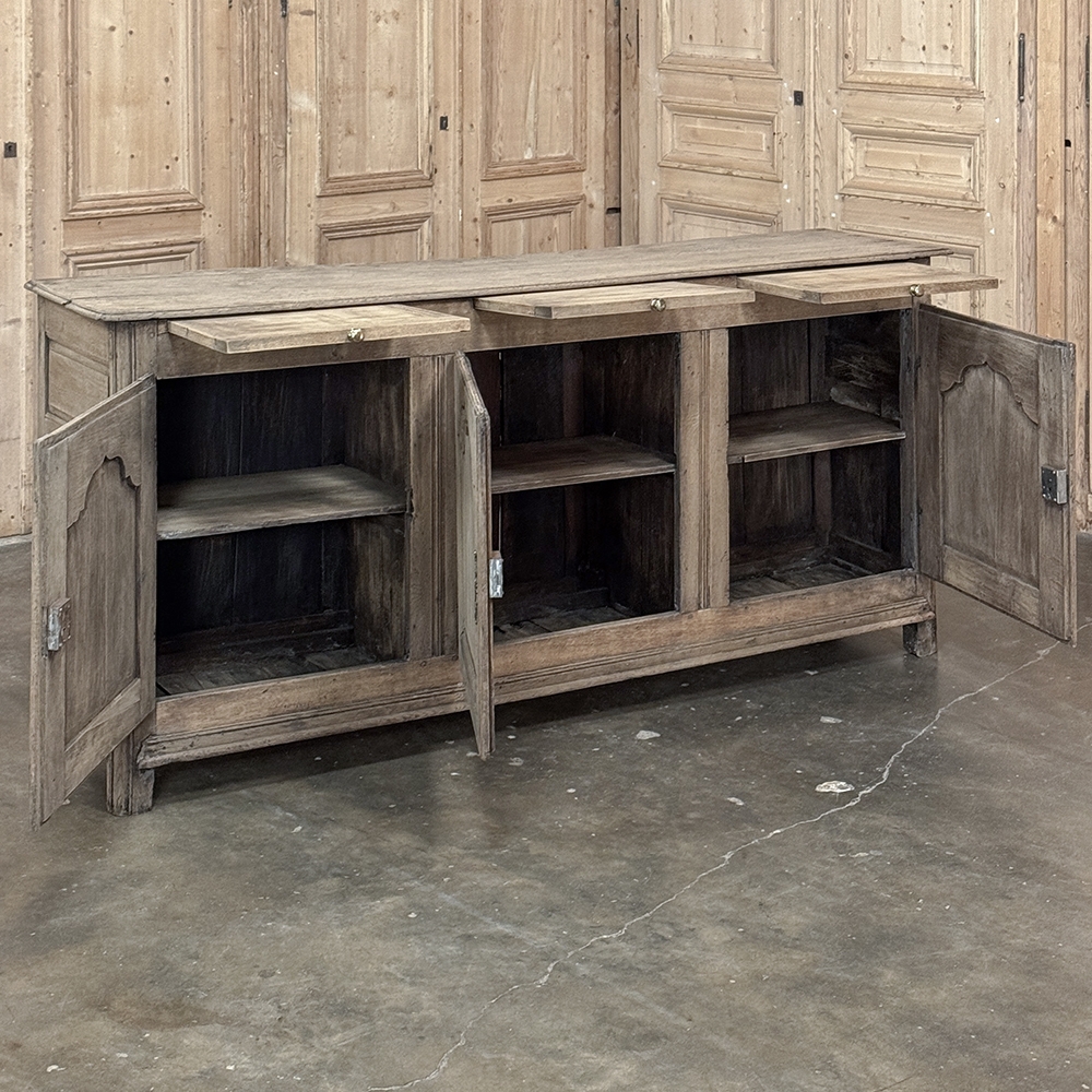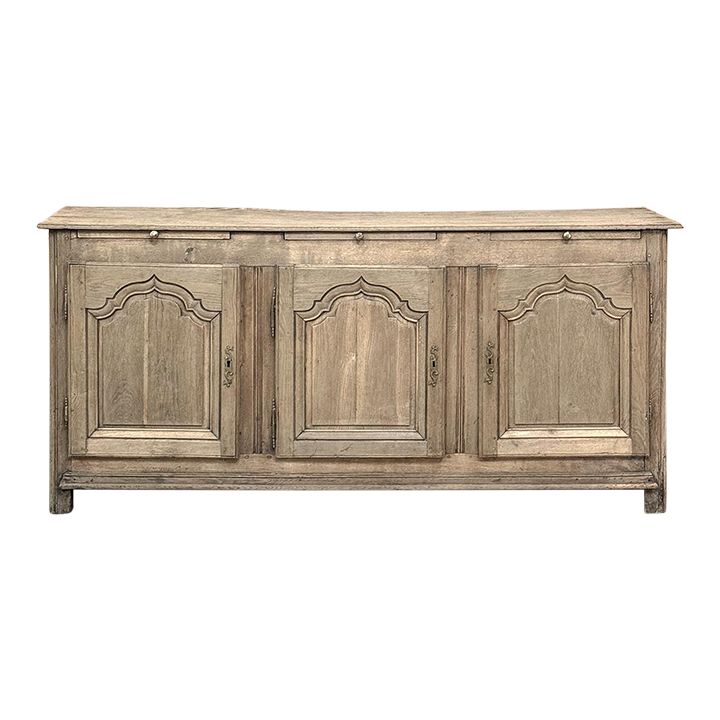 18th Century Country French Buffet ~ Credenza ~ Enfilade will make a marvelous addition to any room, especially the office! Hand-crafted from dense, old-growth oak, it was literally designed to last for centuries. The solid plank top is ideal for display or as a working surface, yet is less than a foot and a half deep conserving floor space and friendly to traffic patterns in the room. Just underneath the planks of the top are three pull-out surface extensions, adding a layer of functionality that's hard to beat. Below them are three cabinet doors, each fitted with arched raised & recessed panels that open wide thanks to brass barrel hinges revealing surprising storage inside considering the overall depth. Tailored molding detail and brass key guards finish out the timeless visual appeal. Painstakingly stripped using our proprietary process that retains the patina and sheer natural beauty of the old wood, all performed by our expert in-house staff.