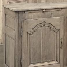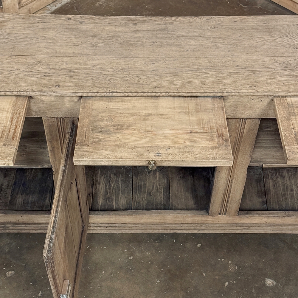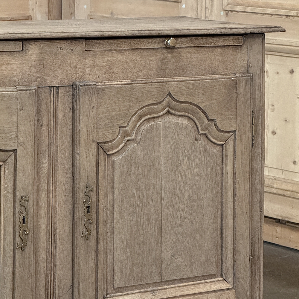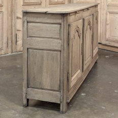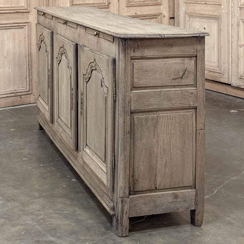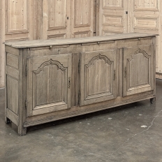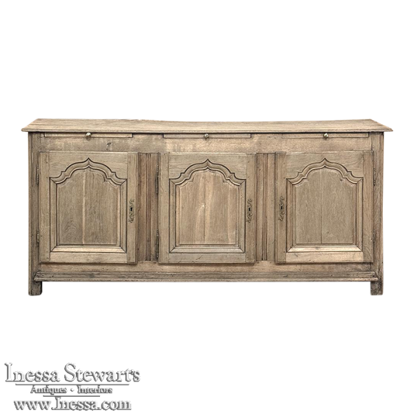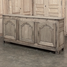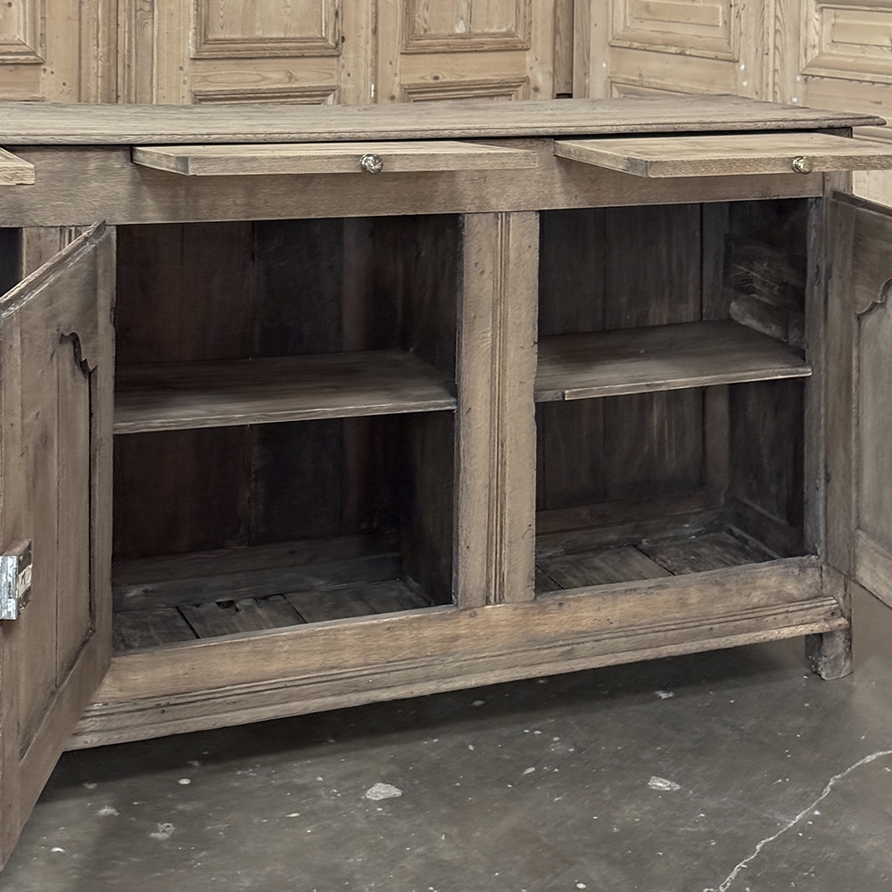 18th Century Country French Buffet ~ Credenza ~ Enfilade will make a marvelous addition to any room, especially the office! Hand-crafted from dense, old-growth oak, it was literally designed to last for centuries. The solid plank top is ideal for display or as a working surface, yet is less than a foot and a half deep conserving floor space and friendly to traffic patterns in the room. Just underneath the planks of the top are three pull-out surface extensions, adding a layer of functionality that's hard to beat. Below them are three cabinet doors, each fitted with arched raised & recessed panels that open wide thanks to brass barrel hinges revealing surprising storage inside considering the overall depth. Tailored molding detail and brass key guards finish out the timeless visual appeal. Painstakingly stripped using our proprietary process that retains the patina and sheer natural beauty of the old wood, all performed by our expert in-house staff.