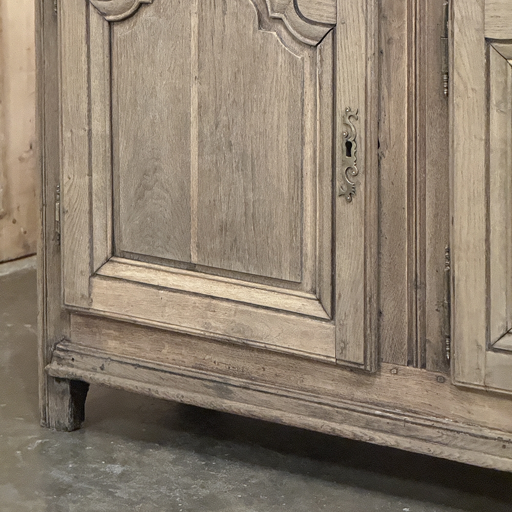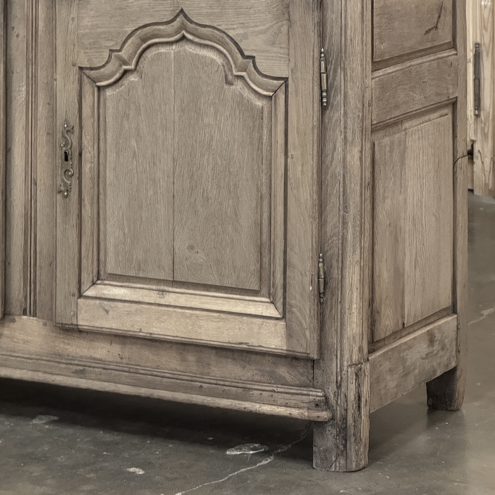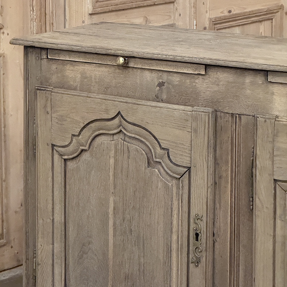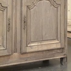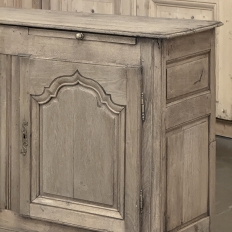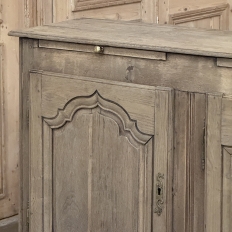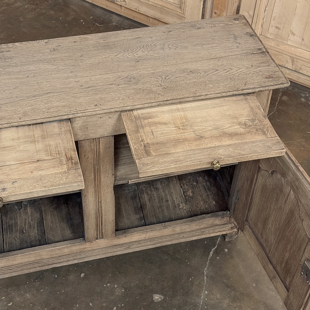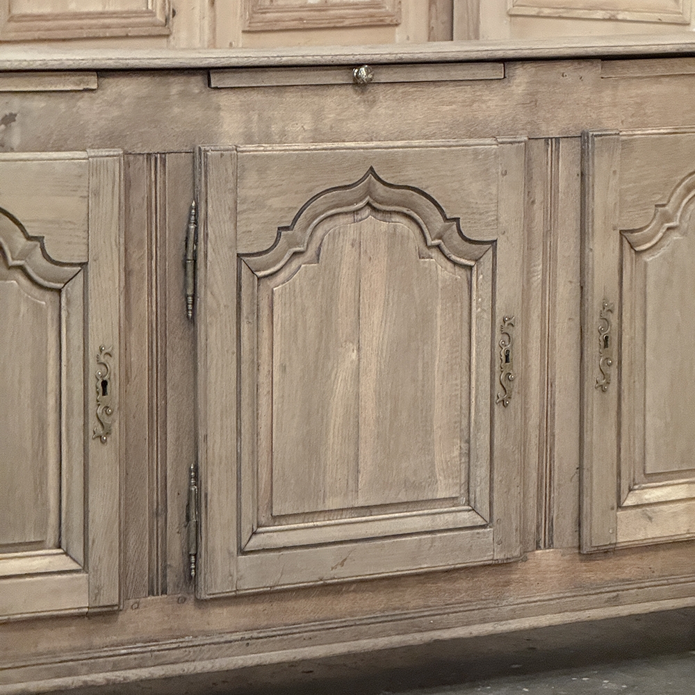 18th Century Country French Buffet ~ Credenza ~ Enfilade will make a marvelous addition to any room, especially the office! Hand-crafted from dense, old-growth oak, it was literally designed to last for centuries. The solid plank top is ideal for display or as a working surface, yet is less than a foot and a half deep conserving floor space and friendly to traffic patterns in the room. Just underneath the planks of the top are three pull-out surface extensions, adding a layer of functionality that's hard to beat. Below them are three cabinet doors, each fitted with arched raised & recessed panels that open wide thanks to brass barrel hinges revealing surprising storage inside considering the overall depth. Tailored molding detail and brass key guards finish out the timeless visual appeal. Painstakingly stripped using our proprietary process that retains the patina and sheer natural beauty of the old wood, all performed by our expert in-house staff.
