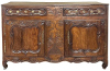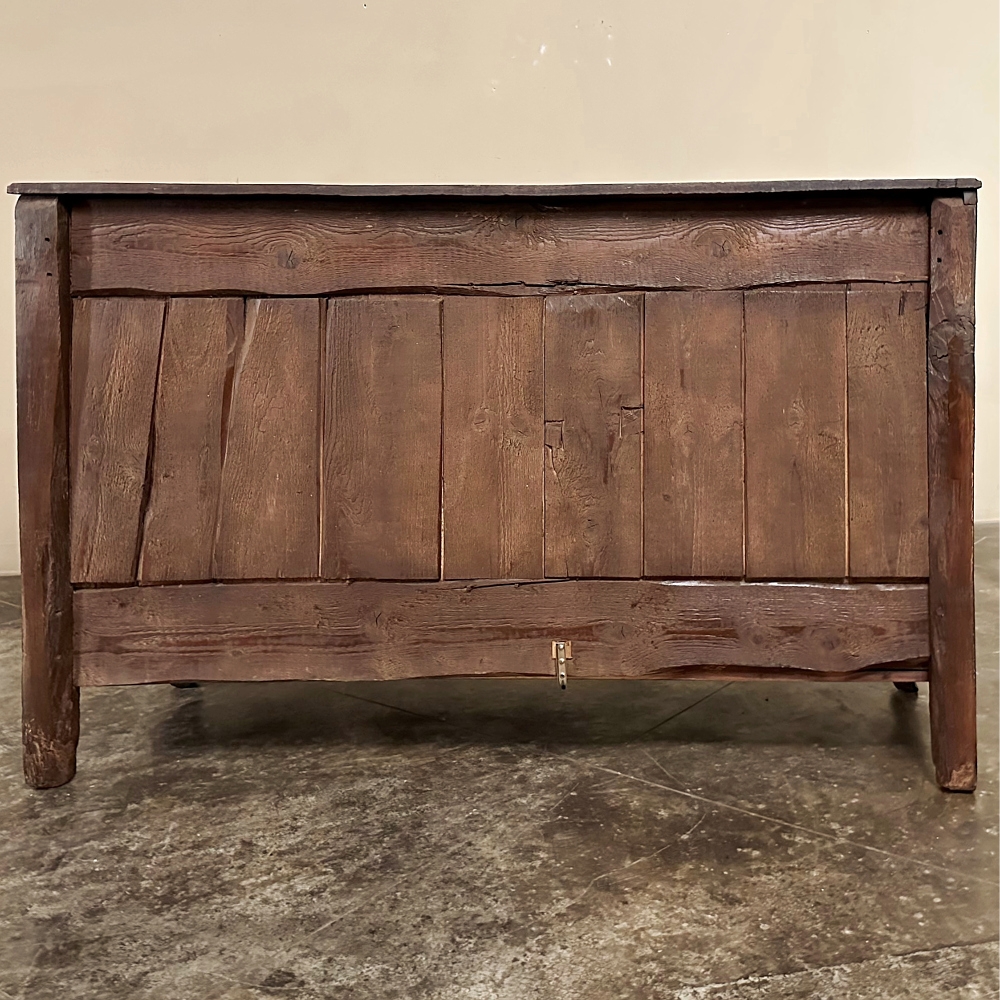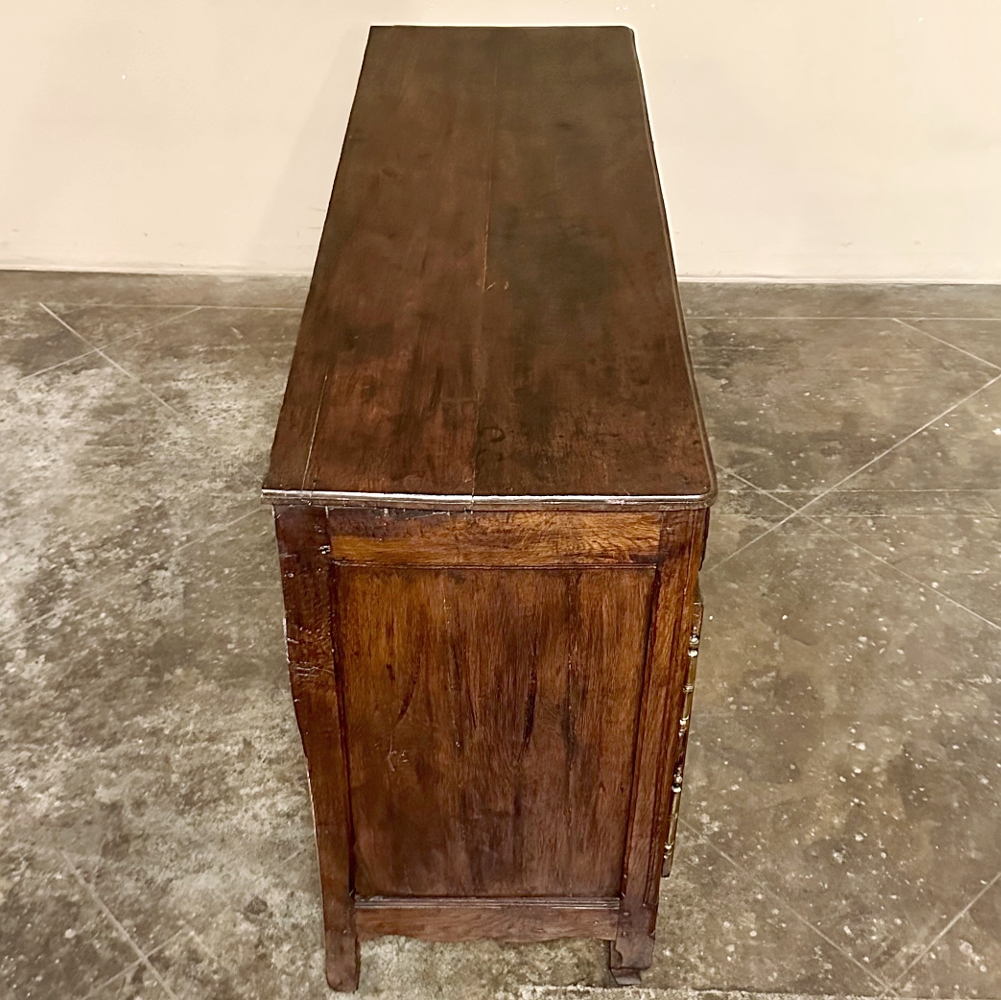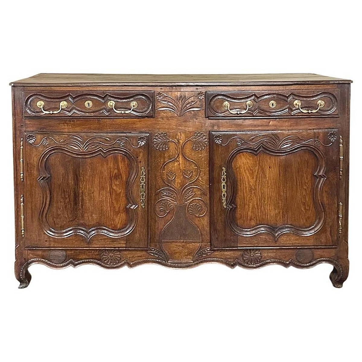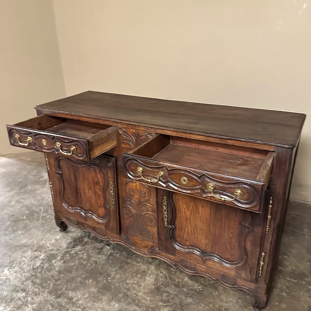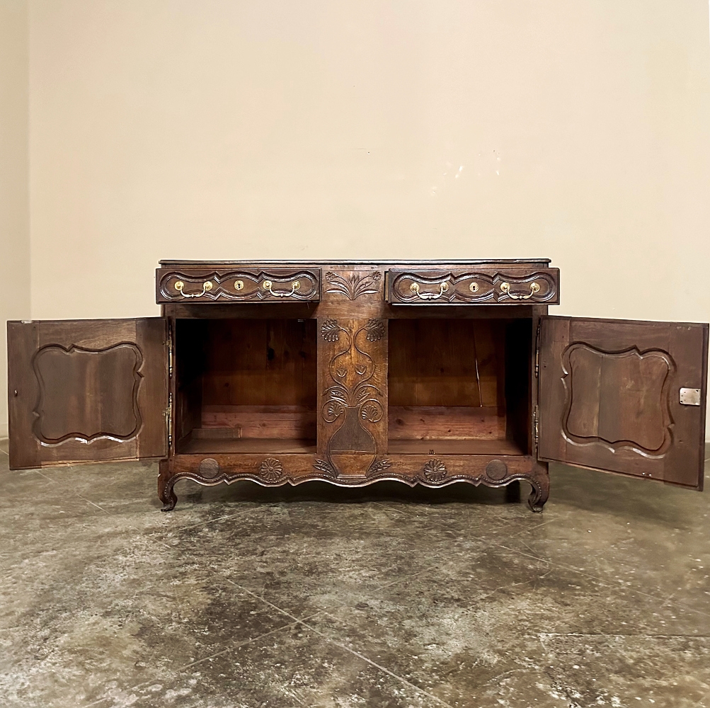18th Century Country French Buffet from Lower Brittany is a classic example of the charming furniture produced in the region completely by hand during this period. Utilizing techniques handed down from generation to generation, it features pegged mortise & tenon joinery throughout, with solid planks of old growth indigenous French oak making for an heirloom piece designed to literally last for centuries! The plank top overlooks the substantial casework fitted with two spacious drawers and two yawning cabinet doors opening up to capacious storage. Solid brass hinges, bale pulls and key guards add a nice visual accent but the carved detail celebrating nature's bounty for which the region has been amply blessed, steals the show! Scrolled door panels and apron complete the look.