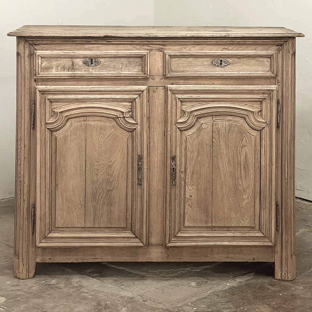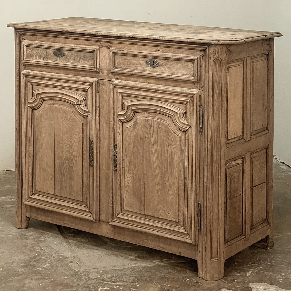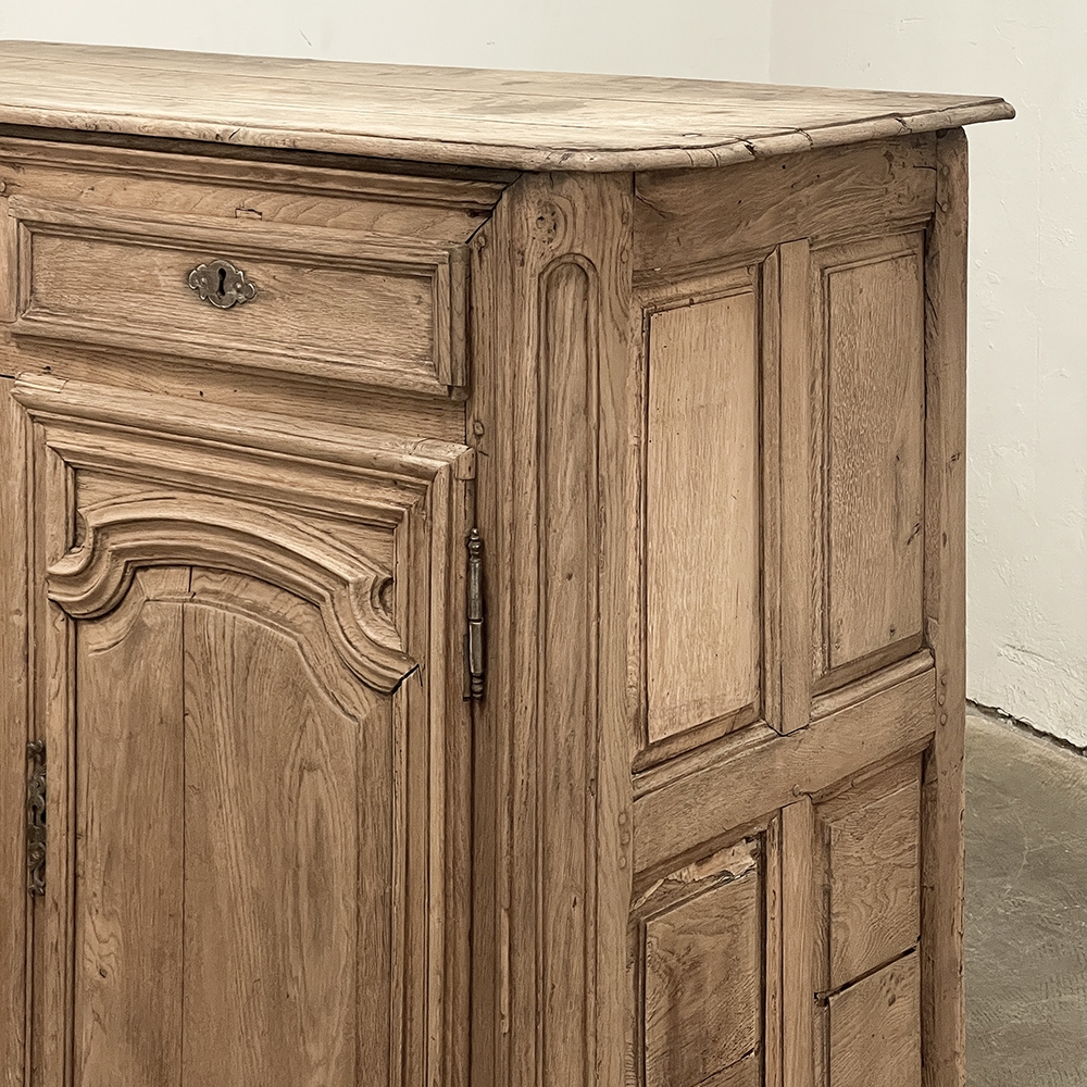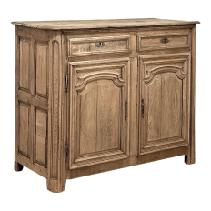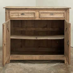 18th Century Country French Buffet in Stripped Oak is a testament to the rural artisans who produced amazing works of cabinetry using what today would be considered primitive tools. Taking advantage of the abundant old-growth oak in the region, they used solid planks from top to bottom, even hand-hewn solid planks for the back panels! Tailored molding creates visual interest throughout the design, including four raised panels on each side, and arched panels on each door. Hand-forged steel key guards and barrel hinges ensure centuries of daily carefree use. Doors and drawers open to reveal cavernous storage, which combined with the generous serving & display surface make this instant family heirloom as functional as it is pleasing to behold!