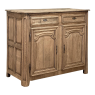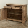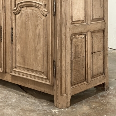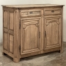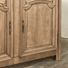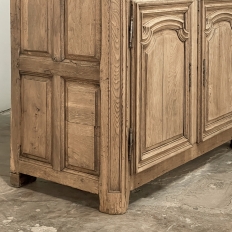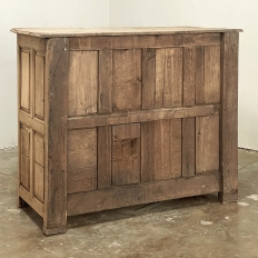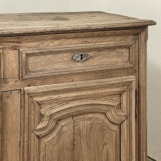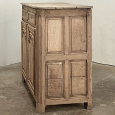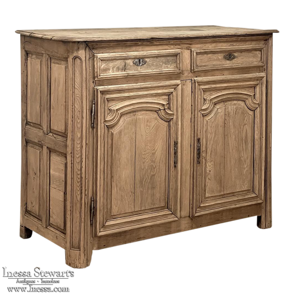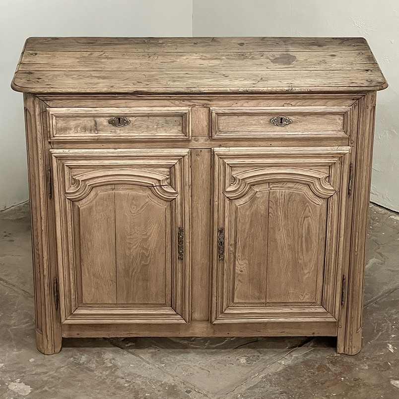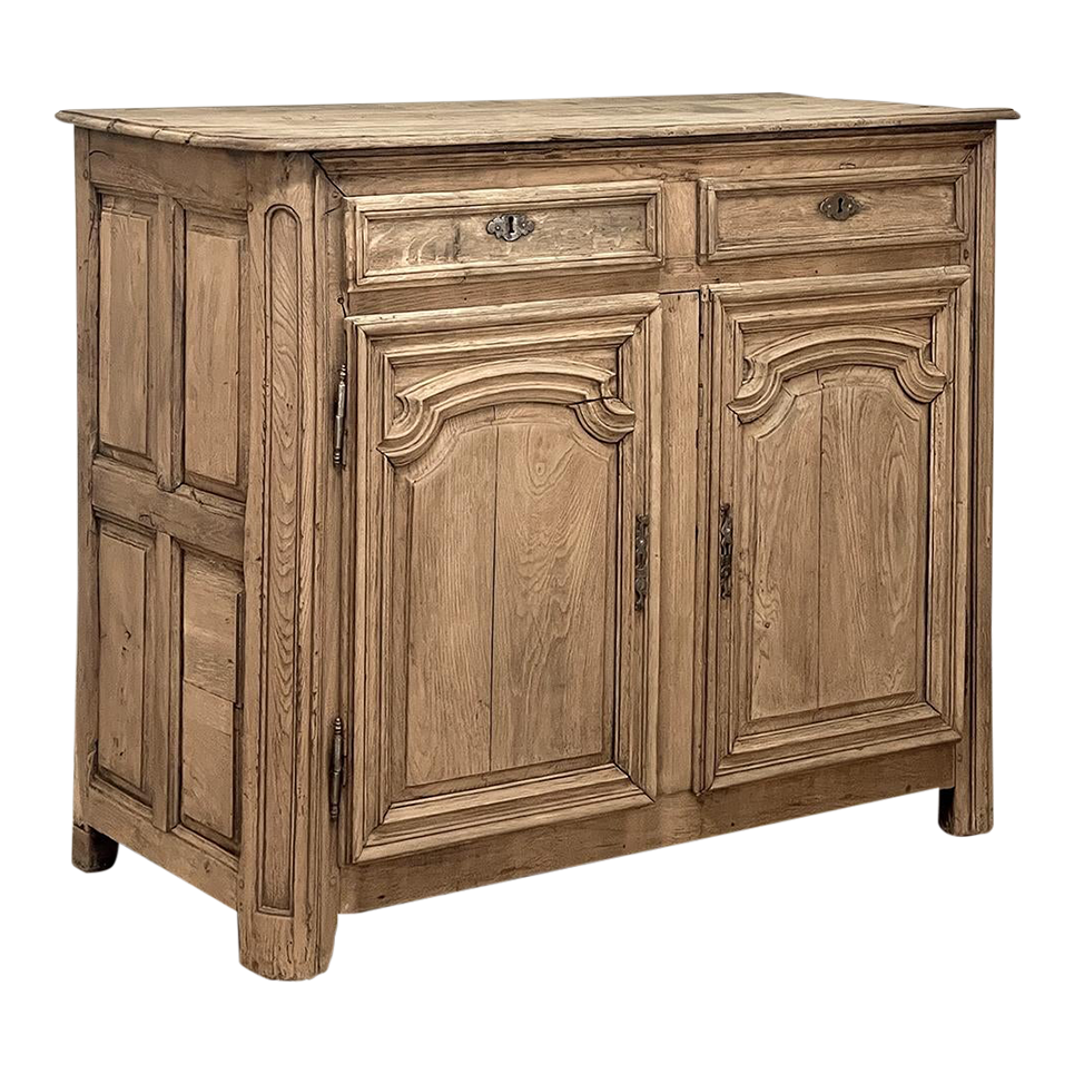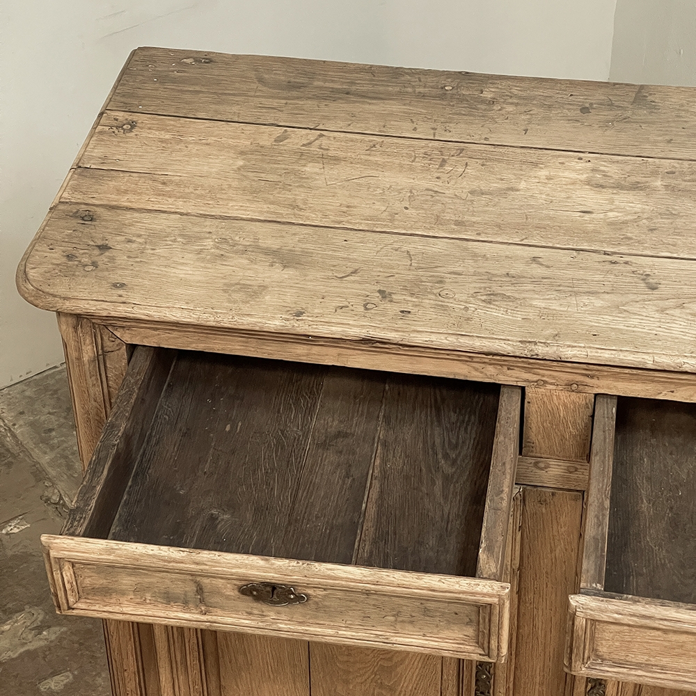 18th Century Country French Buffet in Stripped Oak is a testament to the rural artisans who produced amazing works of cabinetry using what today would be considered primitive tools. Taking advantage of the abundant old-growth oak in the region, they used solid planks from top to bottom, even hand-hewn solid planks for the back panels! Tailored molding creates visual interest throughout the design, including four raised panels on each side, and arched panels on each door. Hand-forged steel key guards and barrel hinges ensure centuries of daily carefree use. Doors and drawers open to reveal cavernous storage, which combined with the generous serving & display surface make this instant family heirloom as functional as it is pleasing to behold!