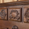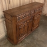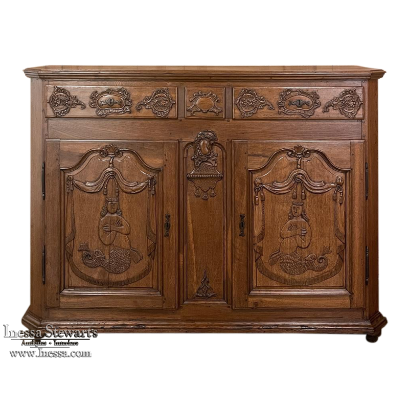 Sale18th Century Country French Buffet with Mermaids is a very unusual example of hand-crafted excellence, rendered from old-growth indigenous oak to last for centuries! Crafted on what was then considered a grand scale, such pieces were not only designed to beautify one's room but also provide essential storage for all the family's keepsake china, flatware and glassware. The unique adornment of this particular example would indicate it was produced for a seafaring family, most probably merchants or with a naval service background. Stylized shells and naturalistic forms adorn the drawer tier, which consists of two spacious drawers centered with a smaller cutlery drawer. The center stile under the cutlery drawer features asymmetrical shell and corbel motifs with tassels and separates the two cabinet doors carved with modest mermaids. Fabric with fringe and ropes with tassels appear throughout the design, and the original steel keyguards on the doors and drawers are still intact. Steel hinges mounted outboard allow the doors to swing wide to reveal the cavernous storage within. One lock on the left door is original, while the right door's lock was replaced when the piece was rejuvenated during the late 19th century, as evidenced elsewhere in the casework.
