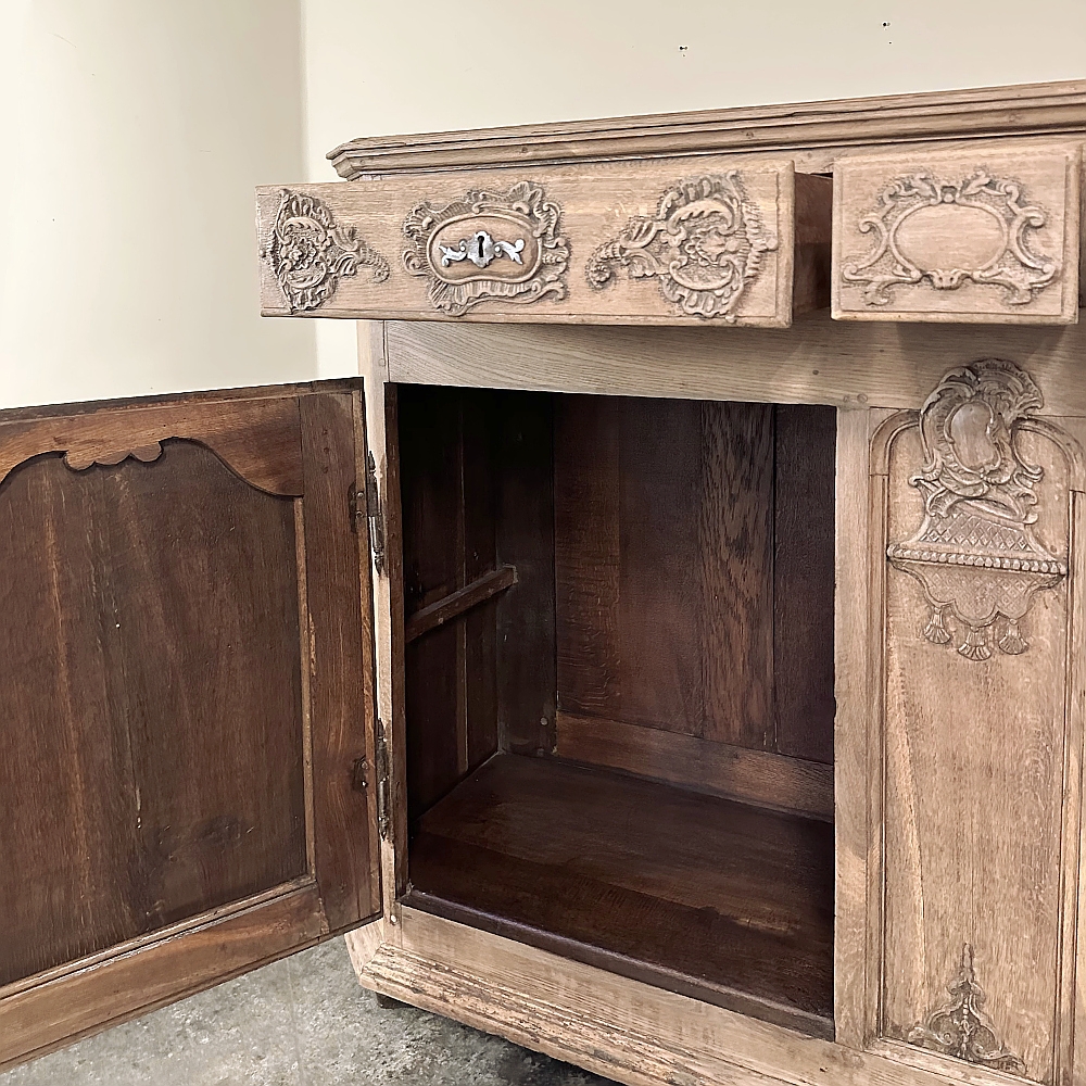 SaleA rare and character-rich buffet from the Liège region of current day Belgium, dating to the early 18th century and firmly rooted in the Régence period. The carving reflects the transition from the symmetry of Louis XIV toward the more fluid, expressive ornament that would define the Louis XV era—lively, sculptural, and full of movement.