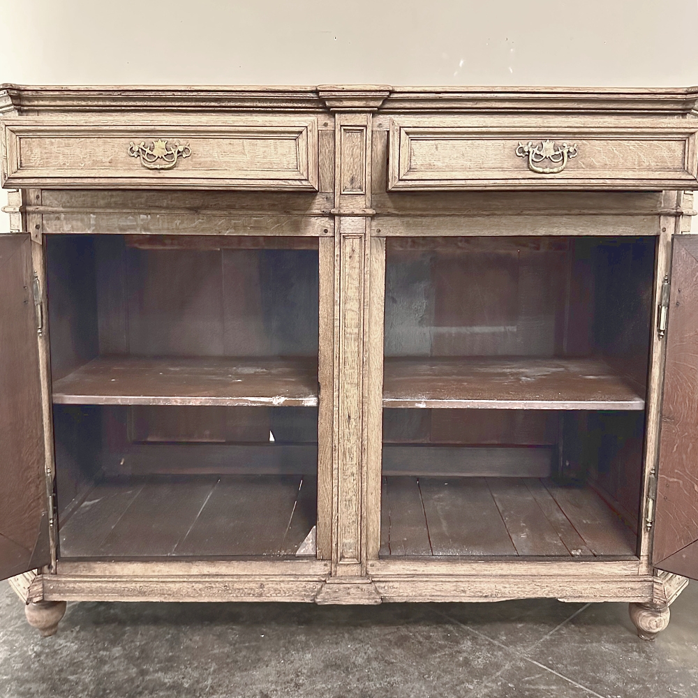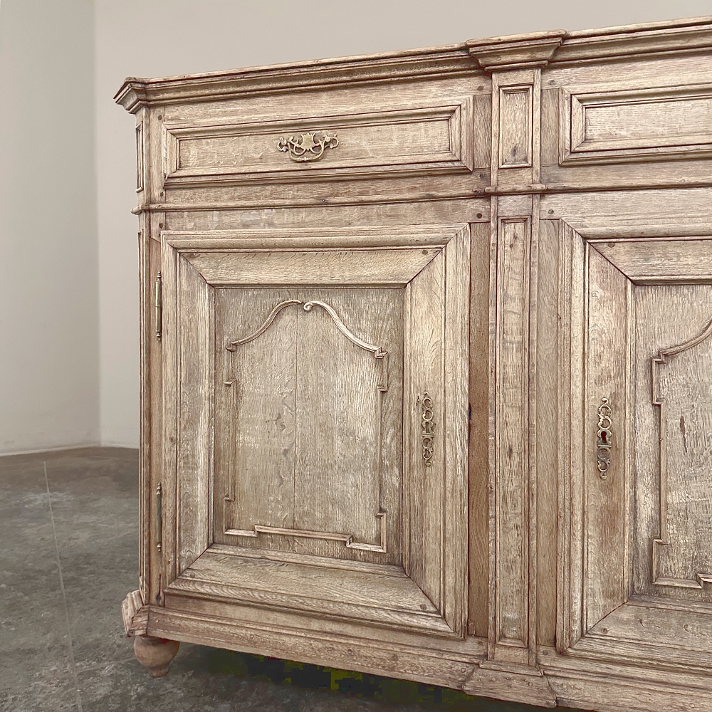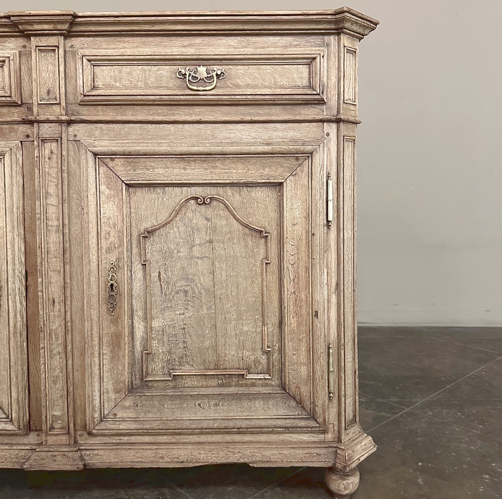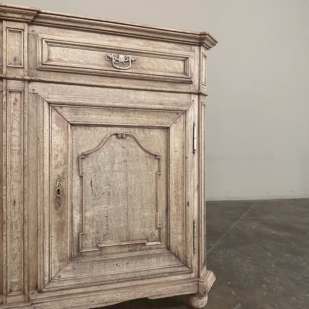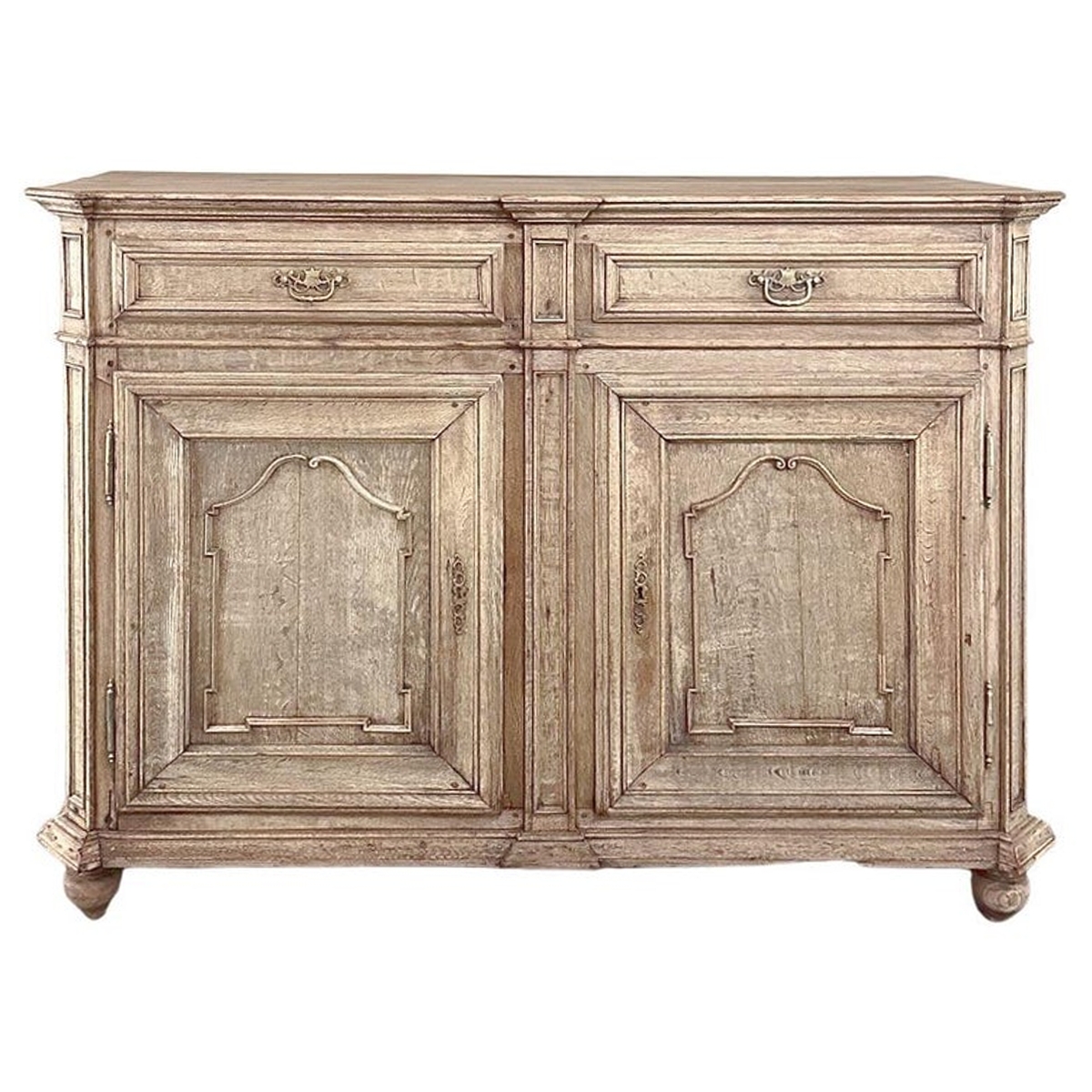Sale18th Century Country French Louis XIII Buffet in Stripped Oak provides the epitome of understated elegance while serving as a capacious storage piece for all your cherished family heirlooms! Hand-crafted by master artisans using what are today considered primitive tools, the design called for a tall piece for a room with a grand scale, and incorporates an upper drawer tier above the spacious cabinets below. Tailored molding is apparent throughout the design, emphasizing the mitered corners and subtle step-out design of the corners complementing the center pilaster. A stylized arched design appears on each door, rendered from fine molding detail, and surrounded by the framework of the door. Even more tailored is the framework around each drawer above. Finely cast brass key guards and bale pulls work with the exterior brass hinges. Pegged mortise & tenon joints appear throughout the design, all supported by urn-shaped feet. The backing has been relatively recently replaced, but will not be seen when the piece is placed against a wall. Painstakingly stripped using our proprietary process that retains the patina and sheer natural beauty of the old wood, all performed by our expert in-house staff.