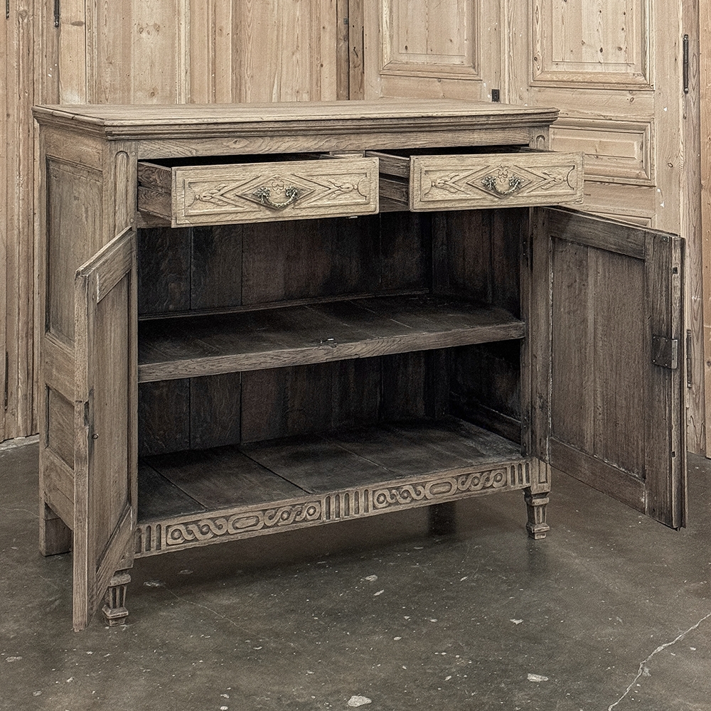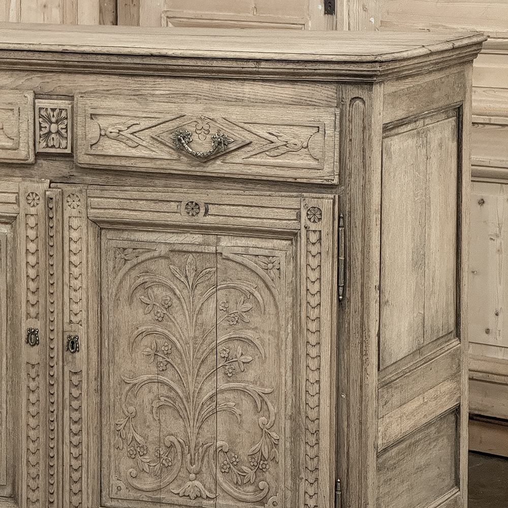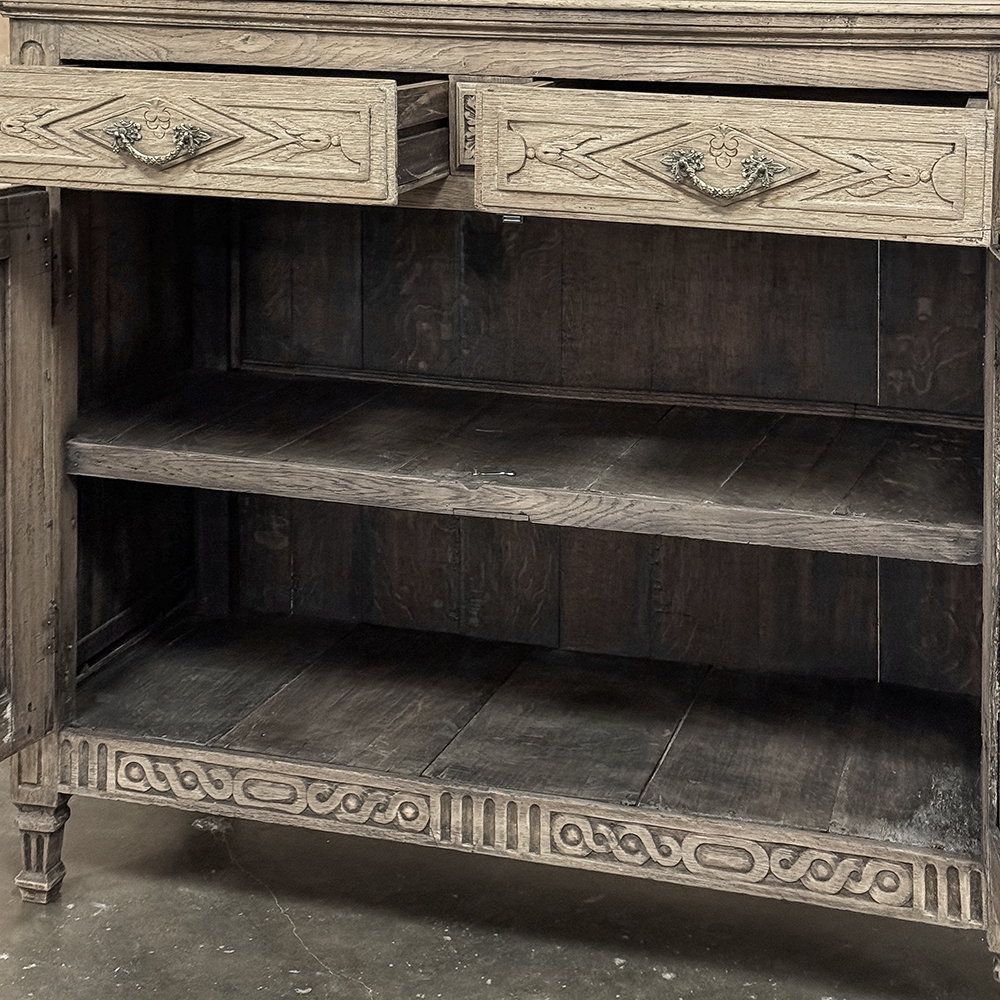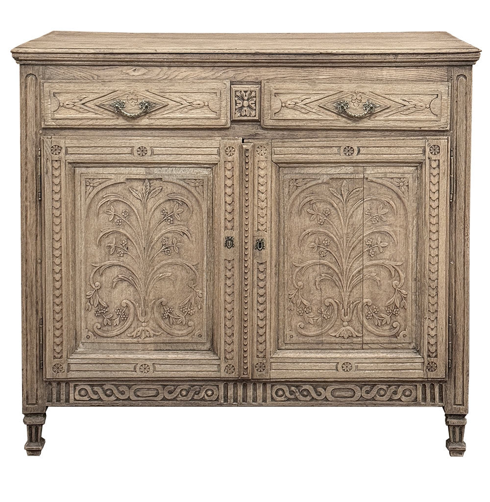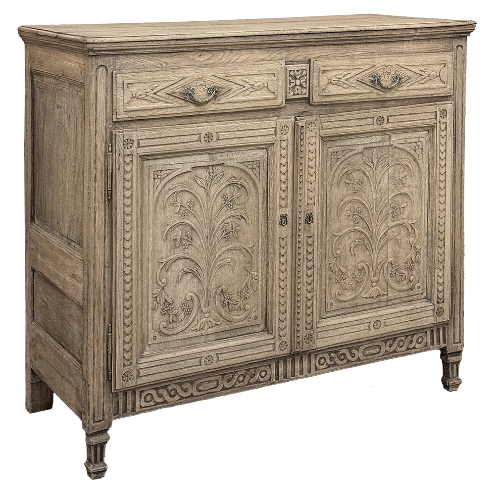 18th Century Country French Louis XVI Buffet in Stripped Oak is a period piece that exemplifies the artistry and traditional craftsmanship of the rural cabinetmaker during the period. Utilizing dense, old-growth oak, the casework was fashioned with neoclassical lines and features a molded crown around the generous serving & display surface, which overlooks two panels on each side, and the entire front facade which features an unusual carved display. The pair of drawers use a diamond shaped theme made more prolific in subsequent years, but in this case retaining their classical influence with foliate adornment in relief and intaglio style. The drawers are separated by a carved rosette, and each features cast brass bale pulls showing fine detail. The cabinet doors below are works of art, with superlative stylized foliate and floral designs in bas relief framed by quatrefoil overlay and rosettes, then punctuated with cast brass key guards. Both doors are hung with high-quality brass hinges. The apron below is of a unique design, with a variation on Greek coin accented with vertical flutes. Tapered and carved legs provide support. The doors open wide to reveal capacious storage, making this piece as functional as it is beautiful to behold!