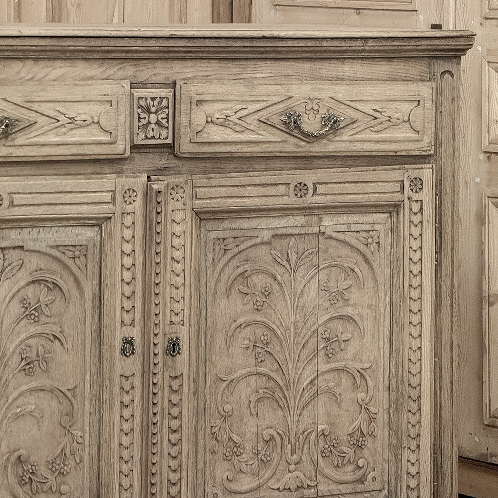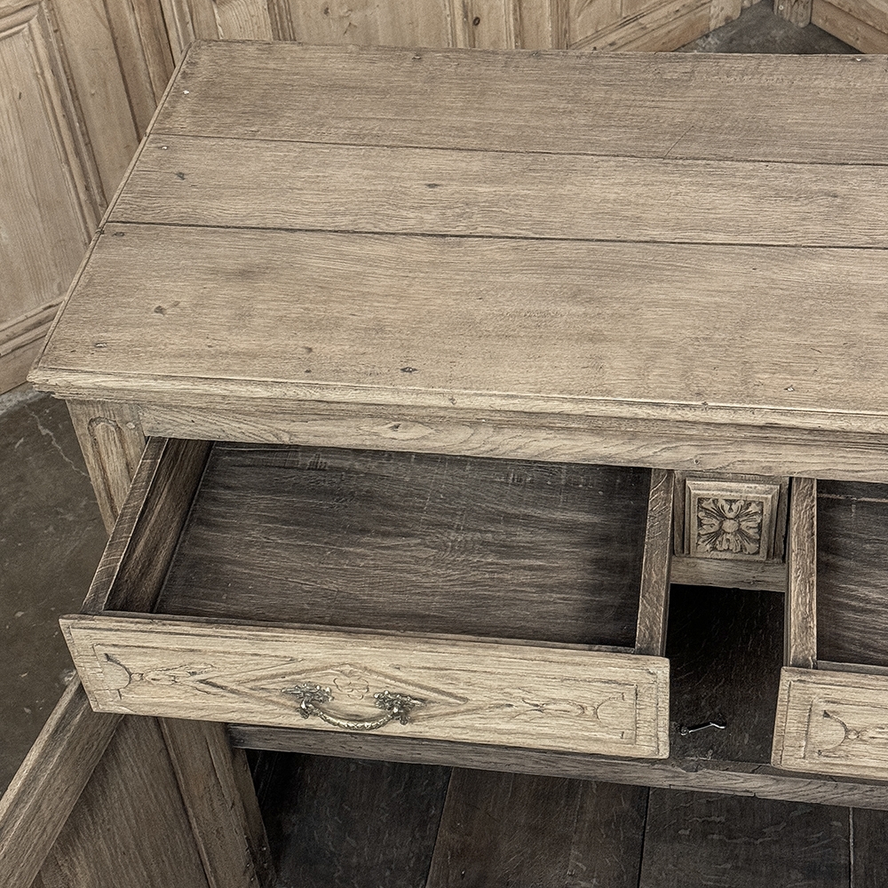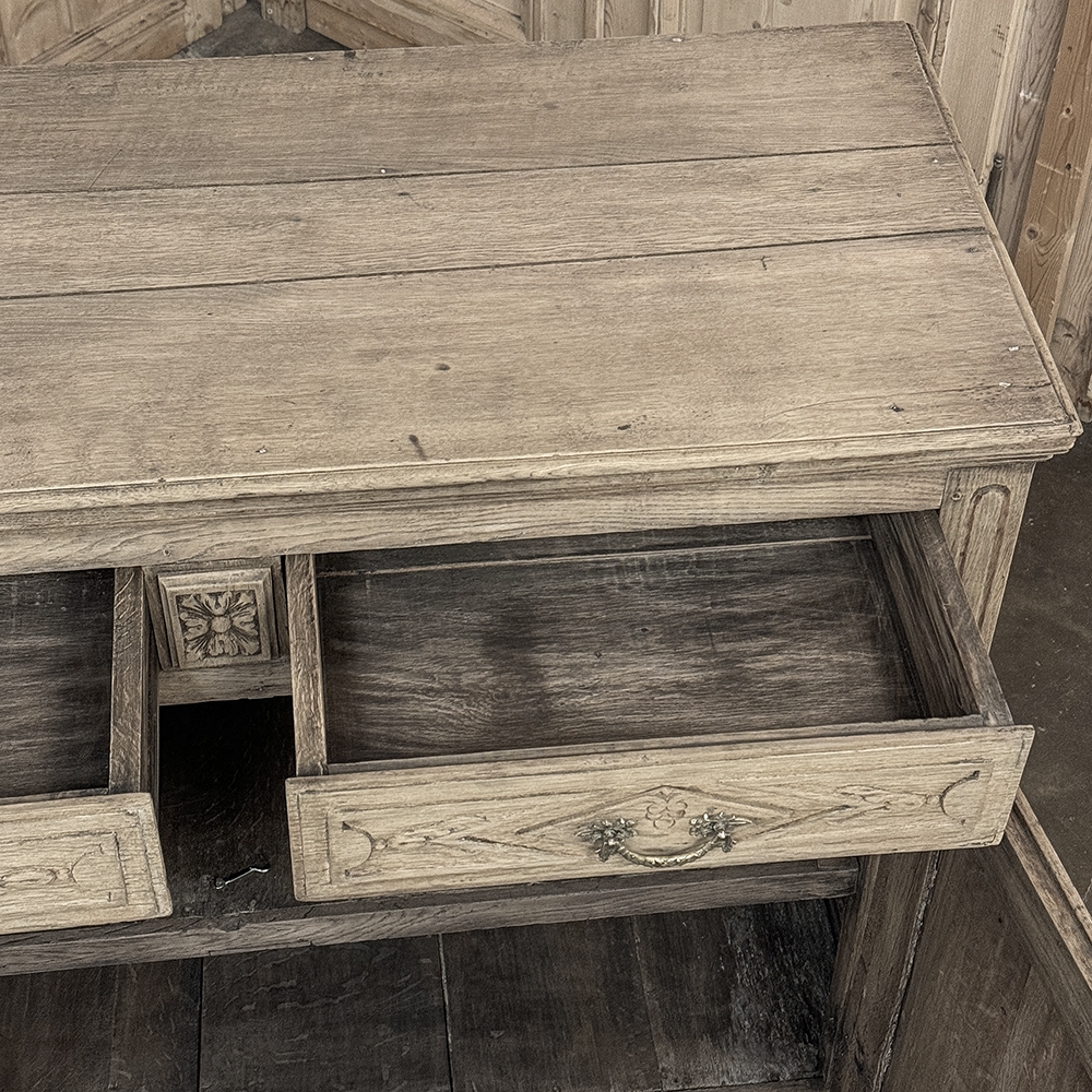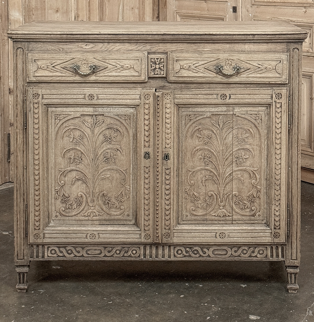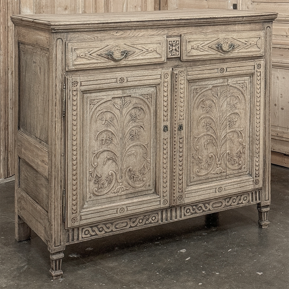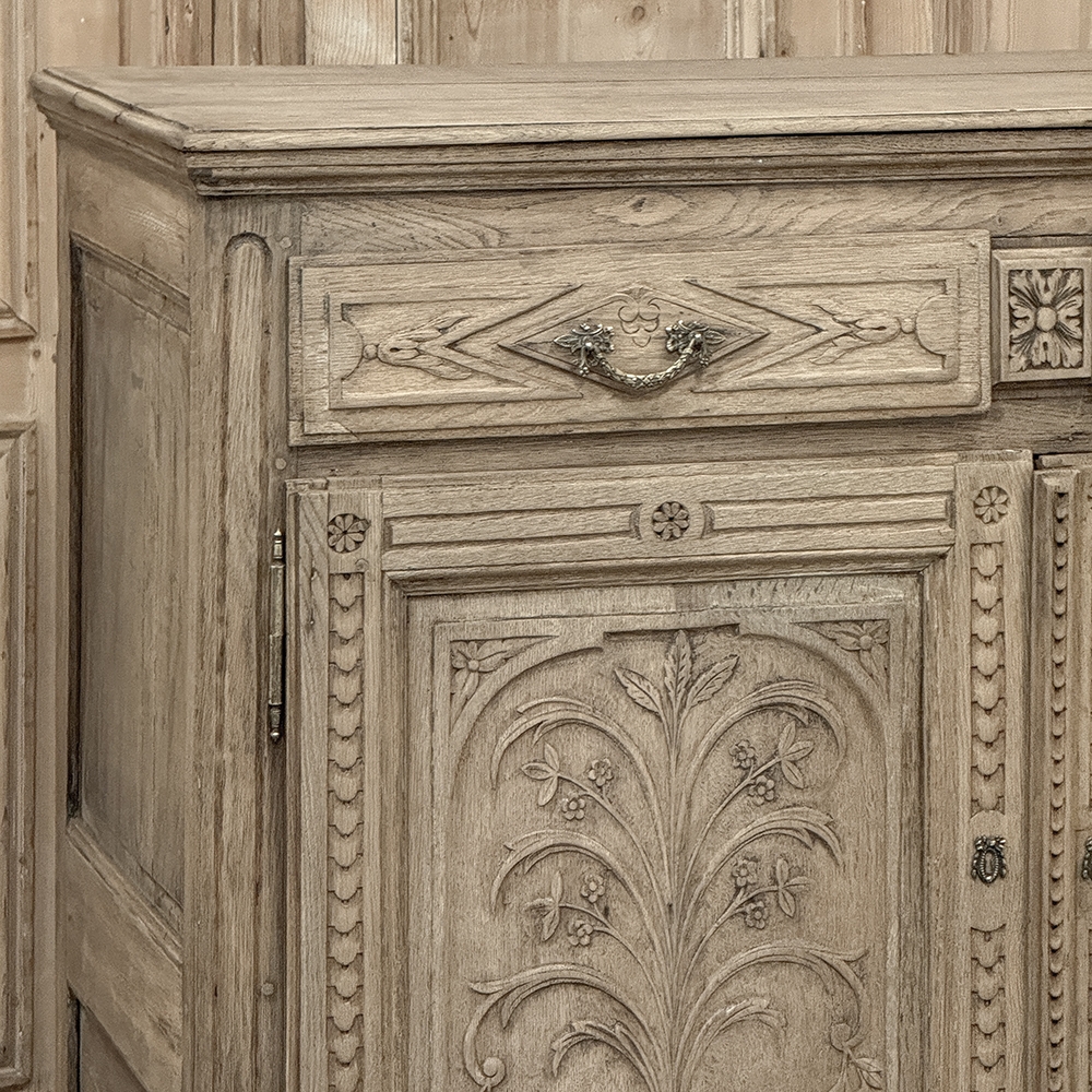 18th Century Country French Louis XVI Buffet in Stripped Oak is a period piece that exemplifies the artistry and traditional craftsmanship of the rural cabinetmaker during the period. Utilizing dense, old-growth oak, the casework was fashioned with neoclassical lines and features a molded crown around the generous serving & display surface, which overlooks two panels on each side, and the entire front facade which features an unusual carved display. The pair of drawers use a diamond shaped theme made more prolific in subsequent years, but in this case retaining their classical influence with foliate adornment in relief and intaglio style. The drawers are separated by a carved rosette, and each features cast brass bale pulls showing fine detail. The cabinet doors below are works of art, with superlative stylized foliate and floral designs in bas relief framed by quatrefoil overlay and rosettes, then punctuated with cast brass key guards. Both doors are hung with high-quality brass hinges. The apron below is of a unique design, with a variation on Greek coin accented with vertical flutes. Tapered and carved legs provide support. The doors open wide to reveal capacious storage, making this piece as functional as it is beautiful to behold!