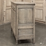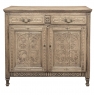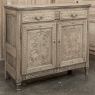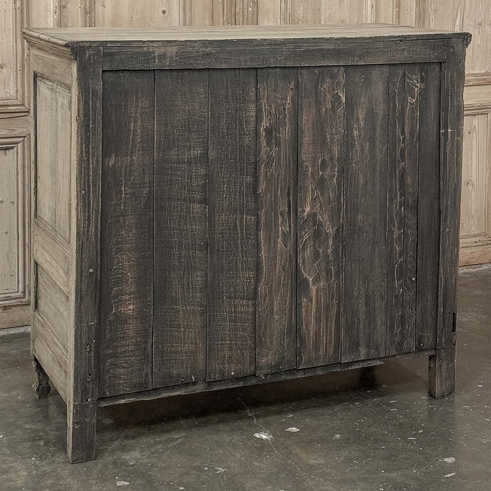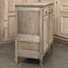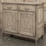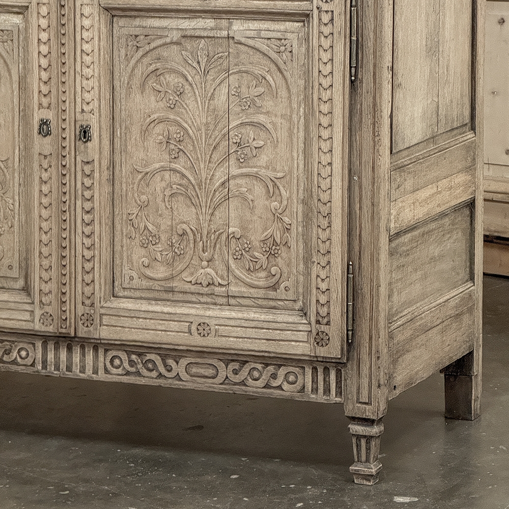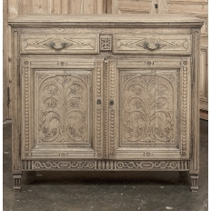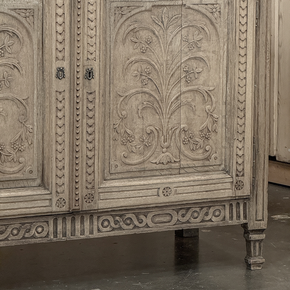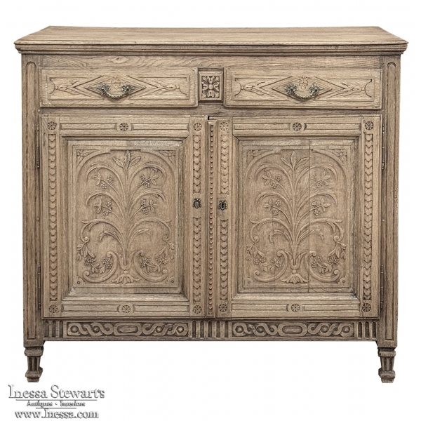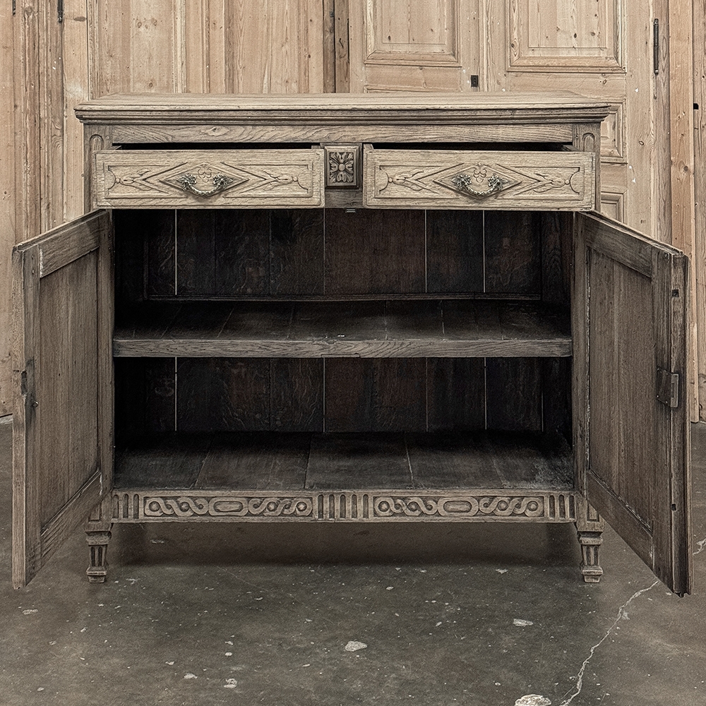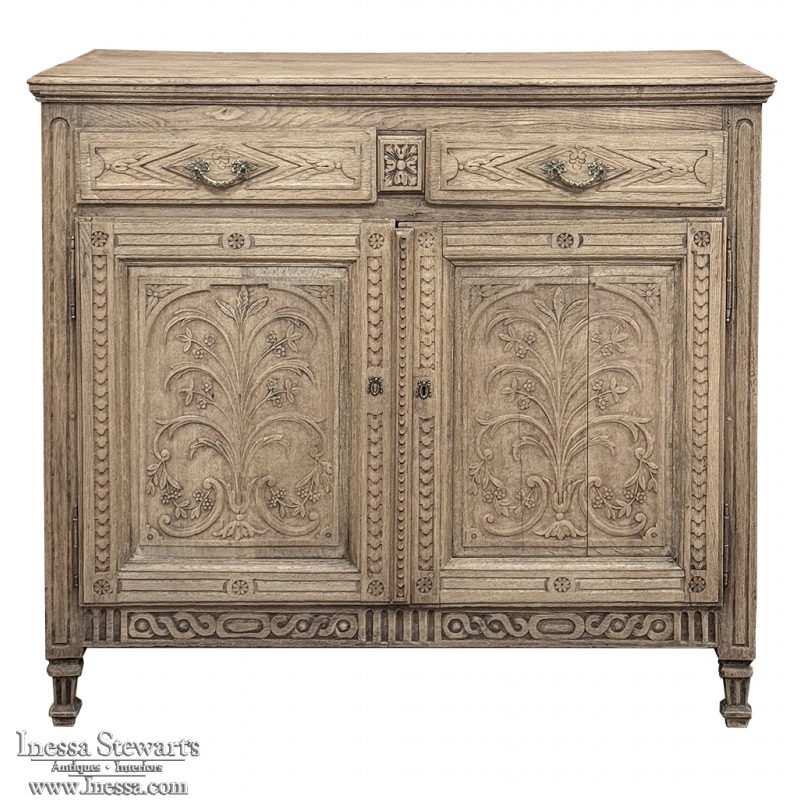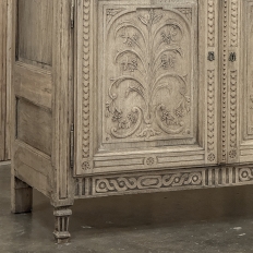 18th Century Country French Louis XVI Buffet in Stripped Oak is a period piece that exemplifies the artistry and traditional craftsmanship of the rural cabinetmaker during the period. Utilizing dense, old-growth oak, the casework was fashioned with neoclassical lines and features a molded crown around the generous serving & display surface, which overlooks two panels on each side, and the entire front facade which features an unusual carved display. The pair of drawers use a diamond shaped theme made more prolific in subsequent years, but in this case retaining their classical influence with foliate adornment in relief and intaglio style. The drawers are separated by a carved rosette, and each features cast brass bale pulls showing fine detail. The cabinet doors below are works of art, with superlative stylized foliate and floral designs in bas relief framed by quatrefoil overlay and rosettes, then punctuated with cast brass key guards. Both doors are hung with high-quality brass hinges. The apron below is of a unique design, with a variation on Greek coin accented with vertical flutes. Tapered and carved legs provide support. The doors open wide to reveal capacious storage, making this piece as functional as it is beautiful to behold!