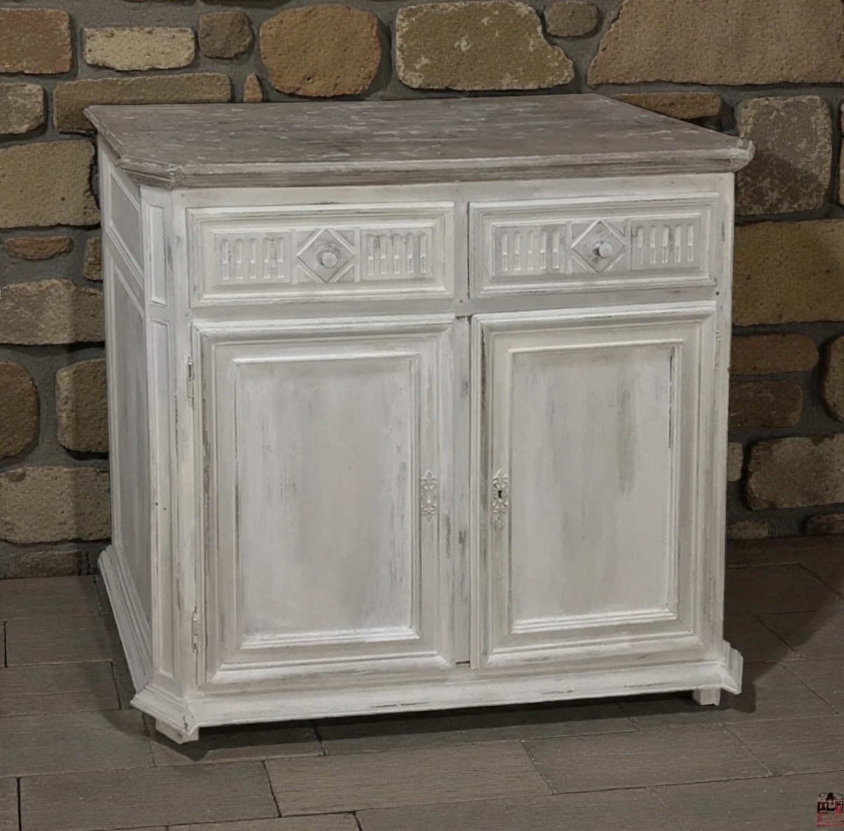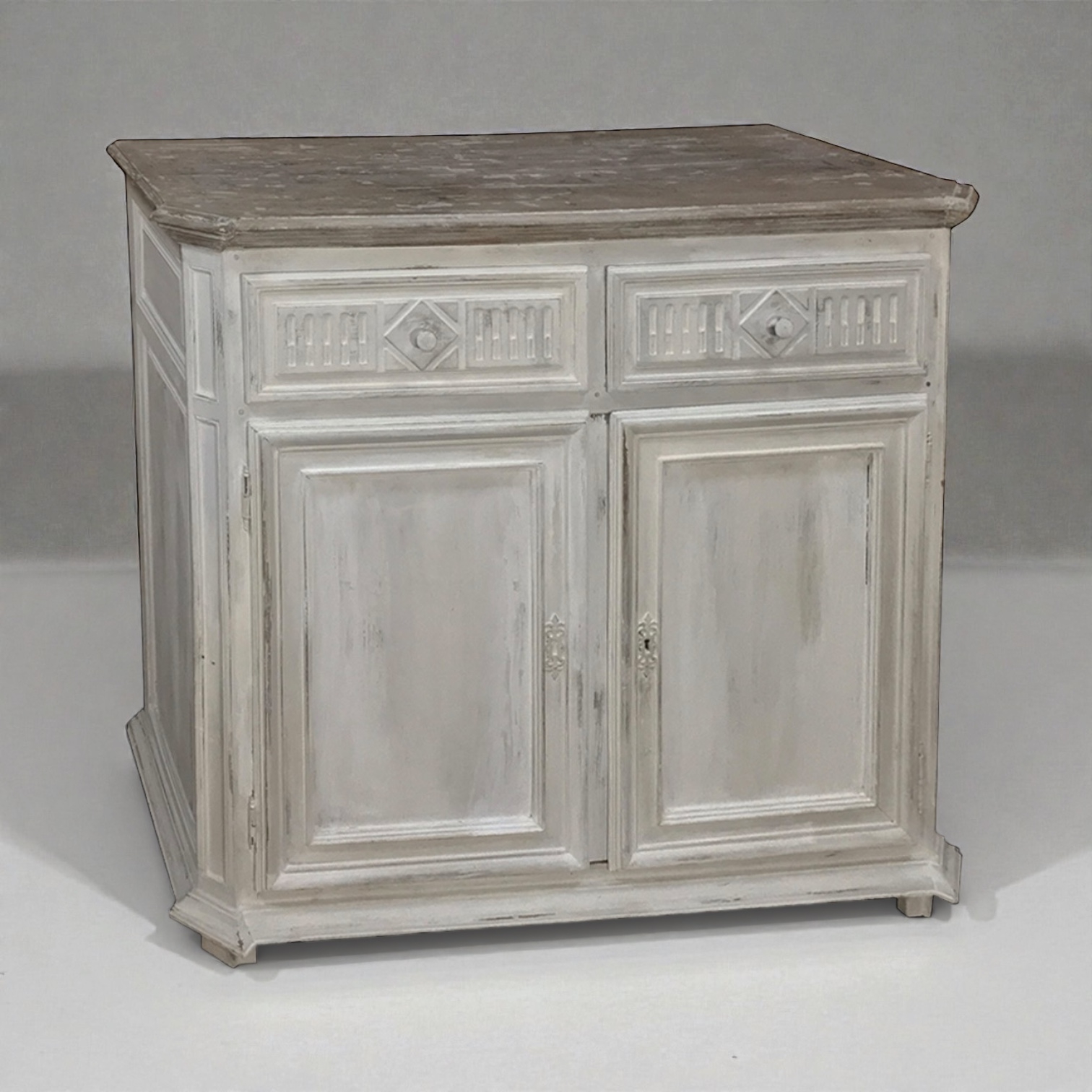Neoclassical elements are thoughtfully integrated into the façade. Fluted detailing accents the drawer fronts, framing distinctive diamond motifs that center the brass pulls. The lower paneled doors remain composed and understated, reinforcing the disciplined elegance associated with Louis XVI period furniture.