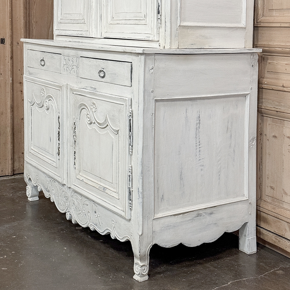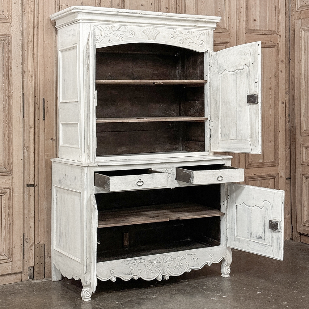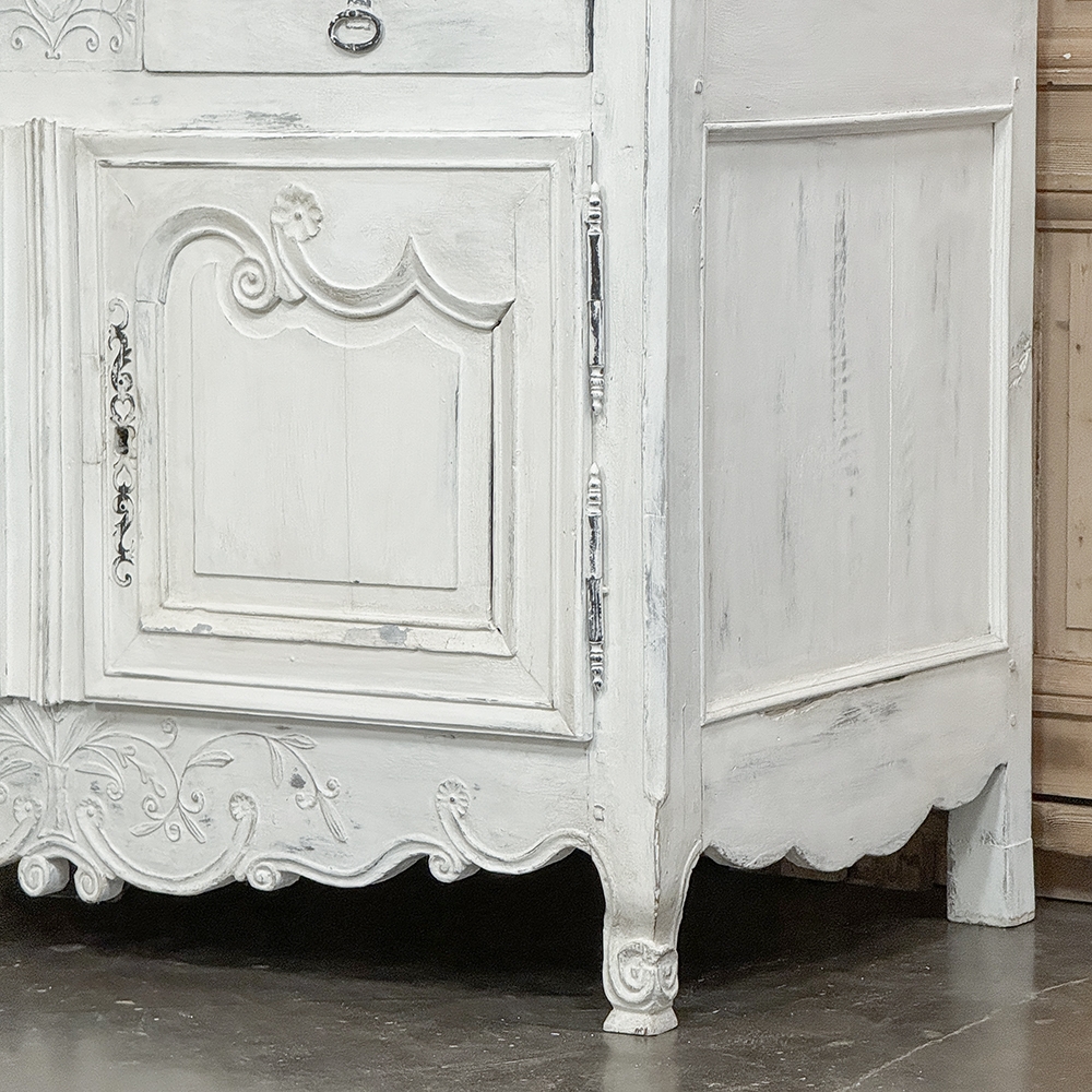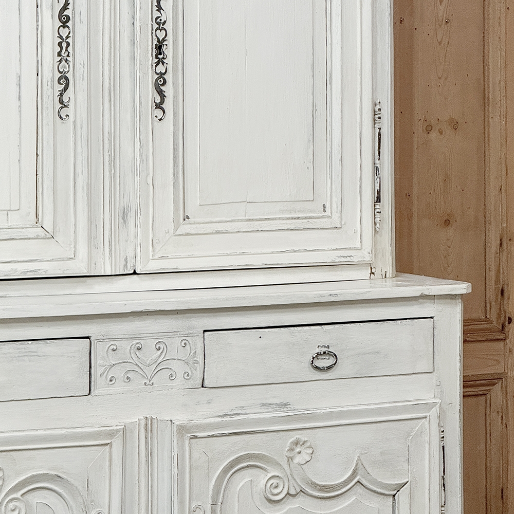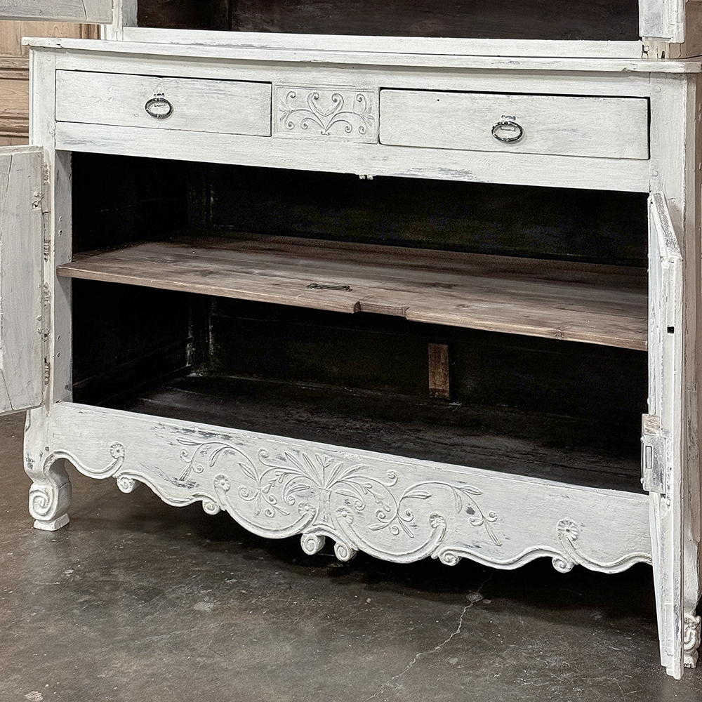 Sale18th Century Country French Painted Buffet a Deux Corps is a wonderfully preserved historically significant piece that is destined to enthrall your family for several more generations to come! Hand-crafted from thick planks of seasoned old-growth oak, it features a bold crown overlooking a fancifully carved bonnet with wildflowers and foliates in bas relief over the subtly arched pair of upper cabinet doors. The doors themselves feature lavish carved details on the top, with raised & recessed panels following the contours of the frame for added visual appeal. Suspended by outside-mounted steel barrel hinges, each opens wide for easy access to the large interior with shelves. The lower tier steps out a bit from the top, and includes two spacious drawers with steel bale pulls which overlook another pair of cabinet doors which are shortened versions of the upper tier doors in design and ornamentation. A complex scrolled design for the apron below is festooned with complementary bas relief carvings of wildflowers and foliates, and is supported by massive legs with escargot feet. Designed to store all a family's cherished heirloom china, crystal and silver in one beautiful storage cabinet, such buffets a deux corps were the pride of the household! Painstakingly hand-painted with a lovely patinaed finish. Note the hand-hewn planks from which the back side was comprised.