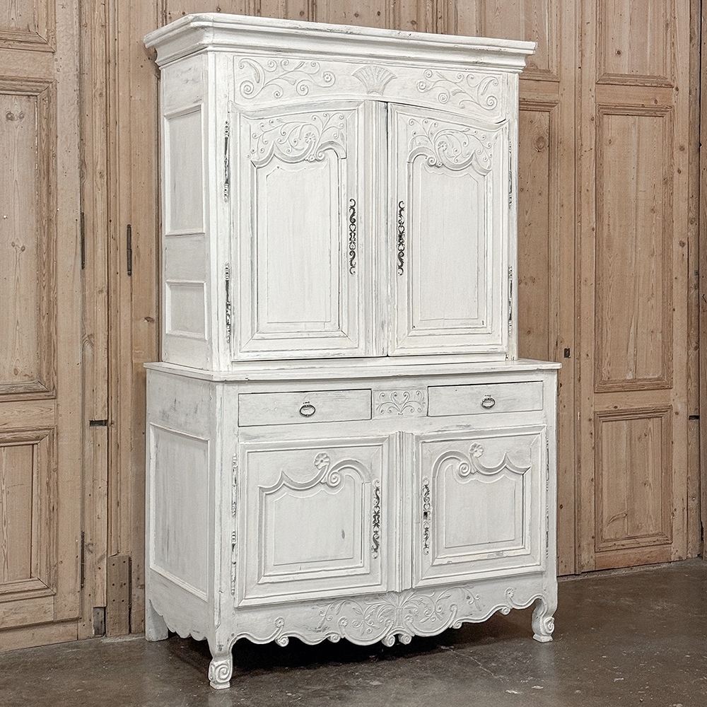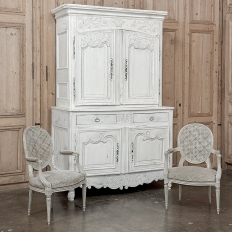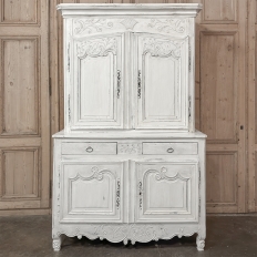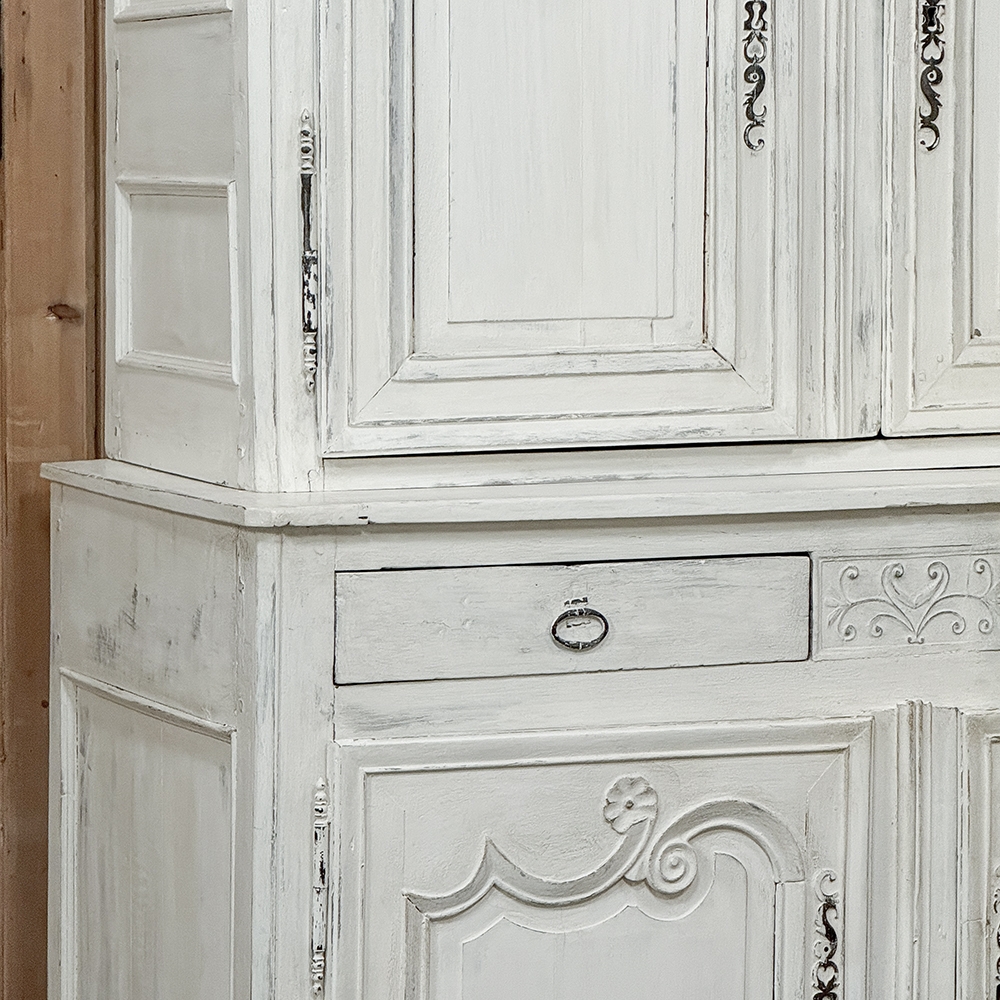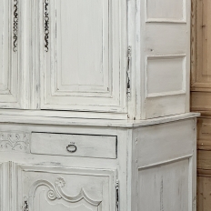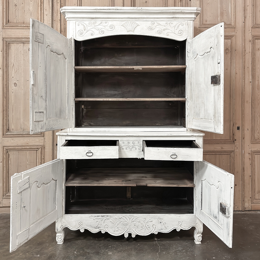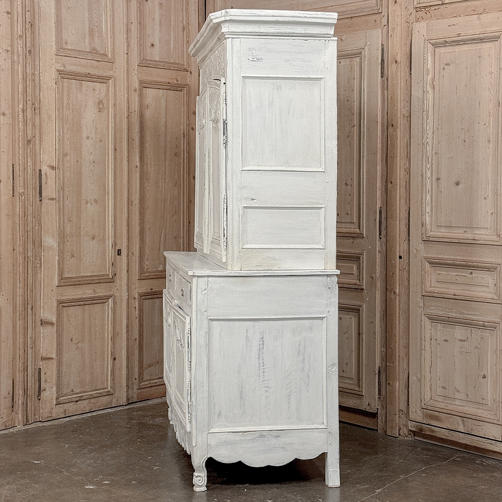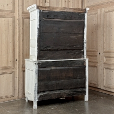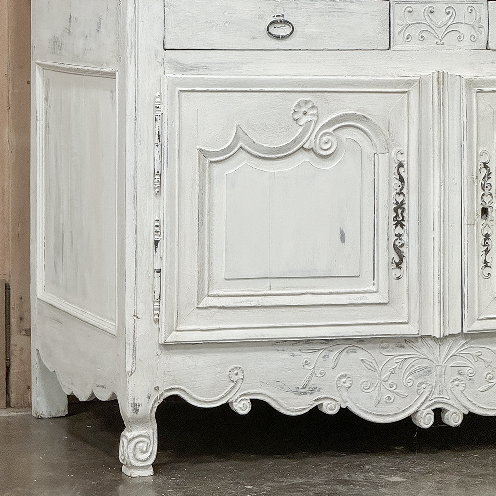 Sale18th Century Country French Painted Buffet a Deux Corps is a wonderfully preserved historically significant piece that is destined to enthrall your family for several more generations to come! Hand-crafted from thick planks of seasoned old-growth oak, it features a bold crown overlooking a fancifully carved bonnet with wildflowers and foliates in bas relief over the subtly arched pair of upper cabinet doors. The doors themselves feature lavish carved details on the top, with raised & recessed panels following the contours of the frame for added visual appeal. Suspended by outside-mounted steel barrel hinges, each opens wide for easy access to the large interior with shelves. The lower tier steps out a bit from the top, and includes two spacious drawers with steel bale pulls which overlook another pair of cabinet doors which are shortened versions of the upper tier doors in design and ornamentation. A complex scrolled design for the apron below is festooned with complementary bas relief carvings of wildflowers and foliates, and is supported by massive legs with escargot feet. Designed to store all a family's cherished heirloom china, crystal and silver in one beautiful storage cabinet, such buffets a deux corps were the pride of the household! Painstakingly hand-painted with a lovely patinaed finish. Note the hand-hewn planks from which the back side was comprised.