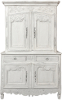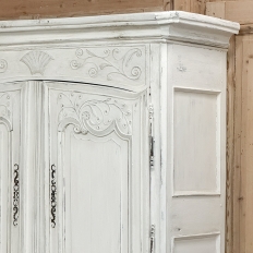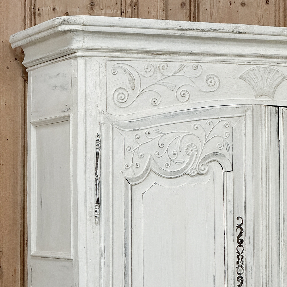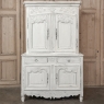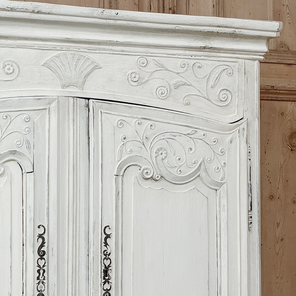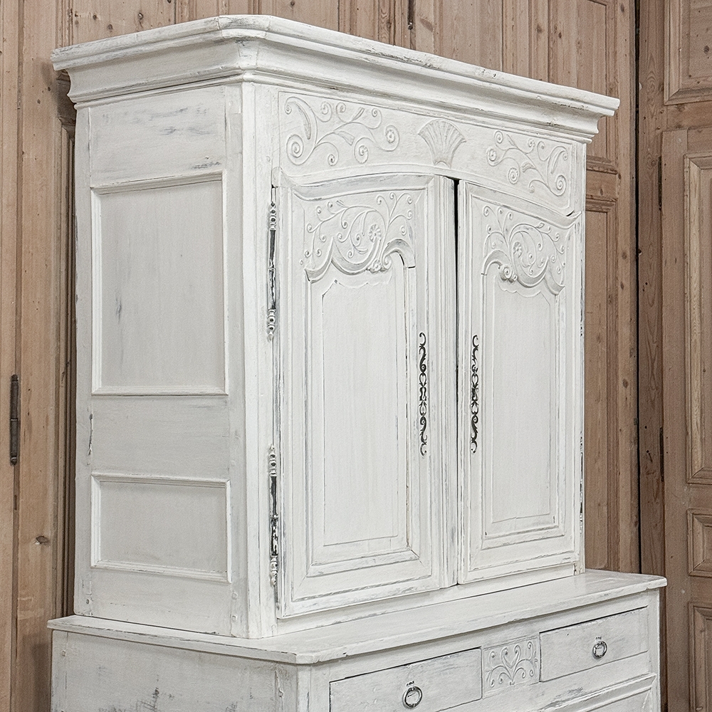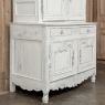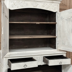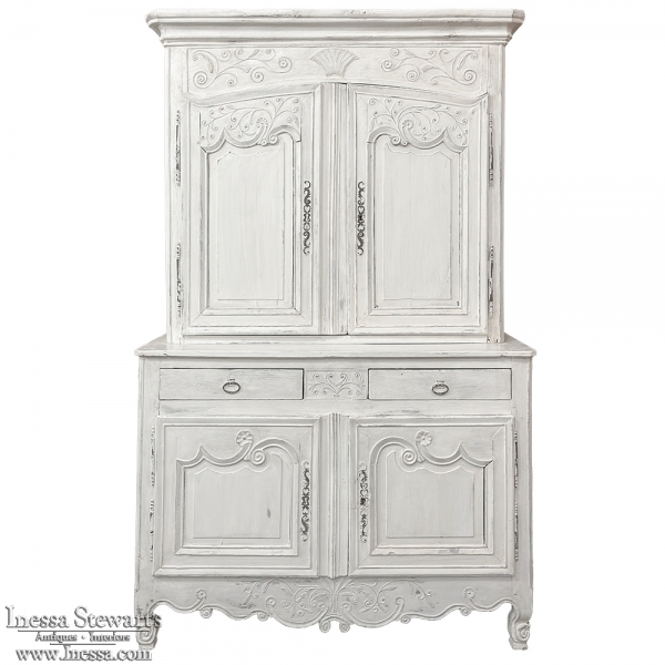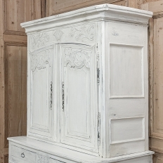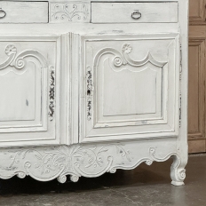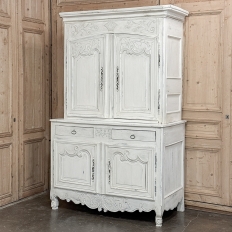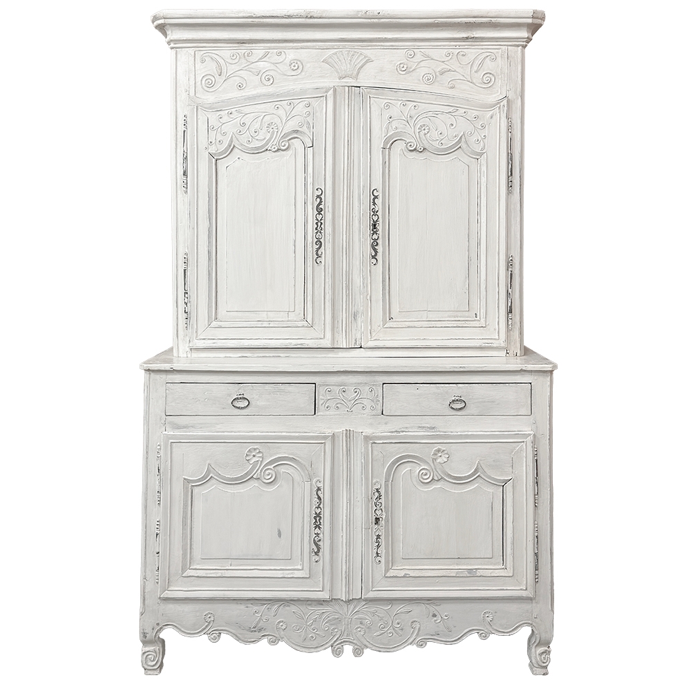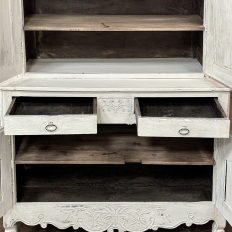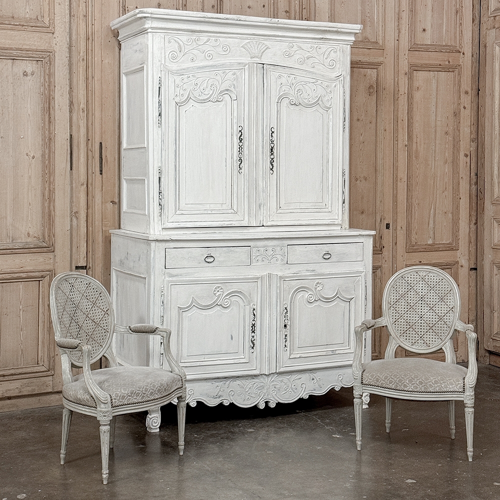 Sale18th Century Country French Painted Buffet a Deux Corps is a wonderfully preserved historically significant piece that is destined to enthrall your family for several more generations to come! Hand-crafted from thick planks of seasoned old-growth oak, it features a bold crown overlooking a fancifully carved bonnet with wildflowers and foliates in bas relief over the subtly arched pair of upper cabinet doors. The doors themselves feature lavish carved details on the top, with raised & recessed panels following the contours of the frame for added visual appeal. Suspended by outside-mounted steel barrel hinges, each opens wide for easy access to the large interior with shelves. The lower tier steps out a bit from the top, and includes two spacious drawers with steel bale pulls which overlook another pair of cabinet doors which are shortened versions of the upper tier doors in design and ornamentation. A complex scrolled design for the apron below is festooned with complementary bas relief carvings of wildflowers and foliates, and is supported by massive legs with escargot feet. Designed to store all a family's cherished heirloom china, crystal and silver in one beautiful storage cabinet, such buffets a deux corps were the pride of the household! Painstakingly hand-painted with a lovely patinaed finish. Note the hand-hewn planks from which the back side was comprised.