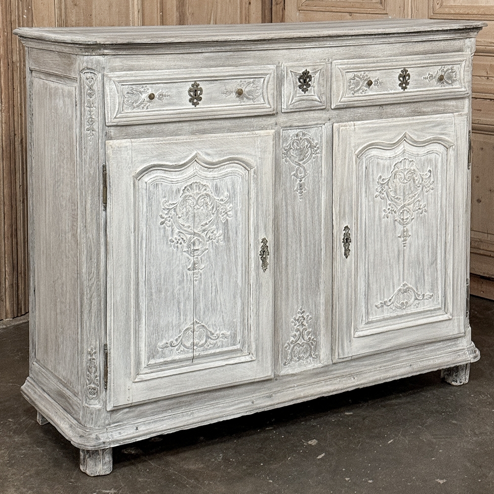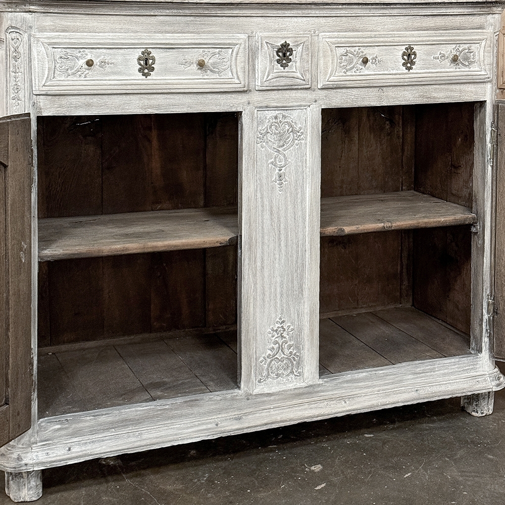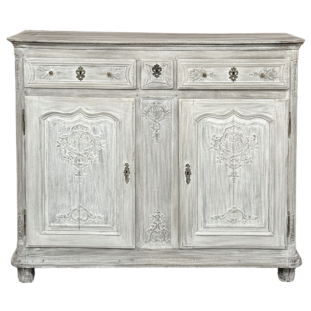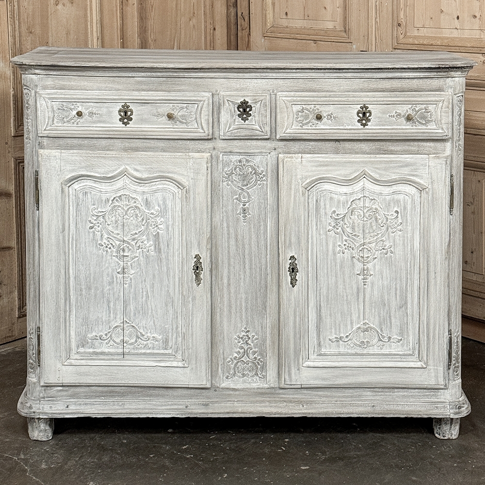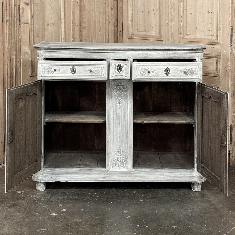 18th Century Country French Whitewashed Buffet ~ Cabinet was designed to serve a typically large family, and provide adequate storage for all china, flatware and glassware while simultaneously presenting a visual style flair to the room. Constructed from indigenous old-growth oak, it has been professionally whitewashed by our expert in house staff, and has a soft appearance that blends well with more casual decors. The boldly molded top surrounds a nicely sized surface great for display, keepsakes or even a big flat panel TV. Underneath, two regular sized drawers flank a cutlery drawer at the center, fitted with a lock to keep sharp knives out of the hands of the little ones. Cast brass key guards are centered on each drawer, as well as fitted to the cabinet doors below, which complement the grass barrel hinges. Carved details were inspired by the Louis XIV court, with sophisticated renderings of scrollwork, foliates and cross-hatching resembling netting. Even the center stile has been adorned with this refined hand-carved bas relief, as have the rounded cornerposts. The cabinet doors exhibit the largest display of the complementary motifs, emphasizing a shell at the top surrounded with the scrolls and foliates to create a crest form above, and an architectural flourish below, all set in a raised & recessed panel with arched spire-shaped framework. Doors and drawers open wide to reveal capacious storage. The side panels are tailored, chamfered panels, and the base molding is substantial, but designed to not detract from the carved embellishments above. Note the abundant use of pegged mortise & tenon joinery, all performed with nothing but hand tools, a sure sign of extraordinary craftsmanship!
