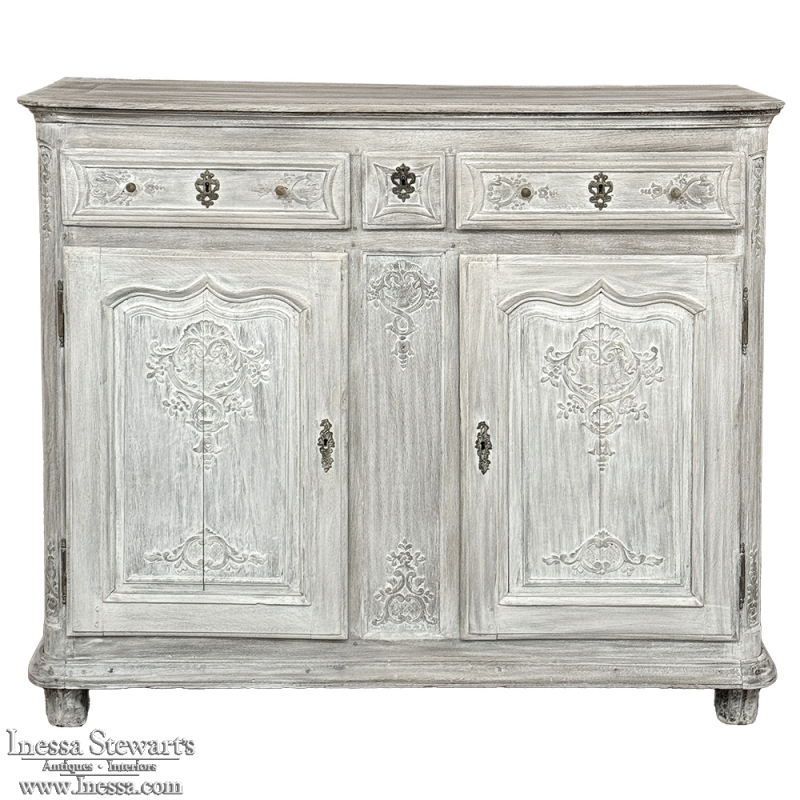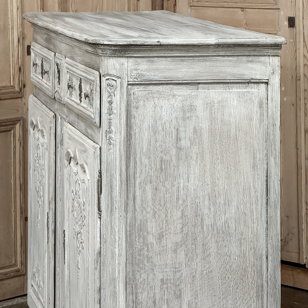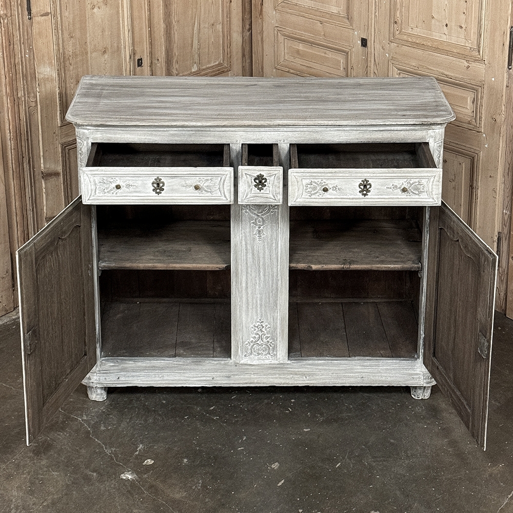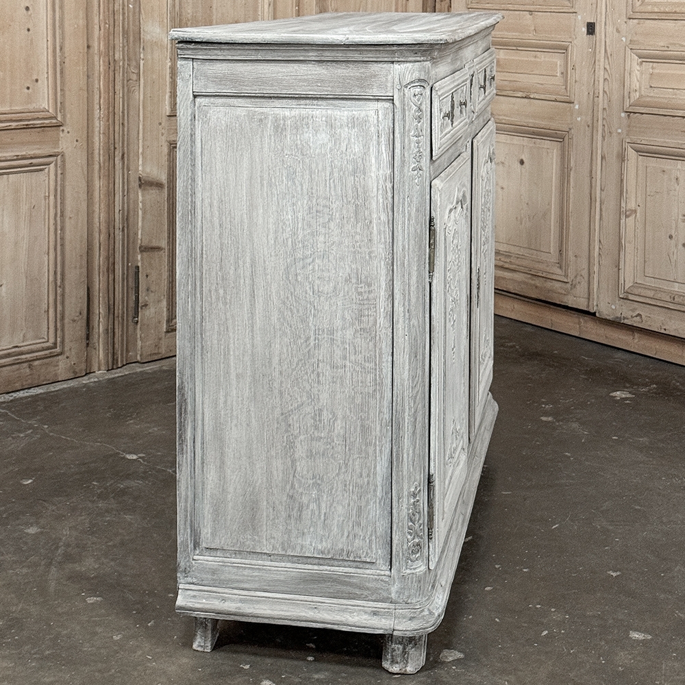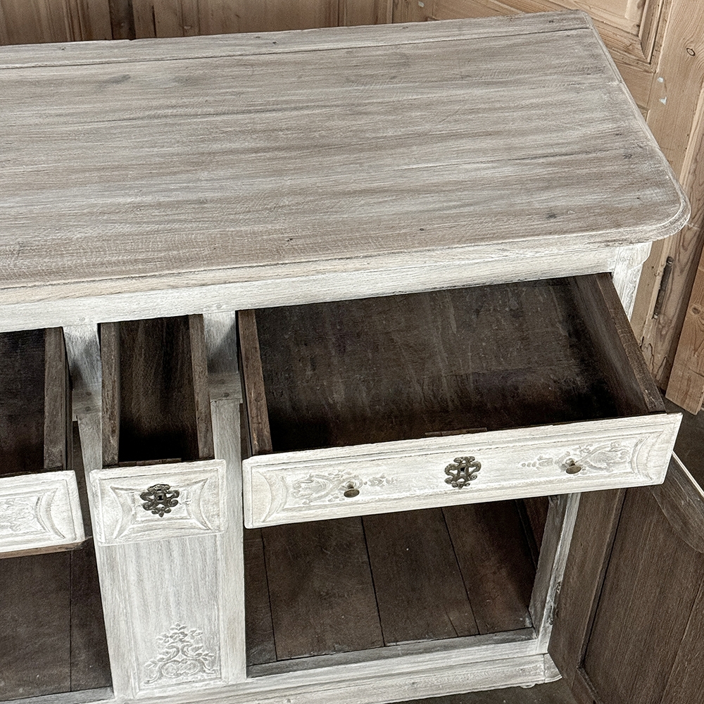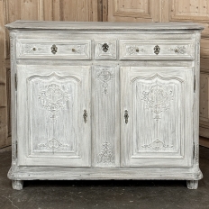 18th Century Country French Whitewashed Buffet ~ Cabinet was designed to serve a typically large family, and provide adequate storage for all china, flatware and glassware while simultaneously presenting a visual style flair to the room. Constructed from indigenous old-growth oak, it has been professionally whitewashed by our expert in house staff, and has a soft appearance that blends well with more casual decors. The boldly molded top surrounds a nicely sized surface great for display, keepsakes or even a big flat panel TV. Underneath, two regular sized drawers flank a cutlery drawer at the center, fitted with a lock to keep sharp knives out of the hands of the little ones. Cast brass key guards are centered on each drawer, as well as fitted to the cabinet doors below, which complement the grass barrel hinges. Carved details were inspired by the Louis XIV court, with sophisticated renderings of scrollwork, foliates and cross-hatching resembling netting. Even the center stile has been adorned with this refined hand-carved bas relief, as have the rounded cornerposts. The cabinet doors exhibit the largest display of the complementary motifs, emphasizing a shell at the top surrounded with the scrolls and foliates to create a crest form above, and an architectural flourish below, all set in a raised & recessed panel with arched spire-shaped framework. Doors and drawers open wide to reveal capacious storage. The side panels are tailored, chamfered panels, and the base molding is substantial, but designed to not detract from the carved embellishments above. Note the abundant use of pegged mortise & tenon joinery, all performed with nothing but hand tools, a sure sign of extraordinary craftsmanship!