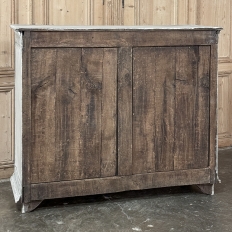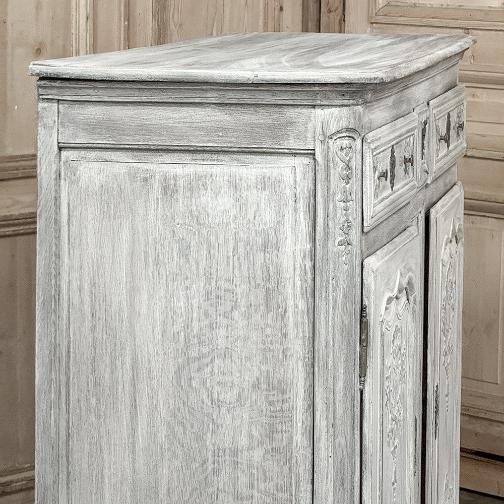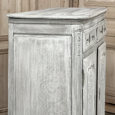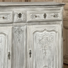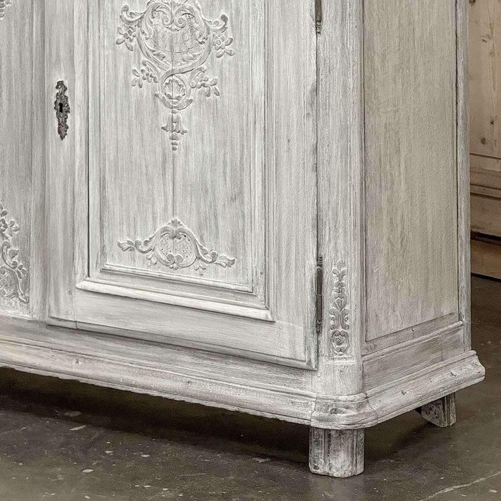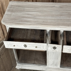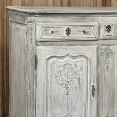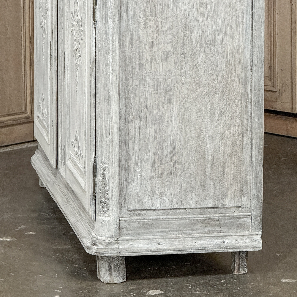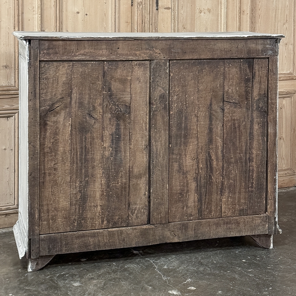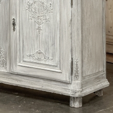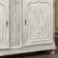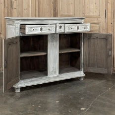 18th Century Country French Whitewashed Buffet ~ Cabinet was designed to serve a typically large family, and provide adequate storage for all china, flatware and glassware while simultaneously presenting a visual style flair to the room. Constructed from indigenous old-growth oak, it has been professionally whitewashed by our expert in house staff, and has a soft appearance that blends well with more casual decors. The boldly molded top surrounds a nicely sized surface great for display, keepsakes or even a big flat panel TV. Underneath, two regular sized drawers flank a cutlery drawer at the center, fitted with a lock to keep sharp knives out of the hands of the little ones. Cast brass key guards are centered on each drawer, as well as fitted to the cabinet doors below, which complement the grass barrel hinges. Carved details were inspired by the Louis XIV court, with sophisticated renderings of scrollwork, foliates and cross-hatching resembling netting. Even the center stile has been adorned with this refined hand-carved bas relief, as have the rounded cornerposts. The cabinet doors exhibit the largest display of the complementary motifs, emphasizing a shell at the top surrounded with the scrolls and foliates to create a crest form above, and an architectural flourish below, all set in a raised & recessed panel with arched spire-shaped framework. Doors and drawers open wide to reveal capacious storage. The side panels are tailored, chamfered panels, and the base molding is substantial, but designed to not detract from the carved embellishments above. Note the abundant use of pegged mortise & tenon joinery, all performed with nothing but hand tools, a sure sign of extraordinary craftsmanship!