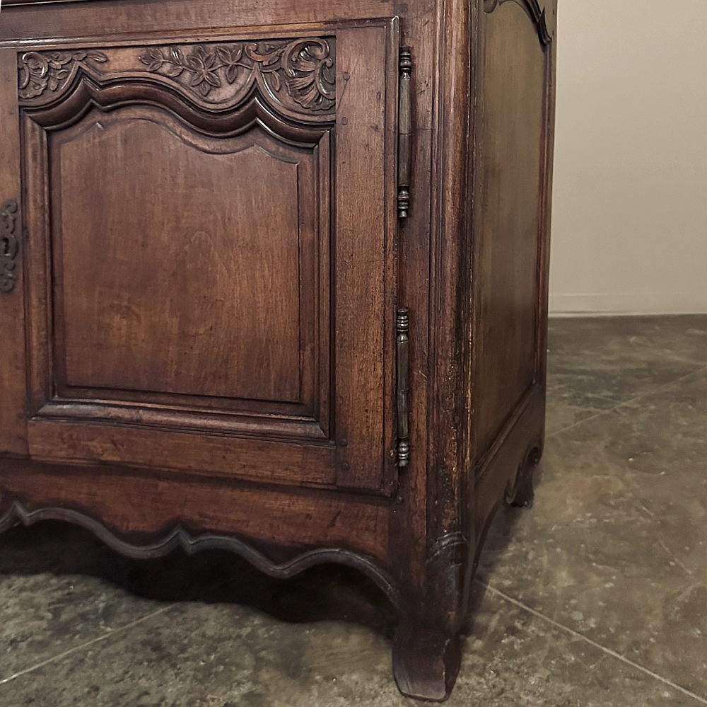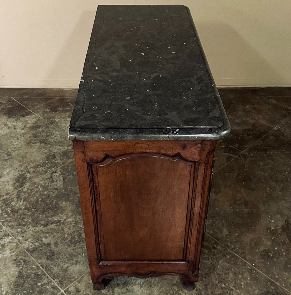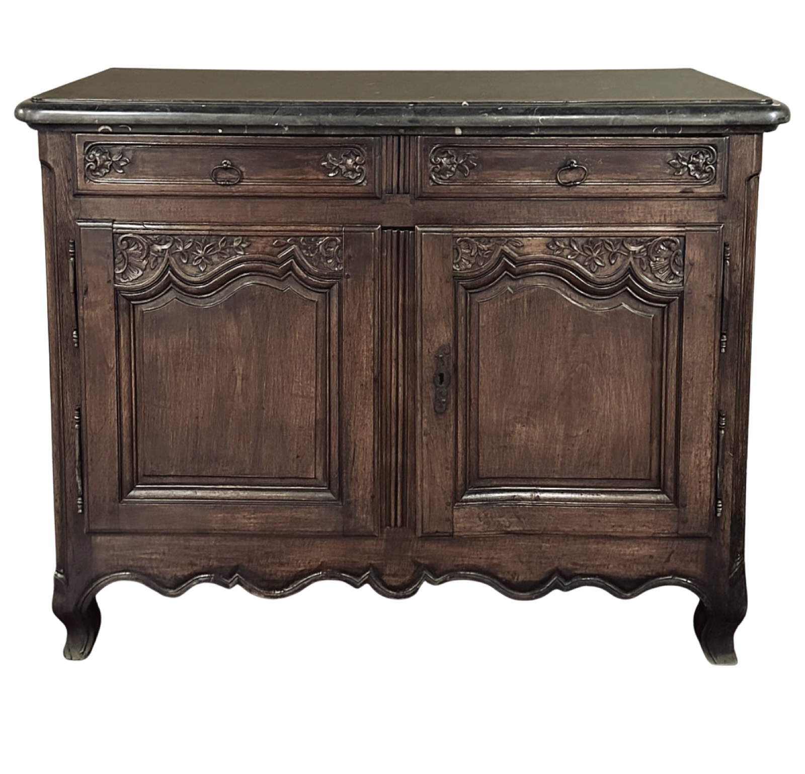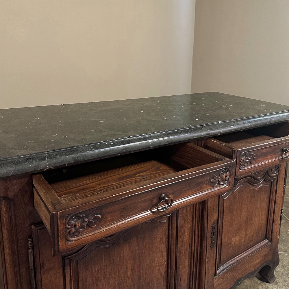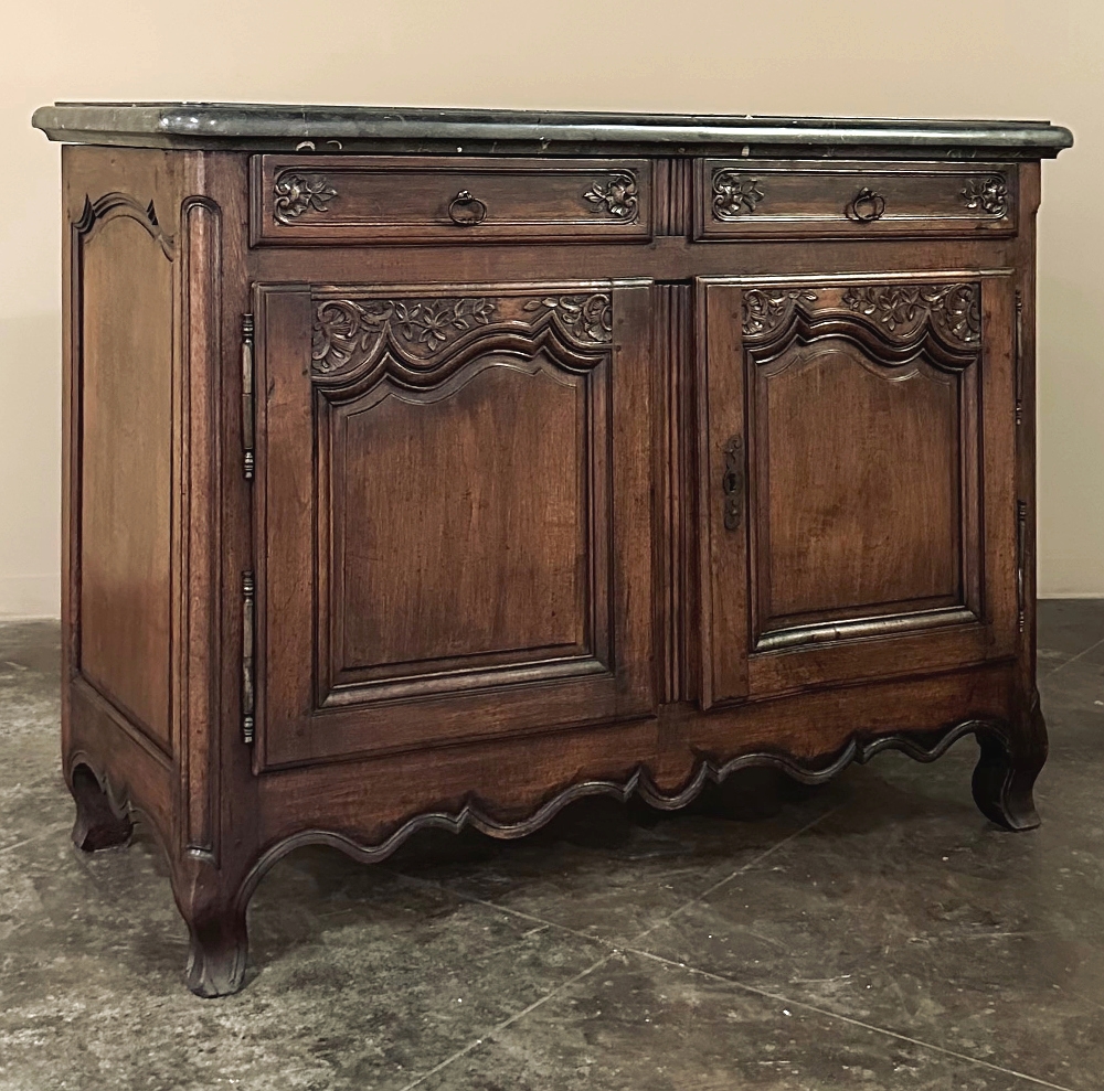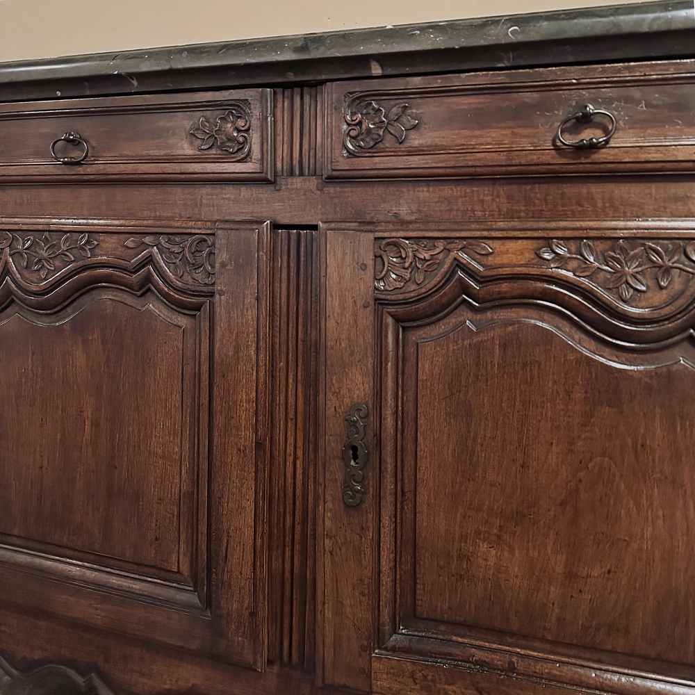 Sale18th Century County French Walnut Buffet with Black Marble Top was meticulously crafted completely by hand during the mid-1700s by obviously talented ebenistes from select indigenous French walnut. This extraordinary example of rural artisanry features hand-carved magnificence from the recessed drawer facades to the mirror-image scrolled, raised & recessed door panels. The scrolled apron and legs finish the base, and the original steel hinges, ferrures and lock combine with the choice 5-centimeter thick double beveled black marble top for a truly unforgettable visual presence! Discovered outside the environs of Lyon, such pieces are truly rare finds. Note the hand-hewn planks in the back, and the pegged mortise & tenon joinery throughout the design, all performed by hand, by skilled craftsmen. The original lock even survives with its original key!