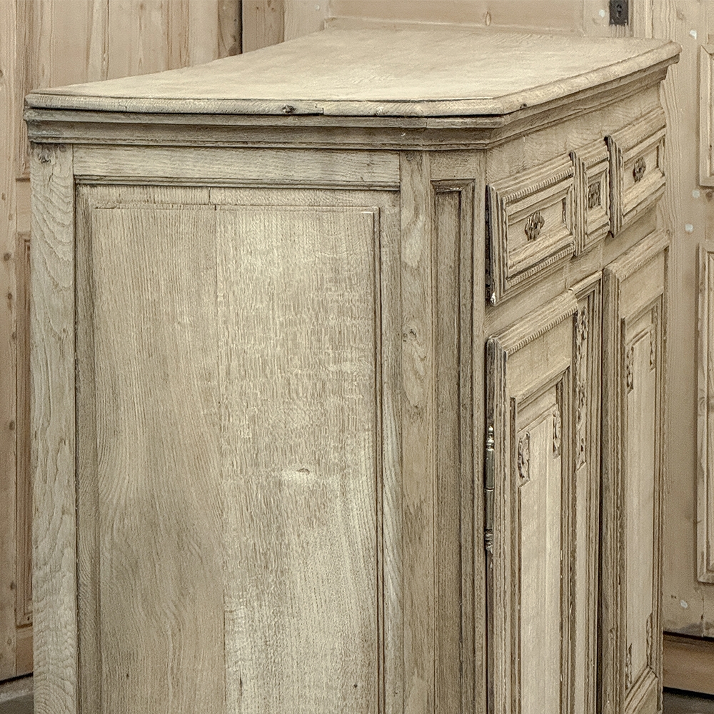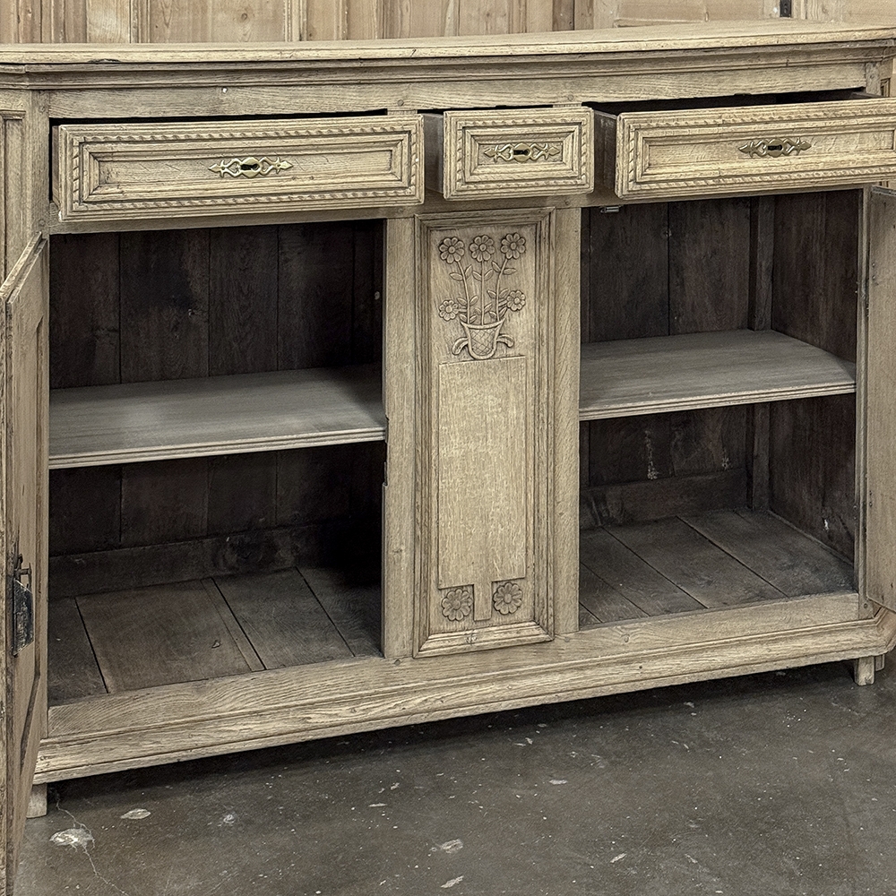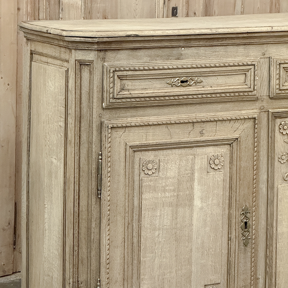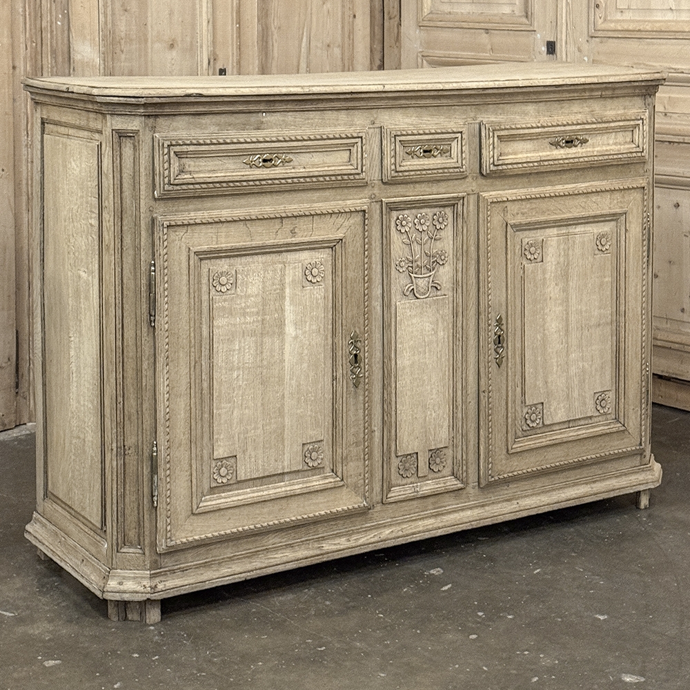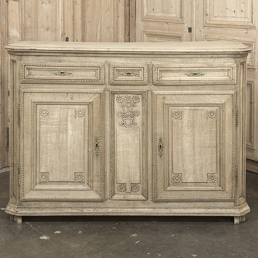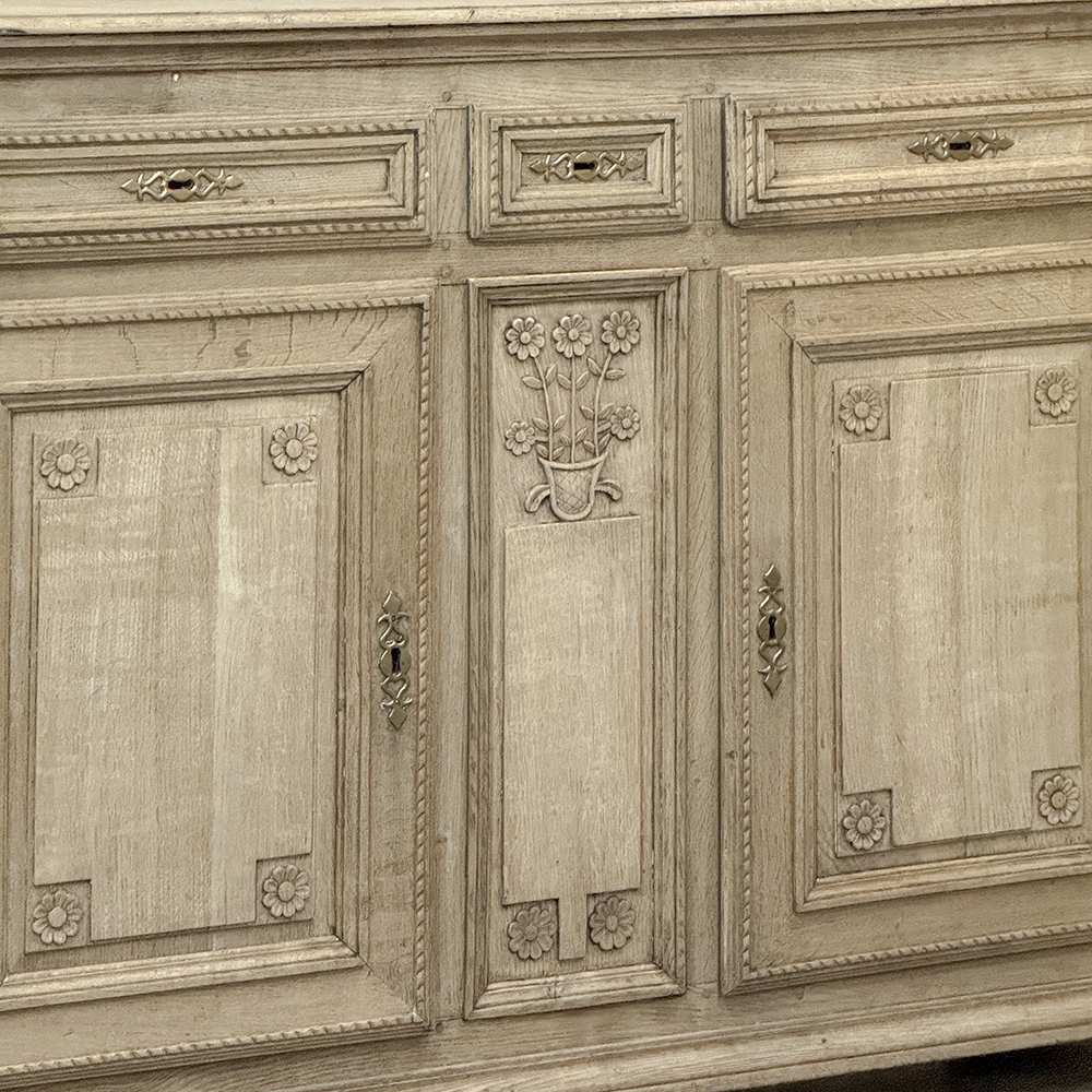 18th Century French Louis XVI Period Buffet in Stripped Oak is a timeless example of rural artisans emulating the styles set by the Royal Family during previous centuries. Around the time of the American Revolution, such craftsmen utilized indigenous old-growth woods like the French white oak used here, to create works of the cabinetmaker's art destined to last for centuries. The solid plank top overlooks a bordering of reverse molding that appears atop the trio of drawers. The middle drawer was customarily made less wide and fitted with a lock for sharp cutlery ~ important for growing families with youngsters always about. This example featured locks on all drawers and both cabinet doors in a bit of a departure, each lock fitted with a brass key guard. Corners are mitered to soften the impact on the traffic flow through the room. The carved detail, however, immediately captivates one's attention with stylized wildflowers and foliates in tasteful arrangements. The natural beauty and warmth of the wood has been brought out with our painstaking stripping process creating a soft, neutral palette and visual impact.