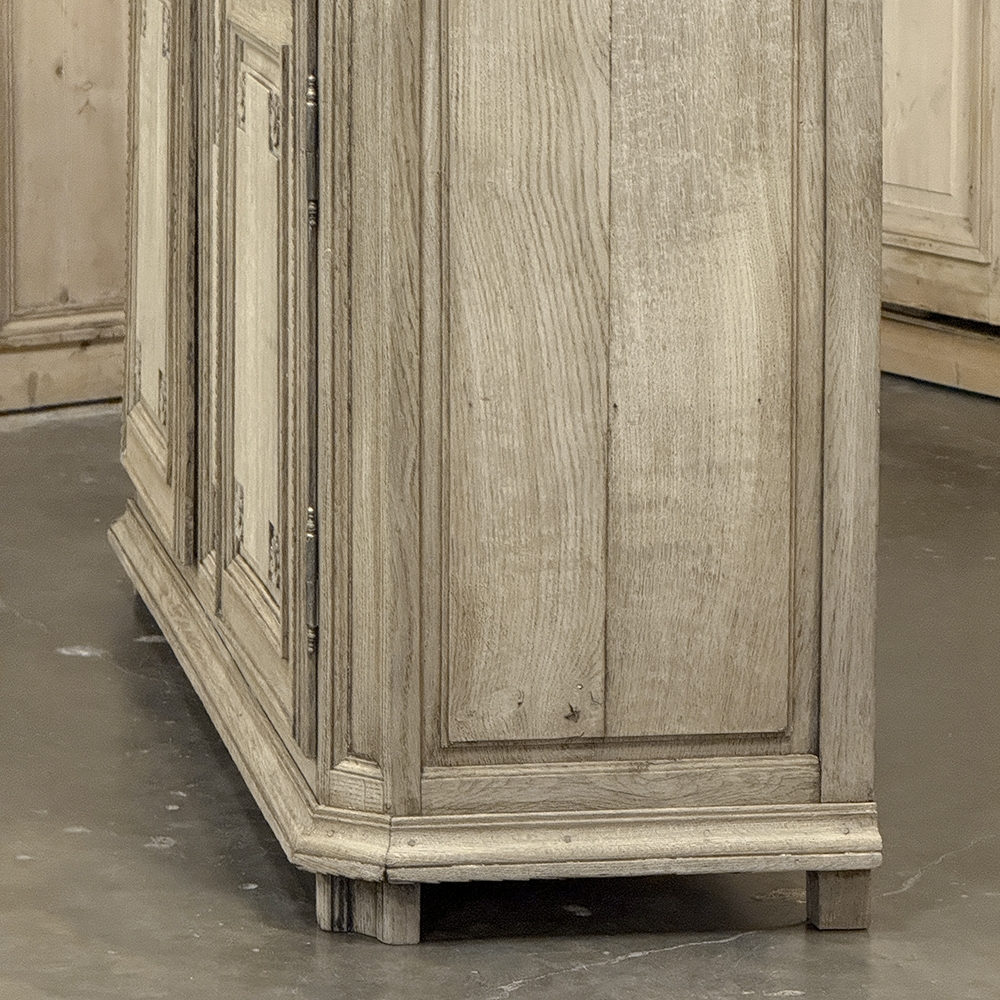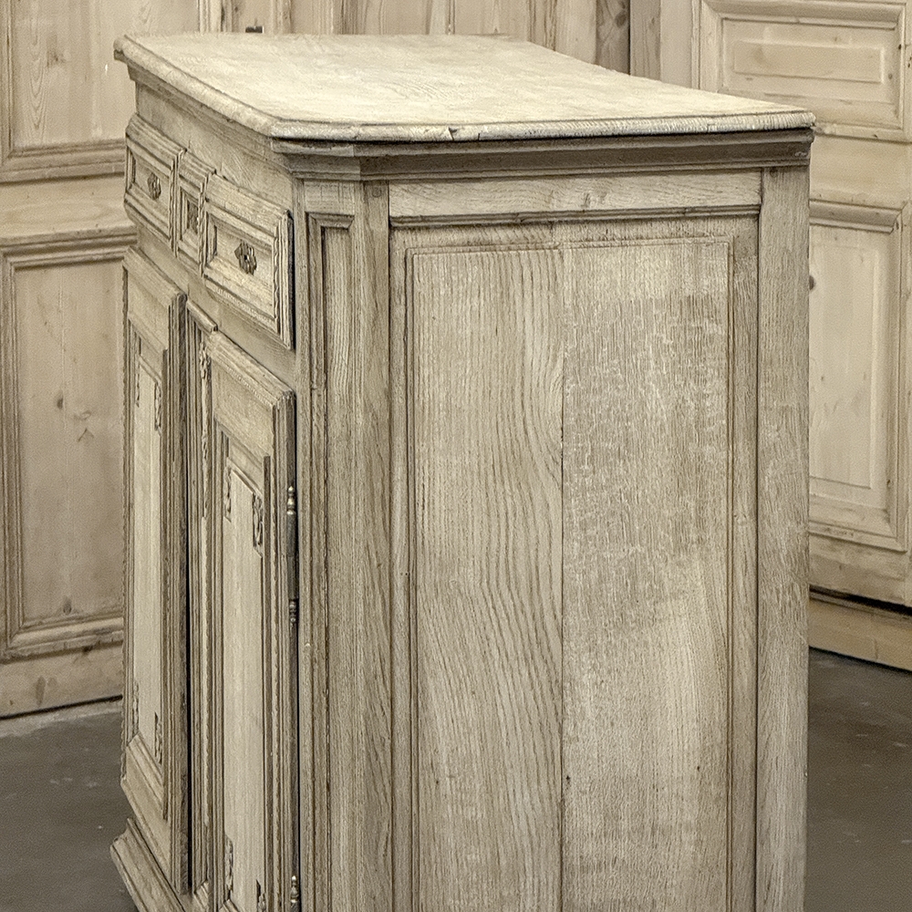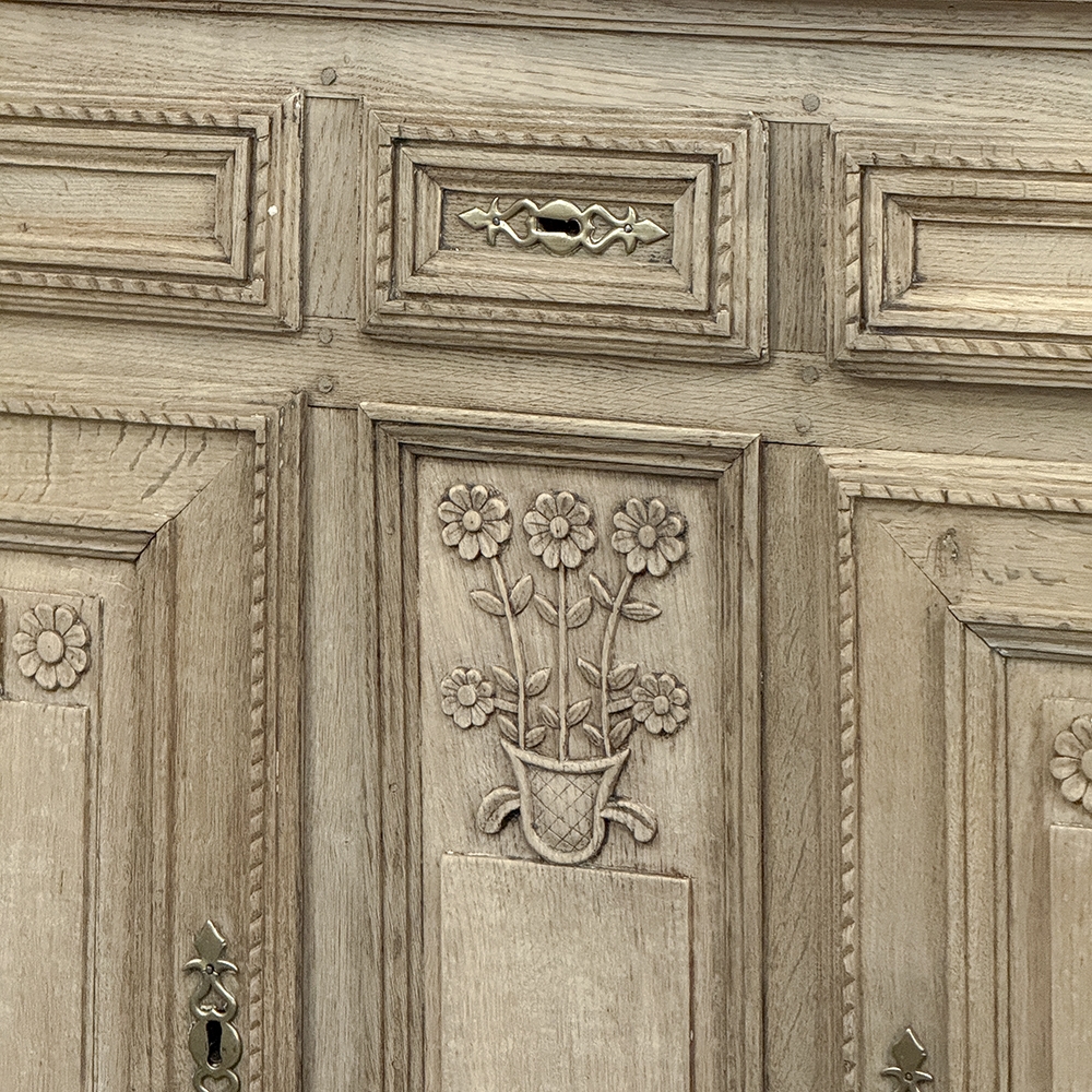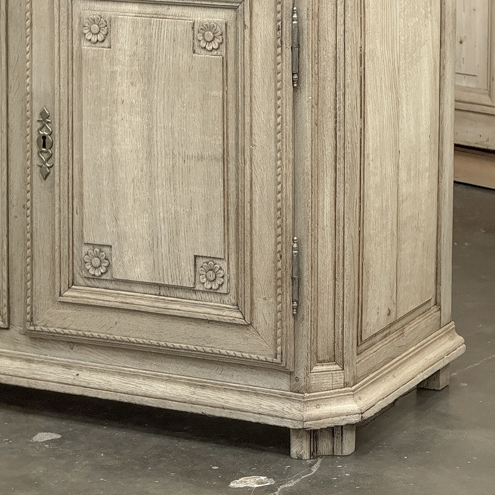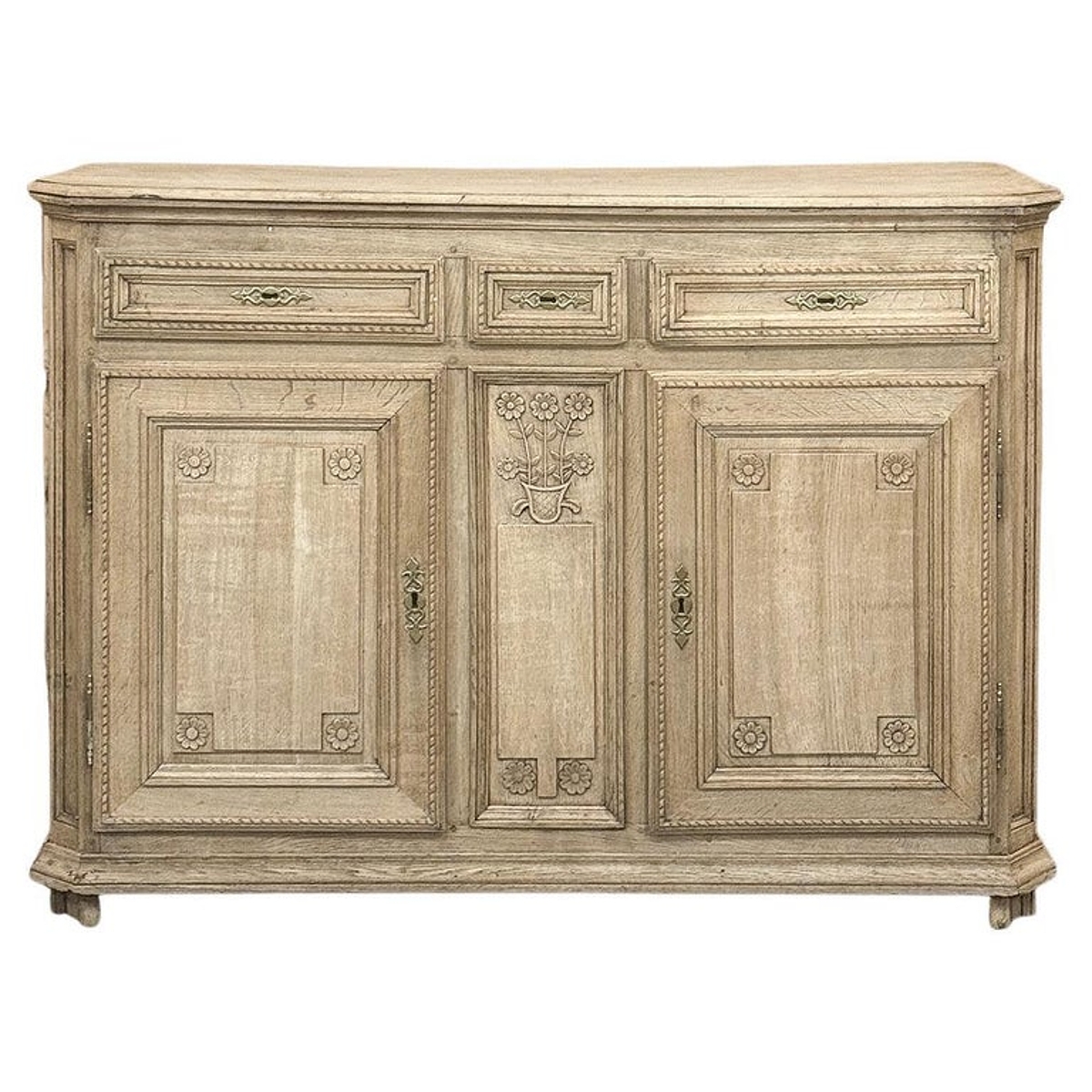 18th Century French Louis XVI Period Buffet in Stripped Oak is a timeless example of rural artisans emulating the styles set by the Royal Family during previous centuries. Around the time of the American Revolution, such craftsmen utilized indigenous old-growth woods like the French white oak used here, to create works of the cabinetmaker's art destined to last for centuries. The solid plank top overlooks a bordering of reverse molding that appears atop the trio of drawers. The middle drawer was customarily made less wide and fitted with a lock for sharp cutlery ~ important for growing families with youngsters always about. This example featured locks on all drawers and both cabinet doors in a bit of a departure, each lock fitted with a brass key guard. Corners are mitered to soften the impact on the traffic flow through the room. The carved detail, however, immediately captivates one's attention with stylized wildflowers and foliates in tasteful arrangements. The natural beauty and warmth of the wood has been brought out with our painstaking stripping process creating a soft, neutral palette and visual impact.