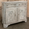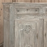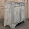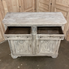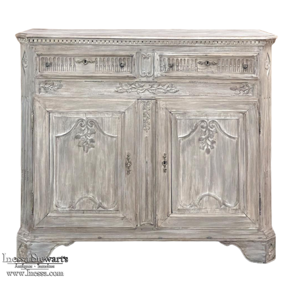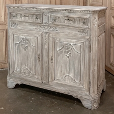 Sale18th Century French Louis XVI Whitewashed Buffet ~ Cabinet provides an excellent example of the level of high quality that was attainable by the more humble, rural furniture crafters in France during the period. Utilizing dense, old-growth oak, they created a neoclassical casework with rectilinear form, then set about adorning it with motifs inspired by the ancient Greeks and Romans. Dentil molding appears around the top rim, underneath which the drawer tier appears, which has been carved with fluting. A lentil spacer between the drawers and cabinet has not escaped the sculptor's tools, with foliates in bas relief framed by beaded trim. The two elegant cabinet doors below continue the foliate theme set on beautiful frameworks, with a carved and molded center stile. Fluted & reeded, mitered cornerposts feature rosettes above and below, and lead the eye to the scrolled feet below which wrap around even on the sides. The sides also feature raised panels for visual appeal, with the entire piece washed in white to create a soft visual texture and durable finish.