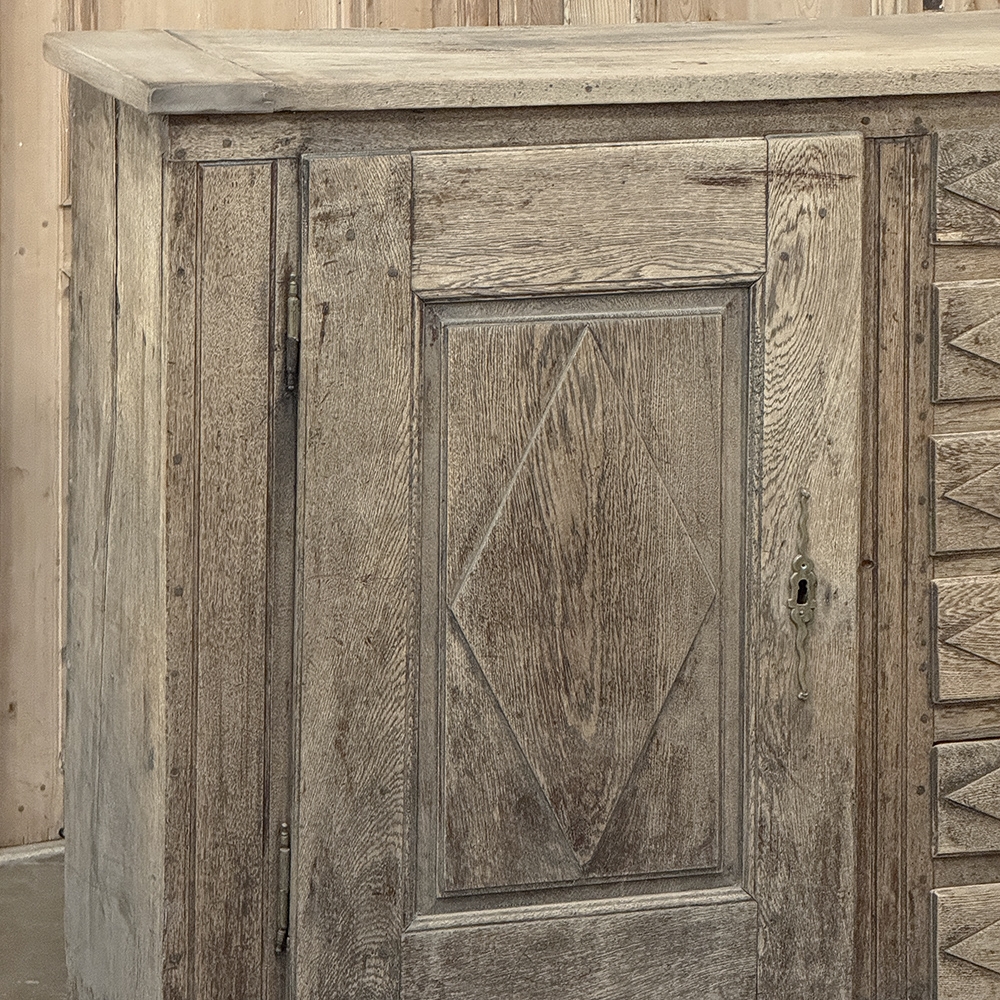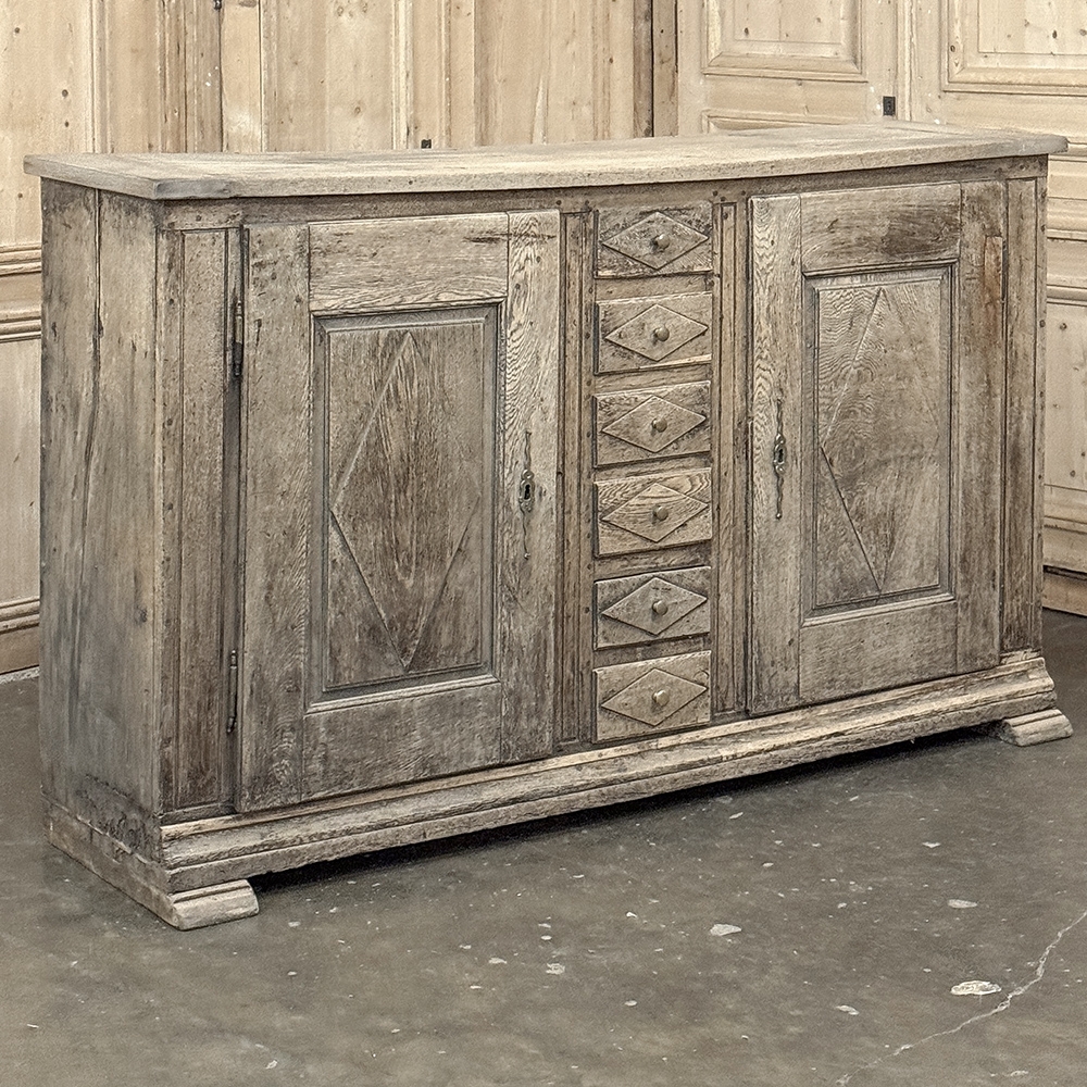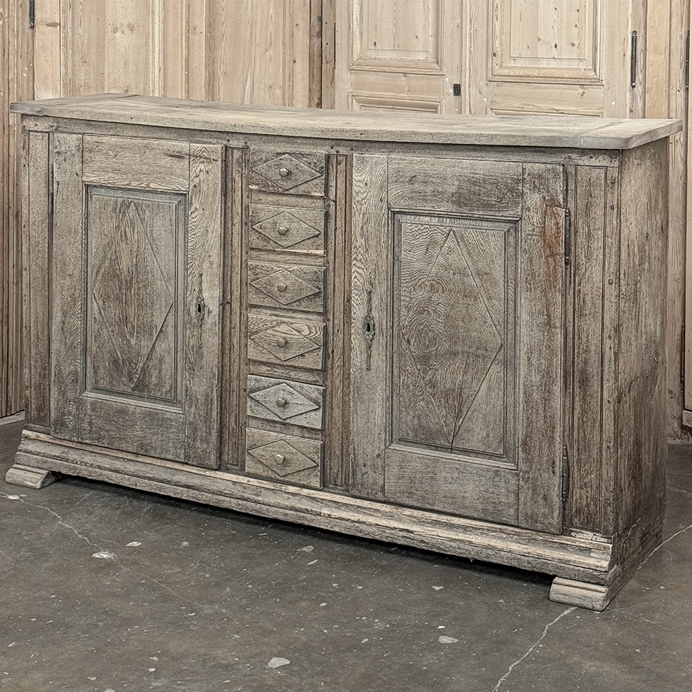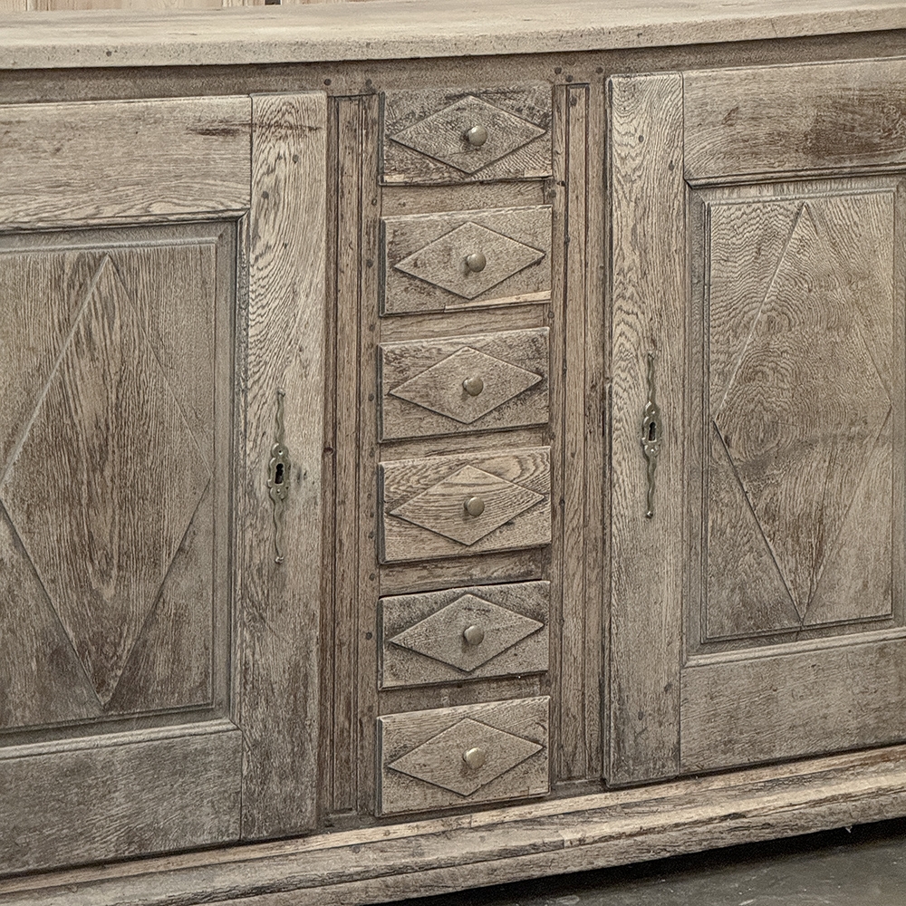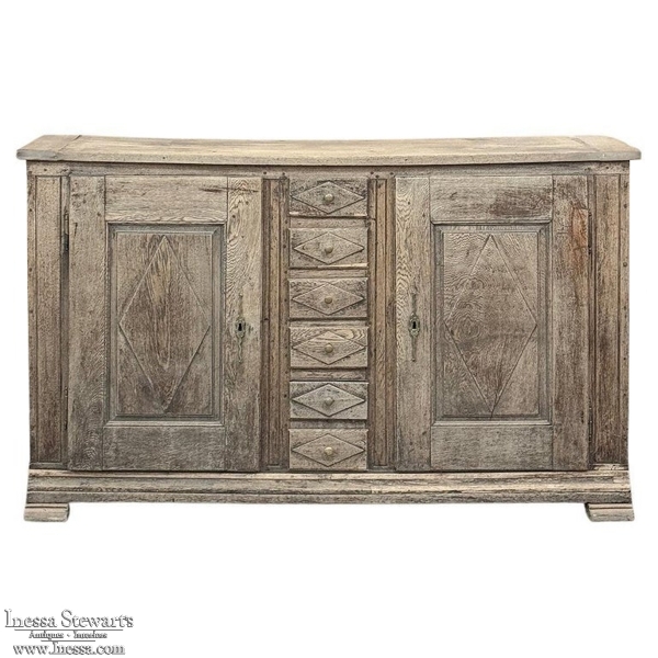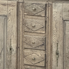 18th Century Rustic Dutch Buffet ~ Cabinet in Stripped Oak is a timeless example of functionality and utility, with a visual allure only enhanced by the time-honored craftsmanship and sheer natural beauty of the old-growth wood, revealed in all its splendor by our proprietary stripping process. Thick planks of oak make up the entire casework, from the top to the feet, and even on the hand-hewn planks that form the back side. Two full-height cabinets flank a center section of six drawers, with shelves inside the cabinets allowing one to organize and store to your heart's delight! Subtle diamond forms are raised up on each drawer and cabinet door for added appeal, with turned knobs all around for easy access.