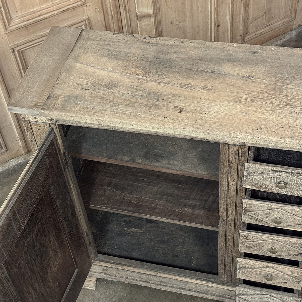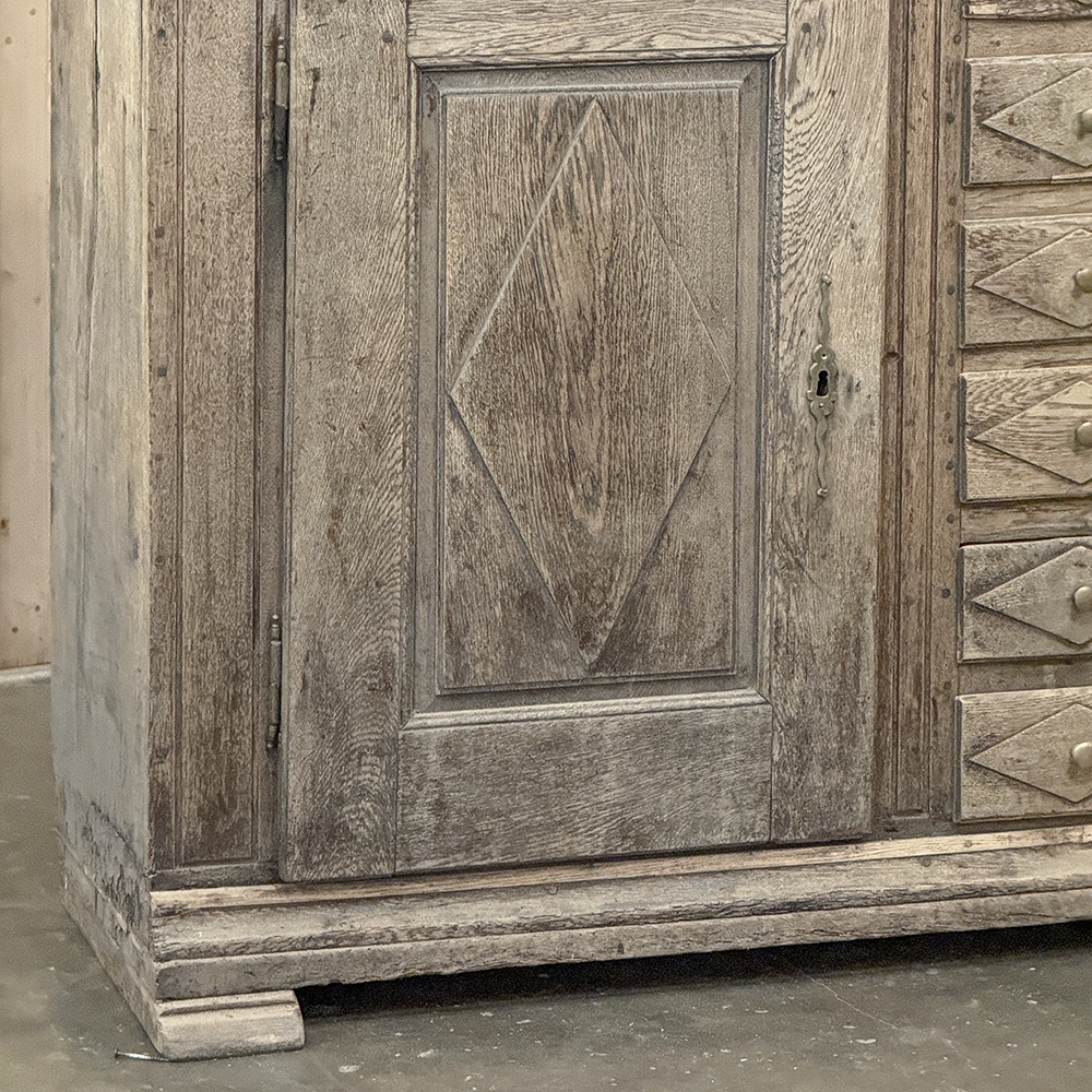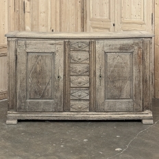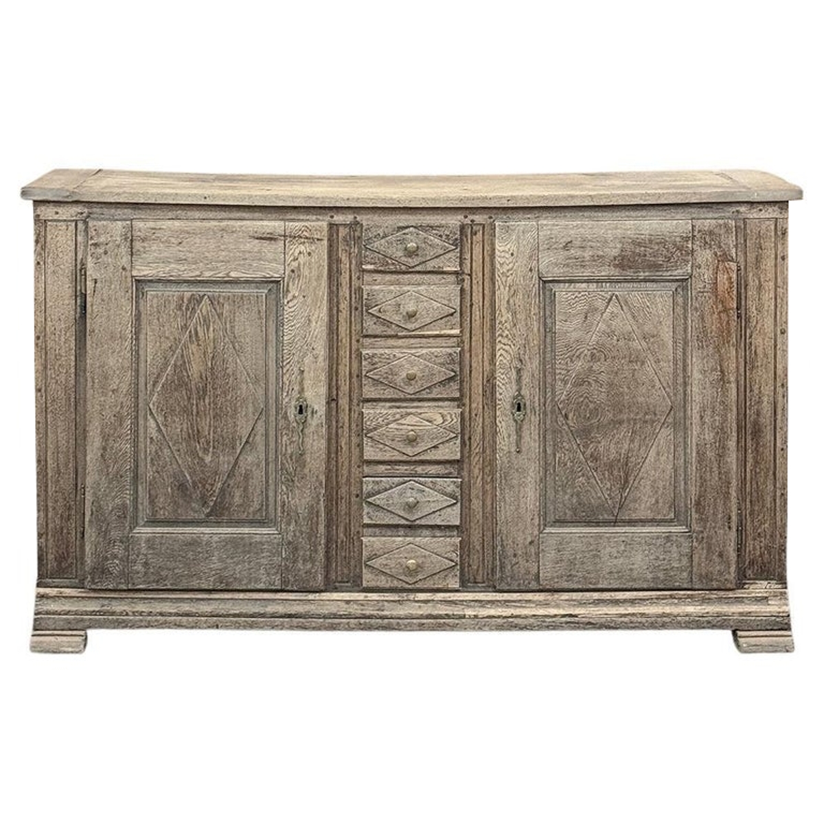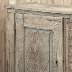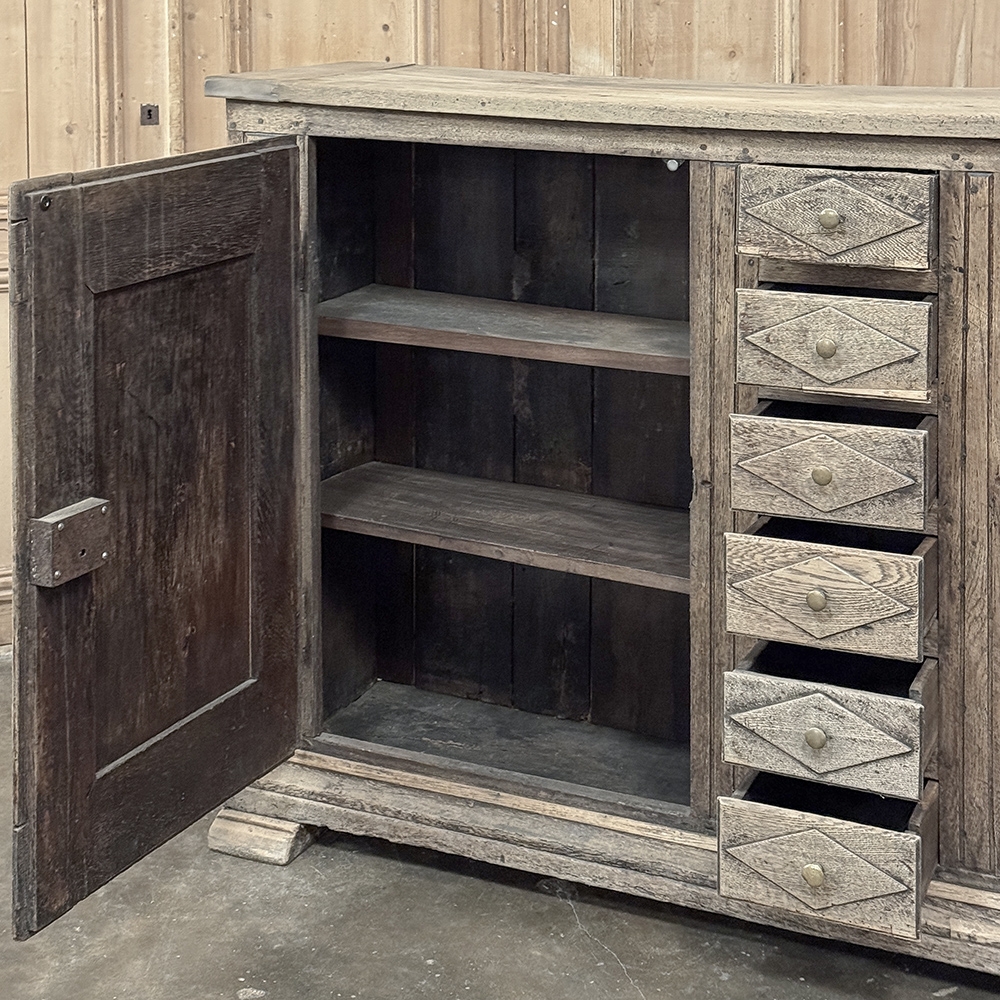 18th Century Rustic Dutch Buffet ~ Cabinet in Stripped Oak is a timeless example of functionality and utility, with a visual allure only enhanced by the time-honored craftsmanship and sheer natural beauty of the old-growth wood, revealed in all its splendor by our proprietary stripping process. Thick planks of oak make up the entire casework, from the top to the feet, and even on the hand-hewn planks that form the back side. Two full-height cabinets flank a center section of six drawers, with shelves inside the cabinets allowing one to organize and store to your heart's delight! Subtle diamond forms are raised up on each drawer and cabinet door for added appeal, with turned knobs all around for easy access.
