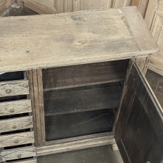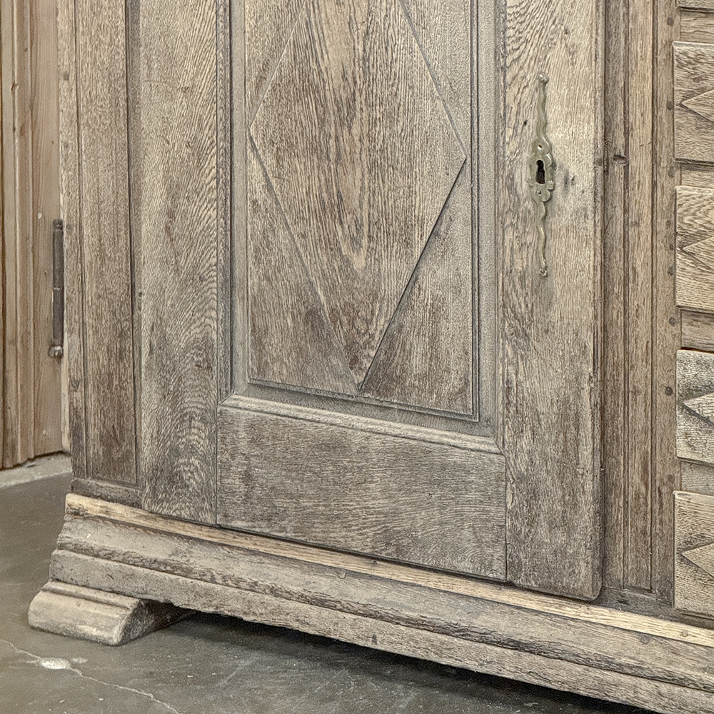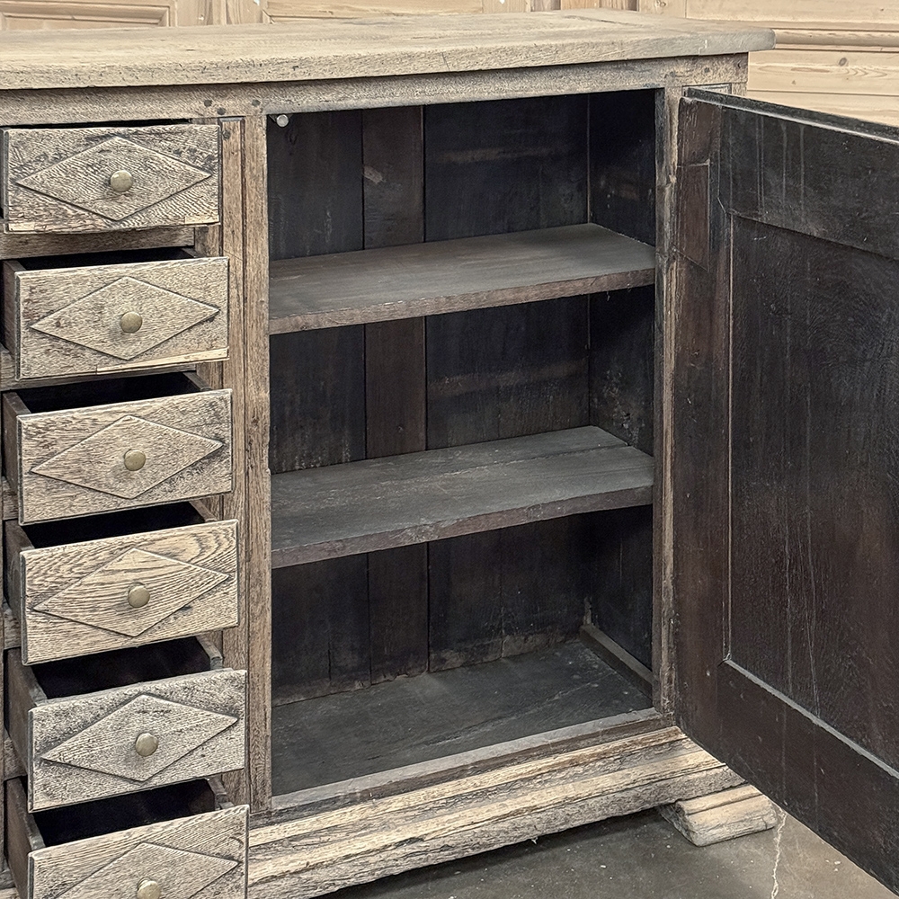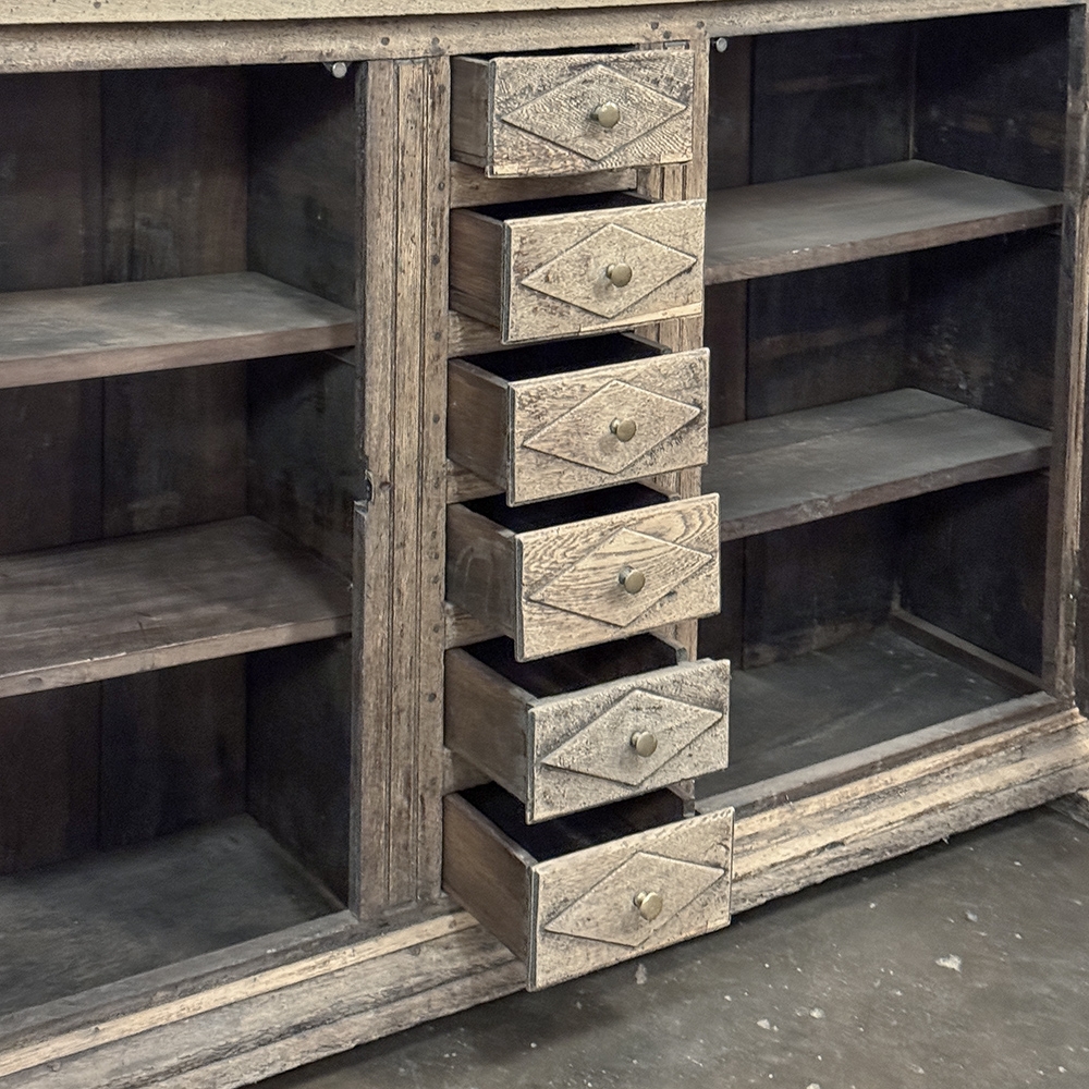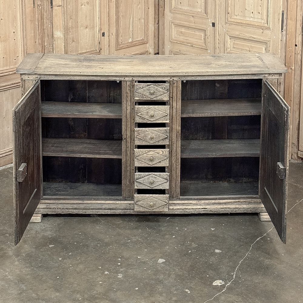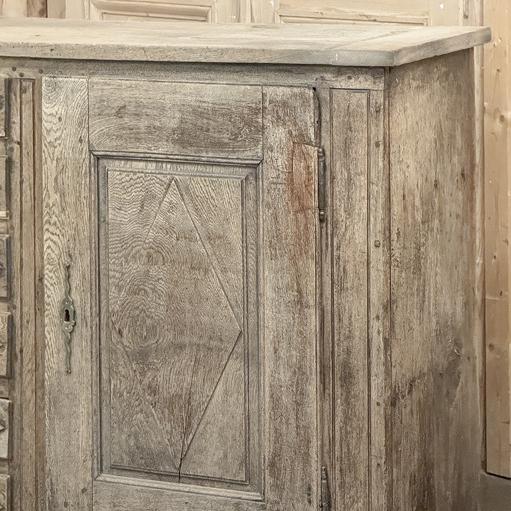 18th Century Rustic Dutch Buffet ~ Cabinet in Stripped Oak is a timeless example of functionality and utility, with a visual allure only enhanced by the time-honored craftsmanship and sheer natural beauty of the old-growth wood, revealed in all its splendor by our proprietary stripping process. Thick planks of oak make up the entire casework, from the top to the feet, and even on the hand-hewn planks that form the back side. Two full-height cabinets flank a center section of six drawers, with shelves inside the cabinets allowing one to organize and store to your heart's delight! Subtle diamond forms are raised up on each drawer and cabinet door for added appeal, with turned knobs all around for easy access.