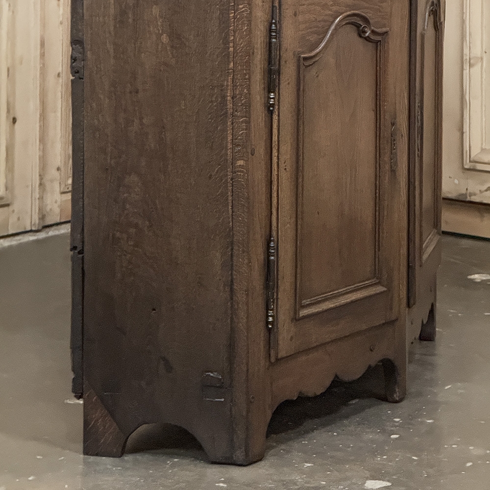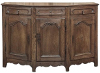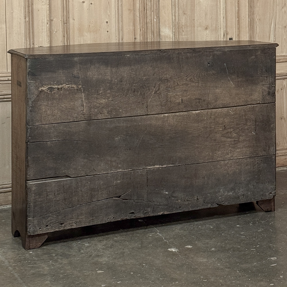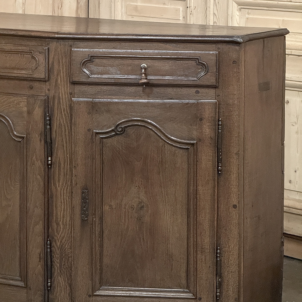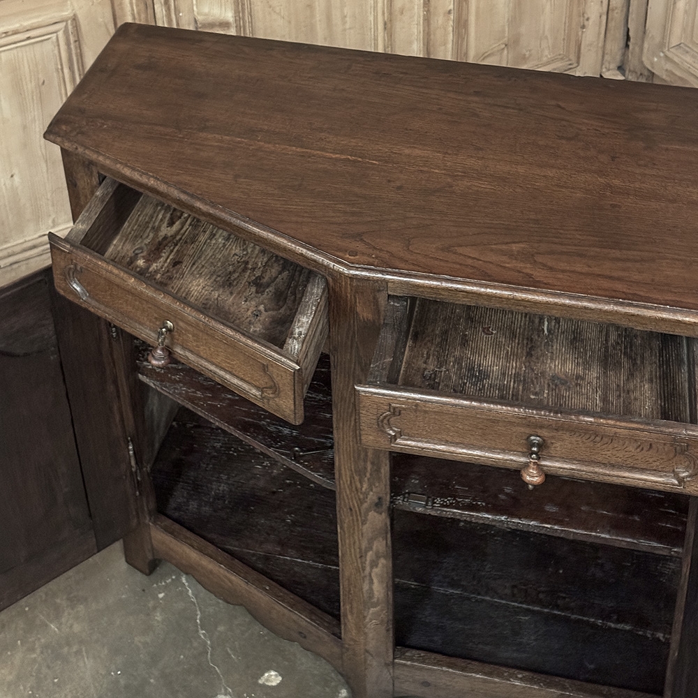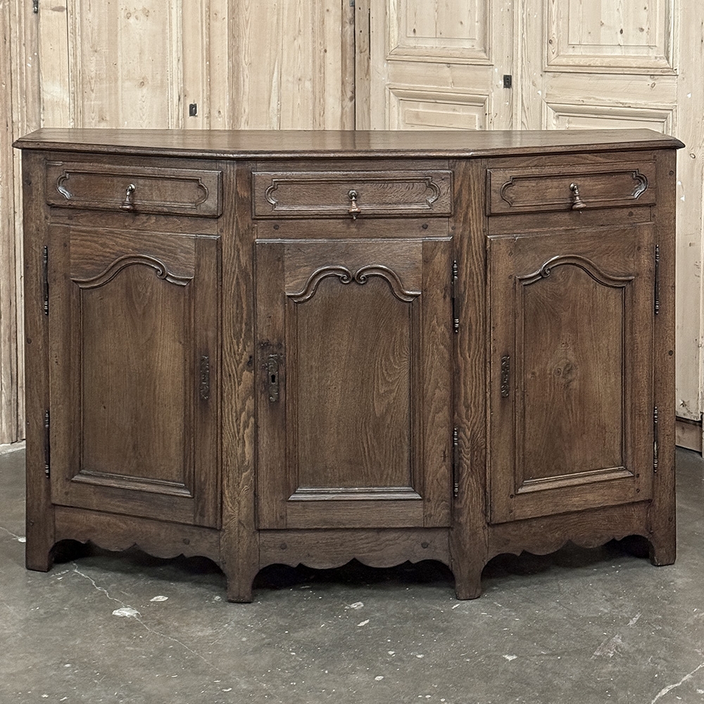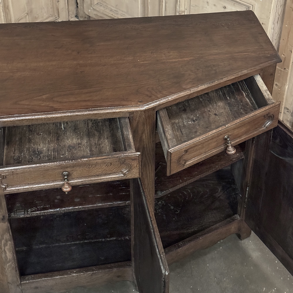 18th Century Rustic Tuscan Buffet from Northern Italy displays the unique style typical to the region. The center section is deep enough for the larger serving platters, while the sides slant back towards the wall to make the piece more friendly to folks passing through the room. Three yawning cabinet doors open wide on brass barrel hinges to allow unfettered access to the capacious interior, while the three drawers provide lots of utility space above. The side drawers are cut to the same angle as the casework, a task requiring a very skilled cabinetmaker. Brass and turned wood knobs add a nice touch, as do the brass key guards on the cabinet doors. A simply scrolled apron with pediment feet completes the look. Rendered from solid old-growth oak and sycamore to last for centuries!