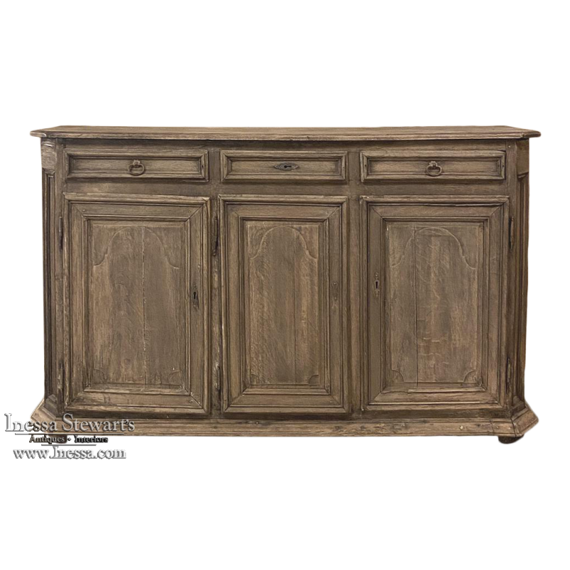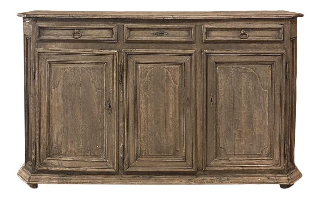 18th Century Tuscan walnut Buffet displays the essence of the country furniture from the storied rural region in today's Italy. Hand-crafted from indigenous walnut, it features tailored panels with fine molded detail, combined with capacious storage and a generous serving surface. The natural beauty of the wood has been enhanced with our proprietary non-toxic stripping process that retains the patina as well. Bold molding defines the drawers and cabinets, with mitered corners featuring recessed panels to soften up the edges. Note the hand-forged iron hinges, key guards and drawer bale pulls!