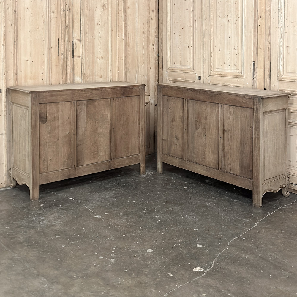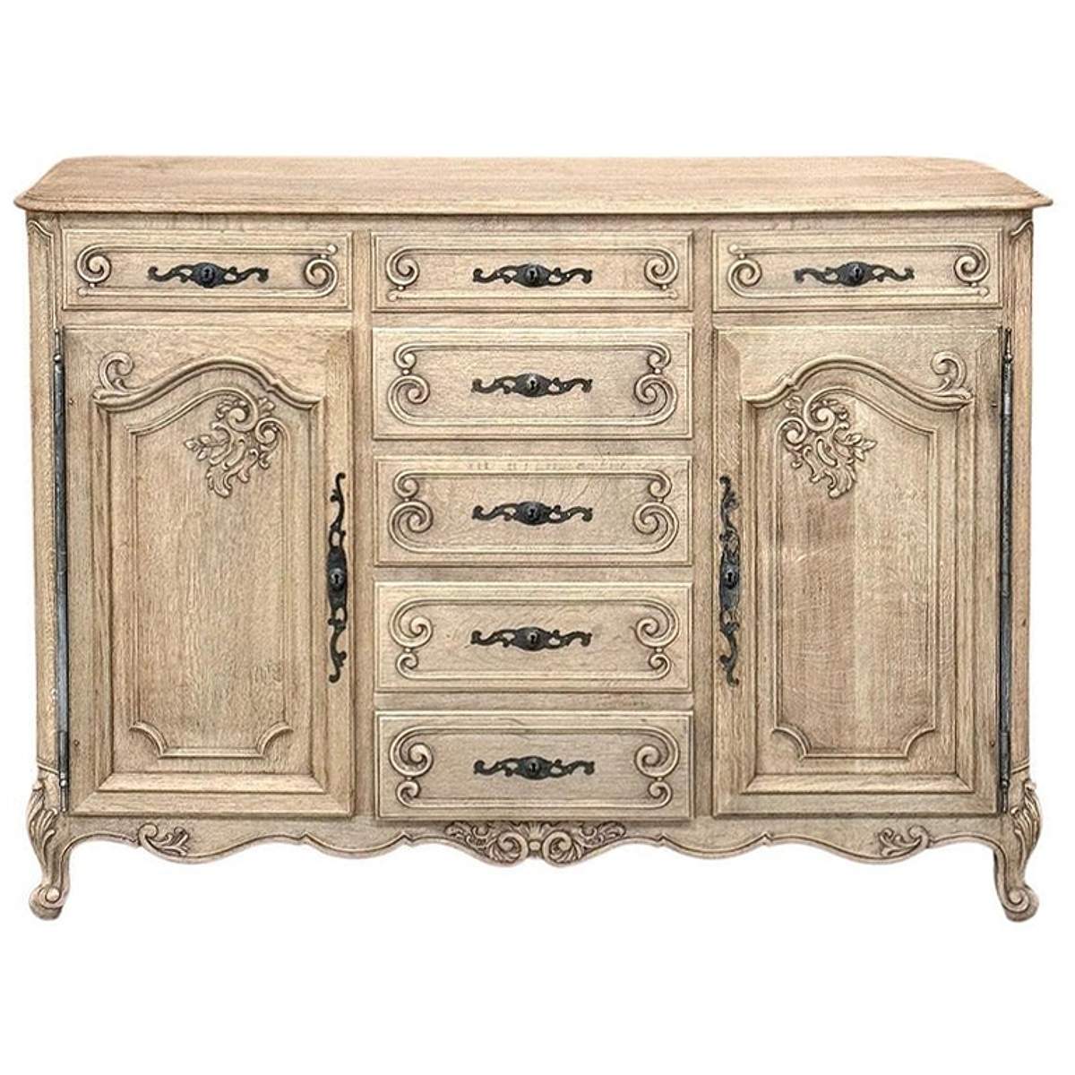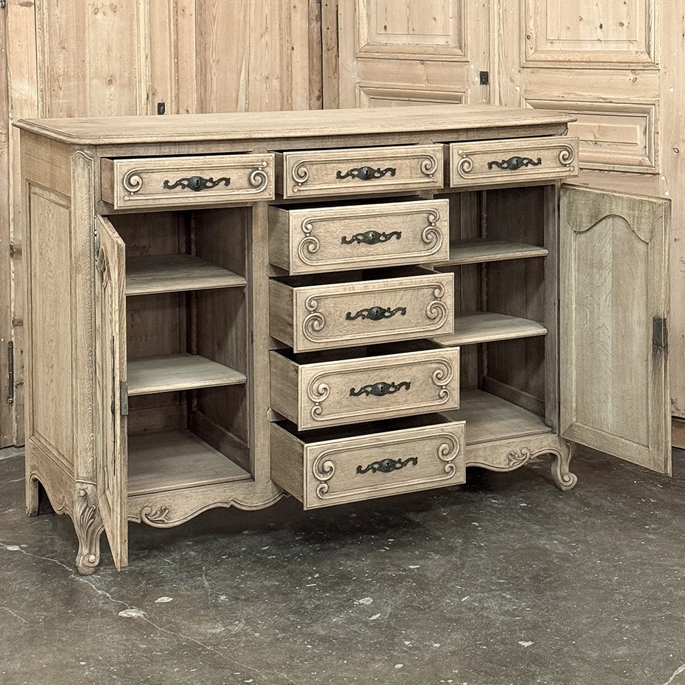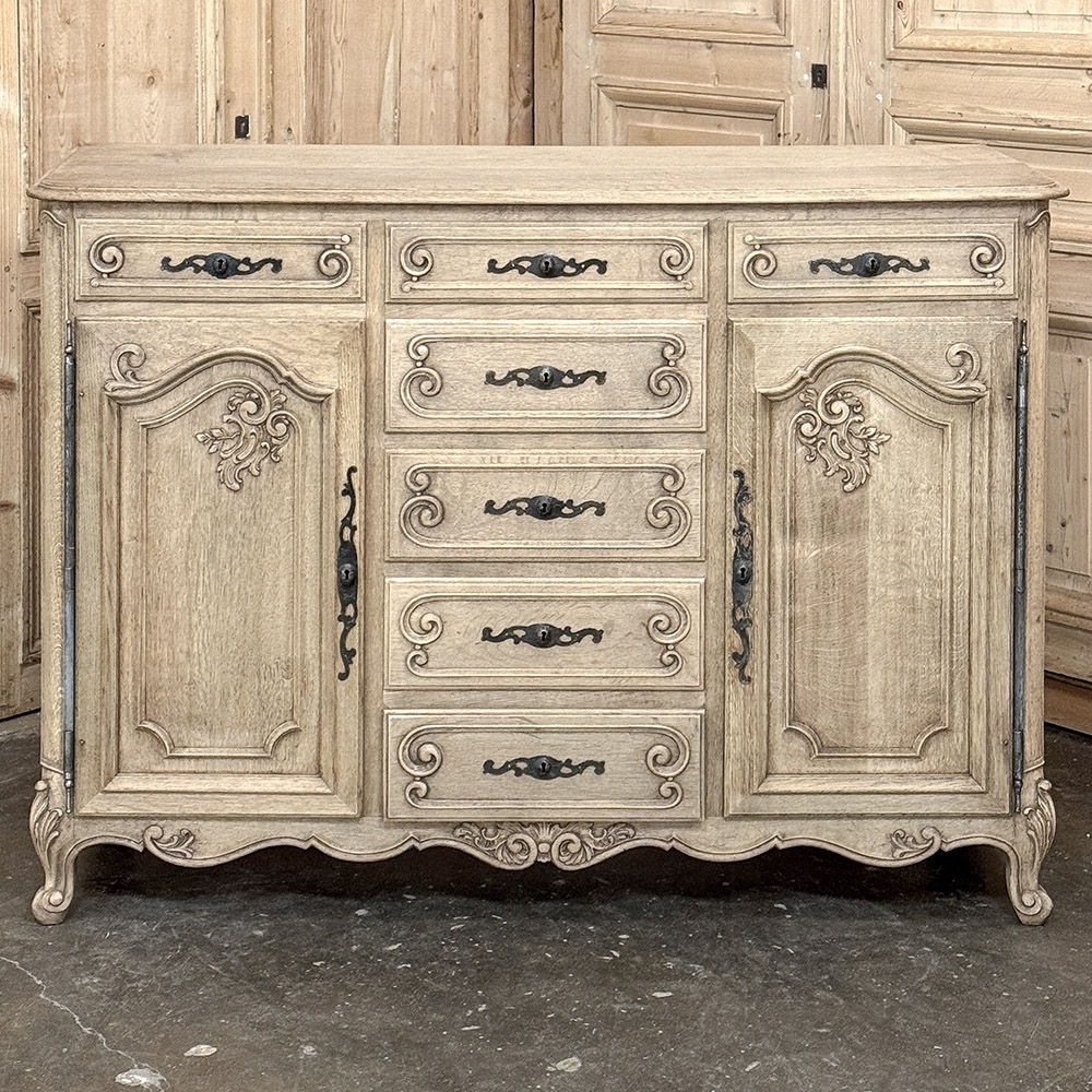 19th Century Country French Buffet in Stripped Oak is ideal for enhancing a casual decor. Featuring two spacious cabinets and no less than seven drawers, it can be used in any room for any purpose. Crafted from dense, old-growth oak, it features a solid plank top with tailored casework enhanced by carved detail across the facade and an undulating apron with scrolled legs and foliate carvings. Each drawer is embellished with scrolled molding, and each cabinet door with mirror image contoured framework embellished with stylized foliate motifs. Each cabinet door and drawer is also fitted with its original scrolled steel key guard, and doors are hung with steel barrel hinges with upper & lower finials still intact ~ rare for pieces of this age. Painstakingly stripped using our proprietary process that retains the patina and sheer natural beauty of the old wood, all performed by our expert in-house staff.