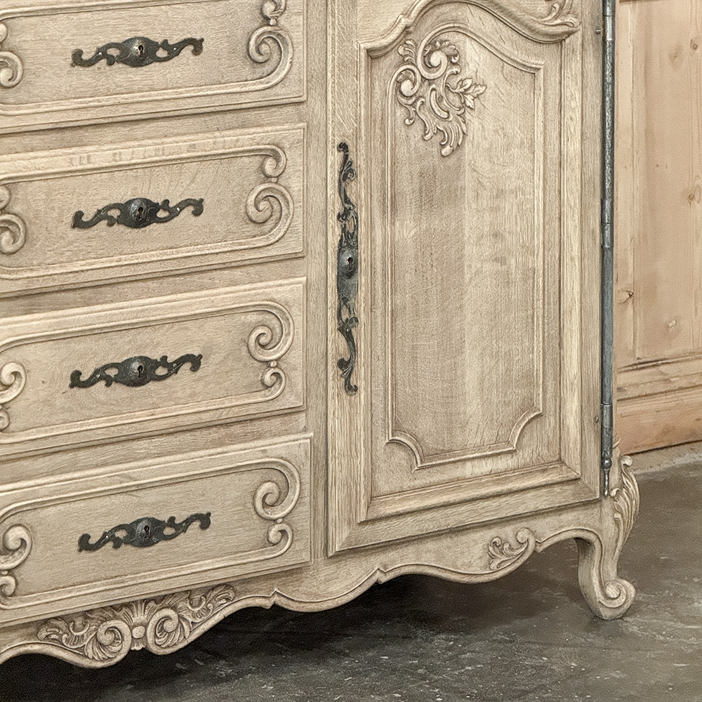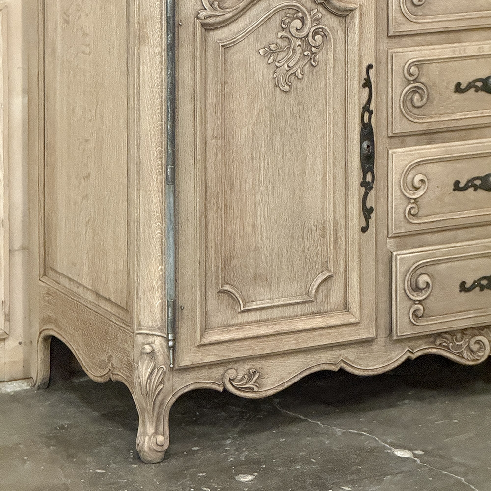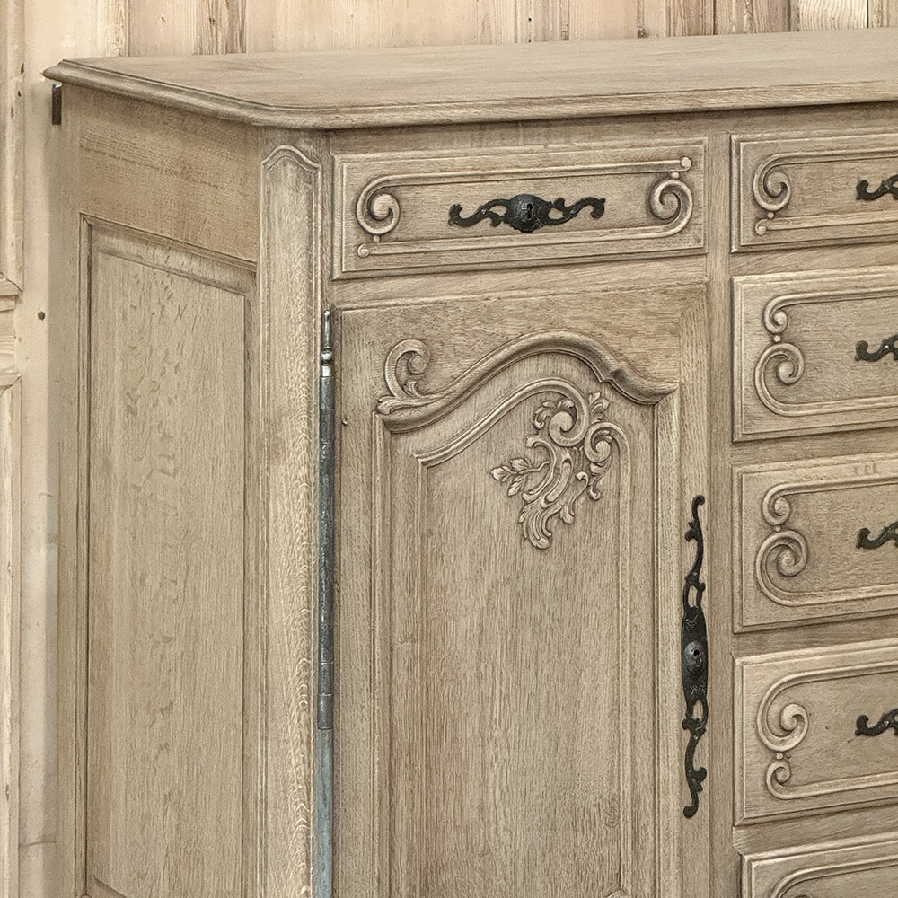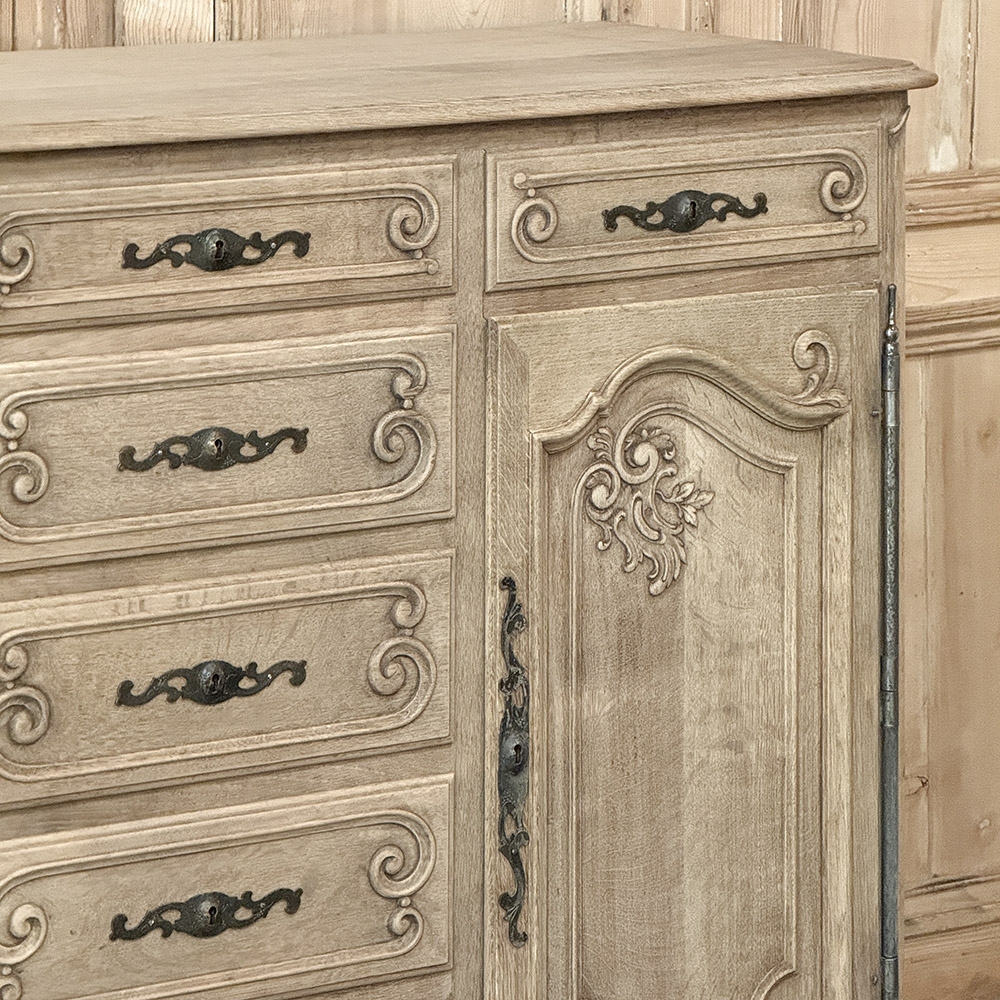 19th Century Country French Buffet in Stripped Oak is ideal for enhancing a casual decor. Featuring two spacious cabinets and no less than seven drawers, it can be used in any room for any purpose. Crafted from dense, old-growth oak, it features a solid plank top with tailored casework enhanced by carved detail across the facade and an undulating apron with scrolled legs and foliate carvings. Each drawer is embellished with scrolled molding, and each cabinet door with mirror image contoured framework embellished with stylized foliate motifs. Each cabinet door and drawer is also fitted with its original scrolled steel key guard, and doors are hung with steel barrel hinges with upper & lower finials still intact ~ rare for pieces of this age. Painstakingly stripped using our proprietary process that retains the patina and sheer natural beauty of the old wood, all performed by our expert in-house staff.